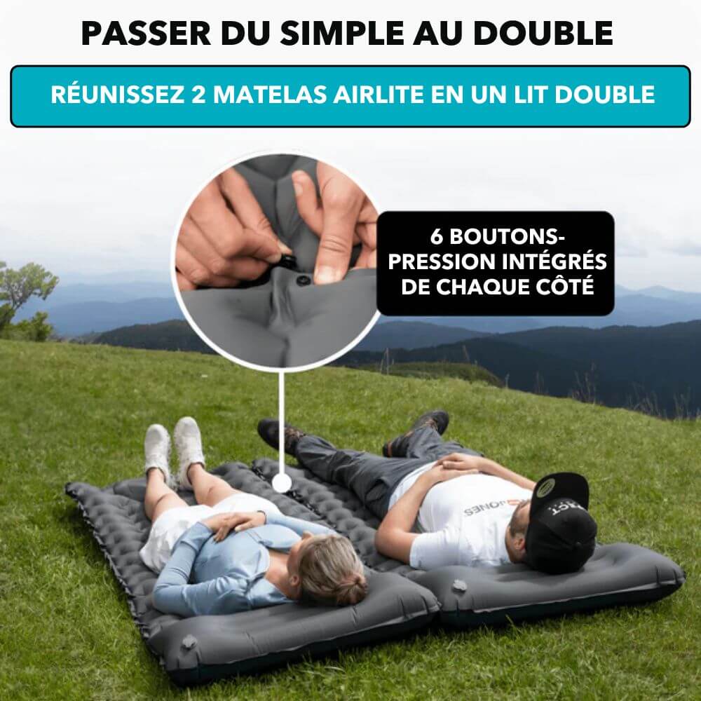 Avec des boutons-pression ingénieux sur les côtés, relier deux matelas AirLite devient un jeu d’enfant, vous permettant de créer un lit double douillet. Que vous voyagiez seul ou en duo, notre matelas AirLite s’adapte aisément à toutes vos envies.