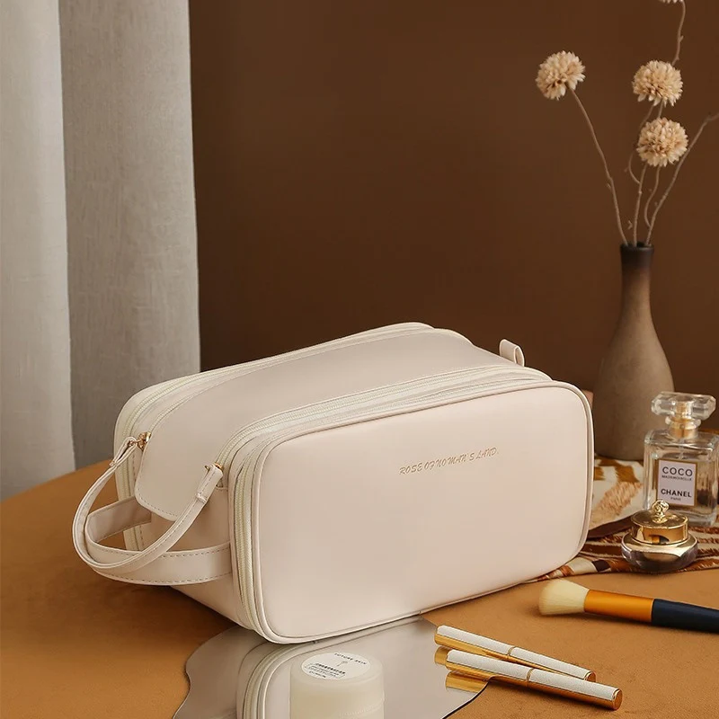 Cette trousse de maquillage de grande capacité est conçue pour les personnes qui aiment avoir tout leur nécessaire de beauté bien organisé. Grâce à son design en forme de U et sa fermeture éclair double, accéder à vos produits de soin et de maquillage devient un jeu d’enfant. Fabriquée en cuir PU résistant, elle allie à la fois style et durabilité, vous permettant d’emporter vos essentiels où que vous soyez.