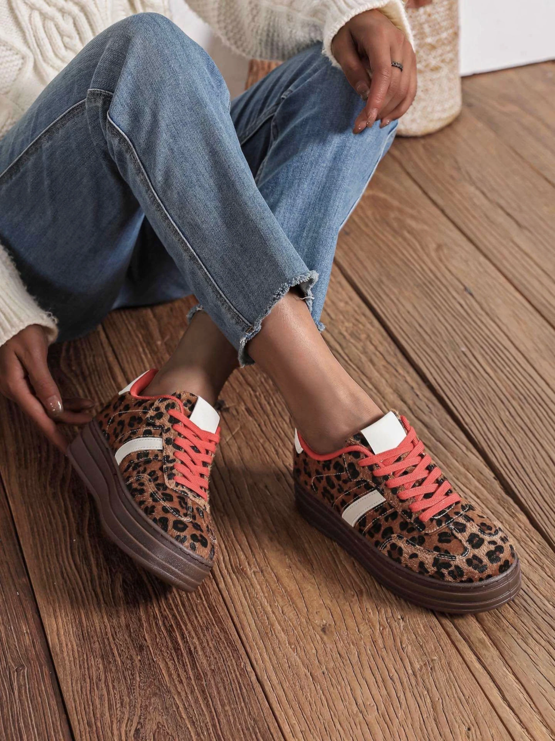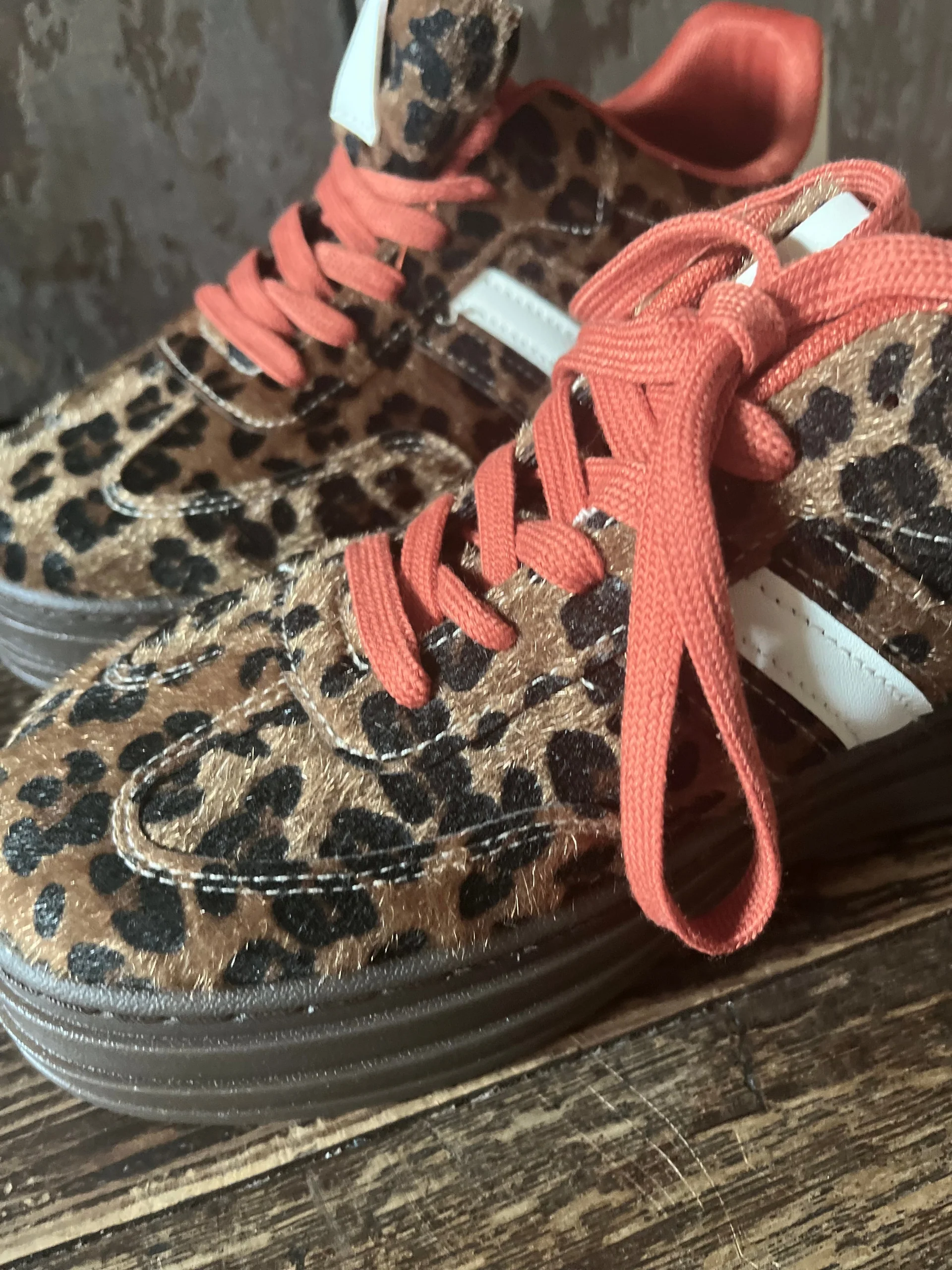 Basket leopard avec details et lacets couleur brique. Effet poils ras.