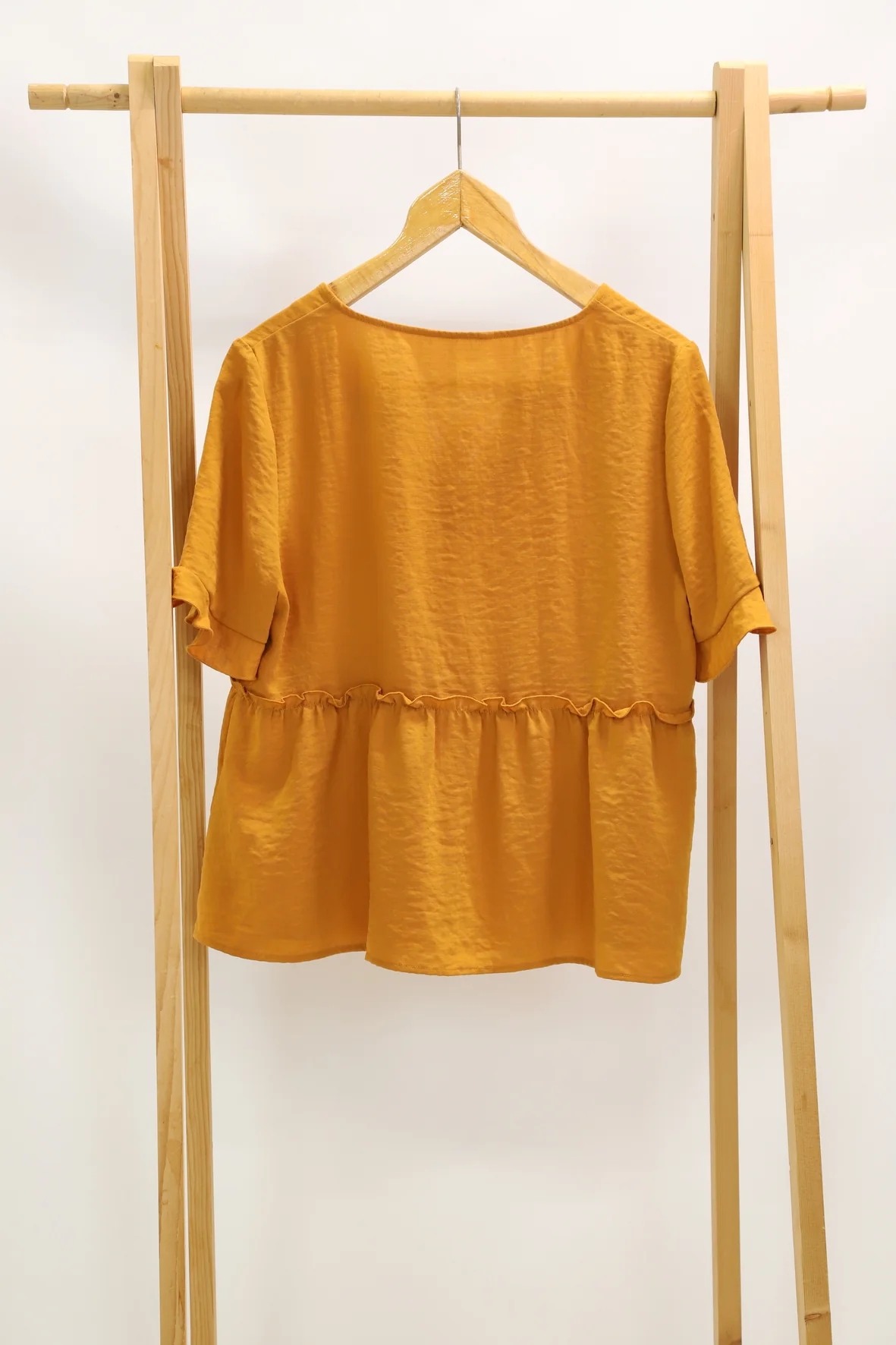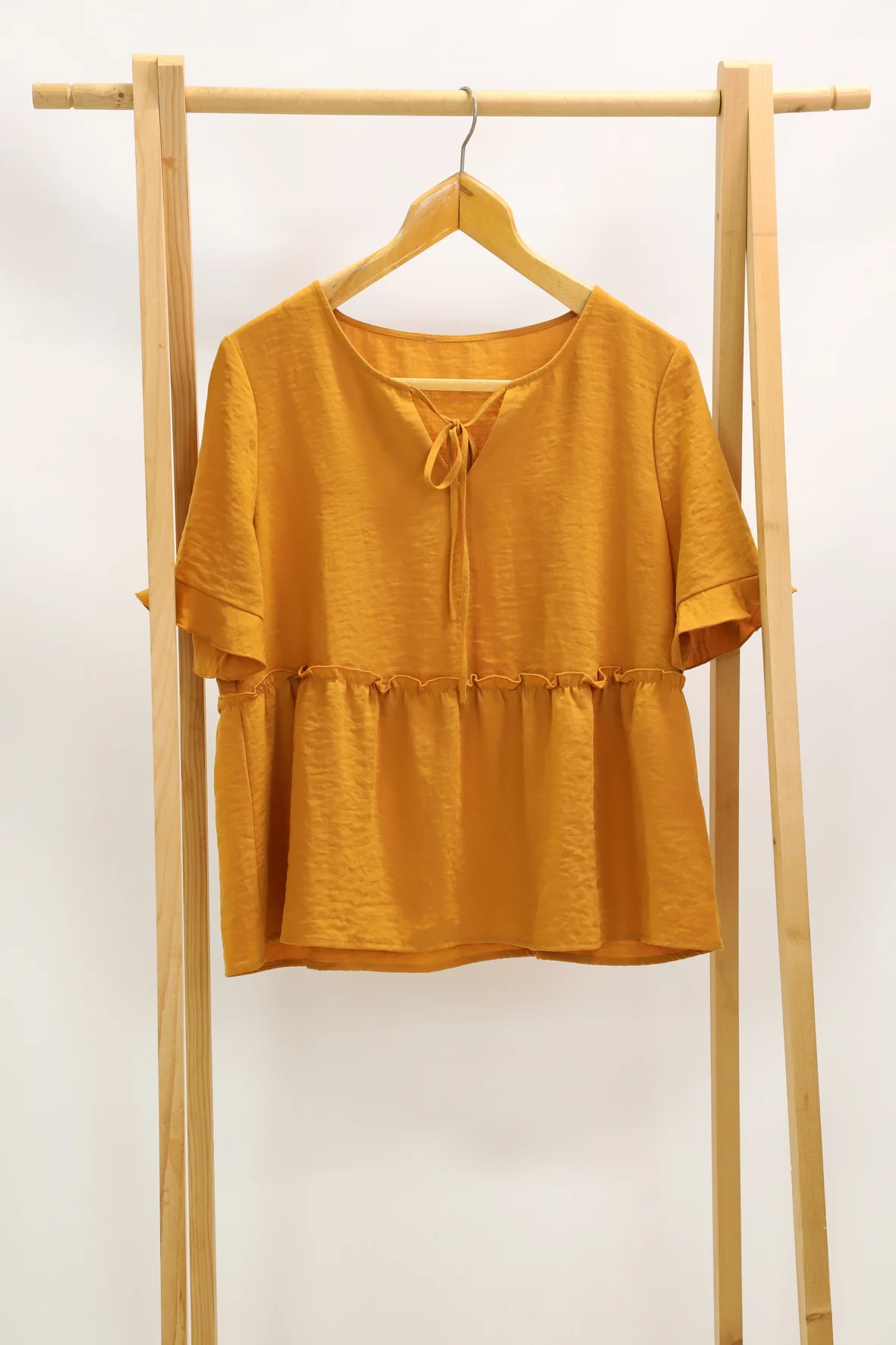 DESCRIPTIF Blouse manches courtes volantées, noeud à nouer sur le devant