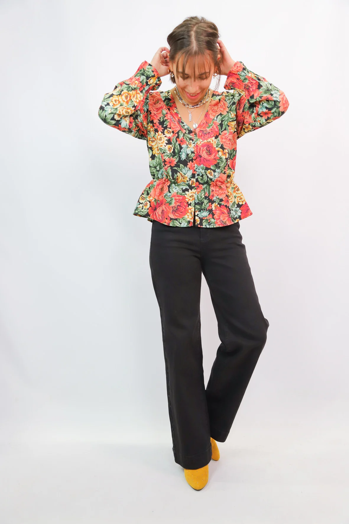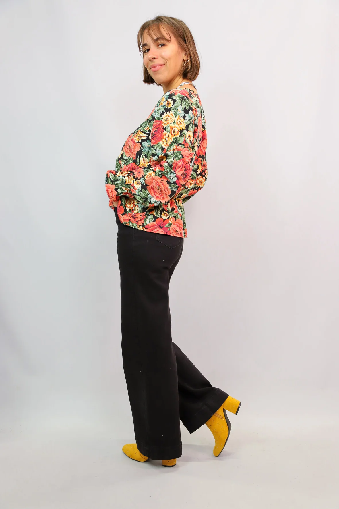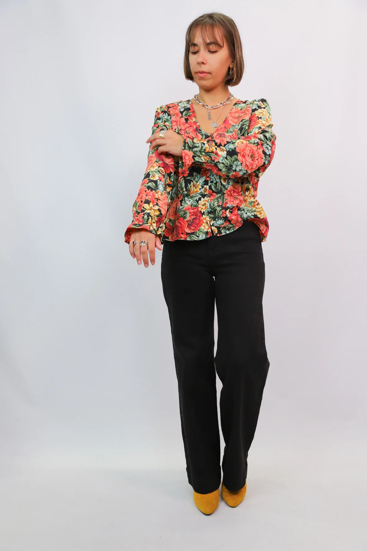 DESCRIPTIF Blouse fleurie. Col V, cintrée et ajustée au poignet