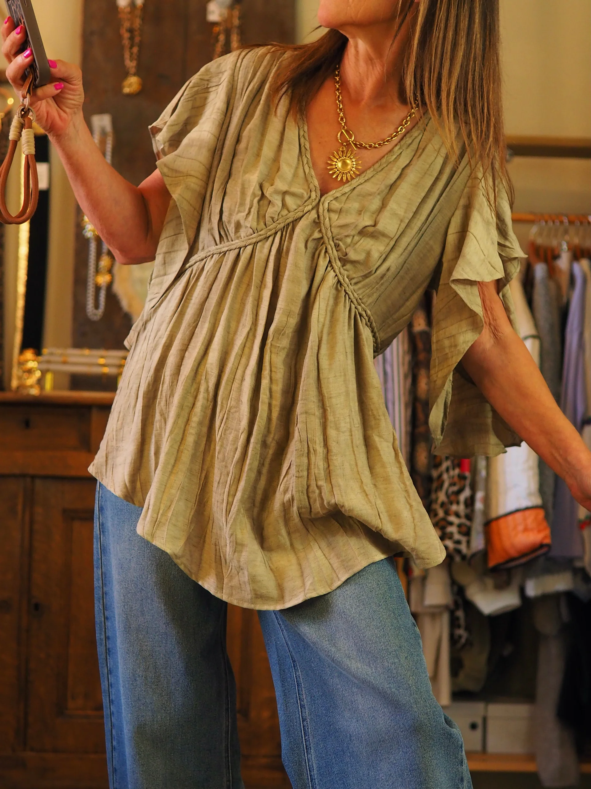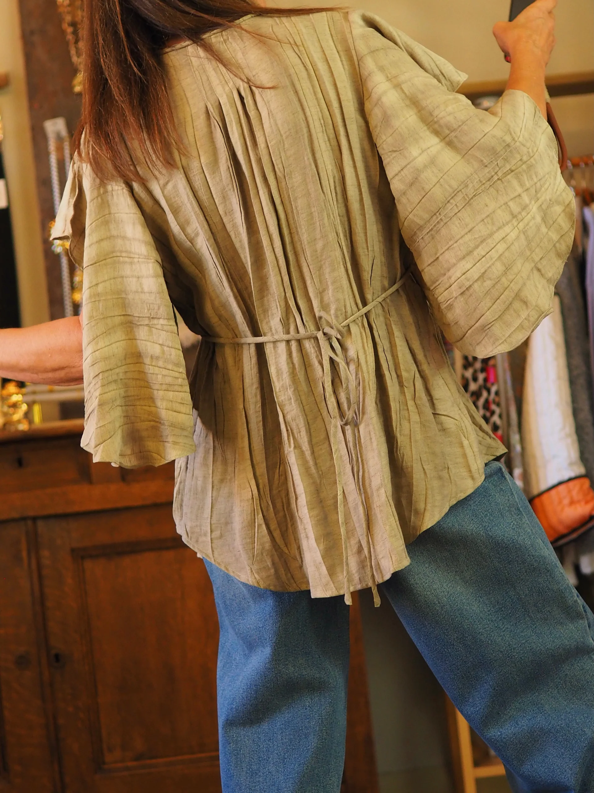 Blouse effet froissé kaki. Manches volants. Resserrable à la taille avec cordon dans le dos.