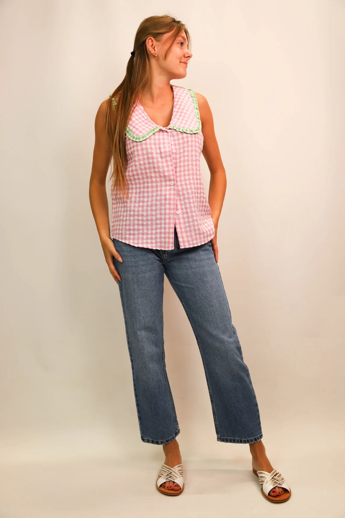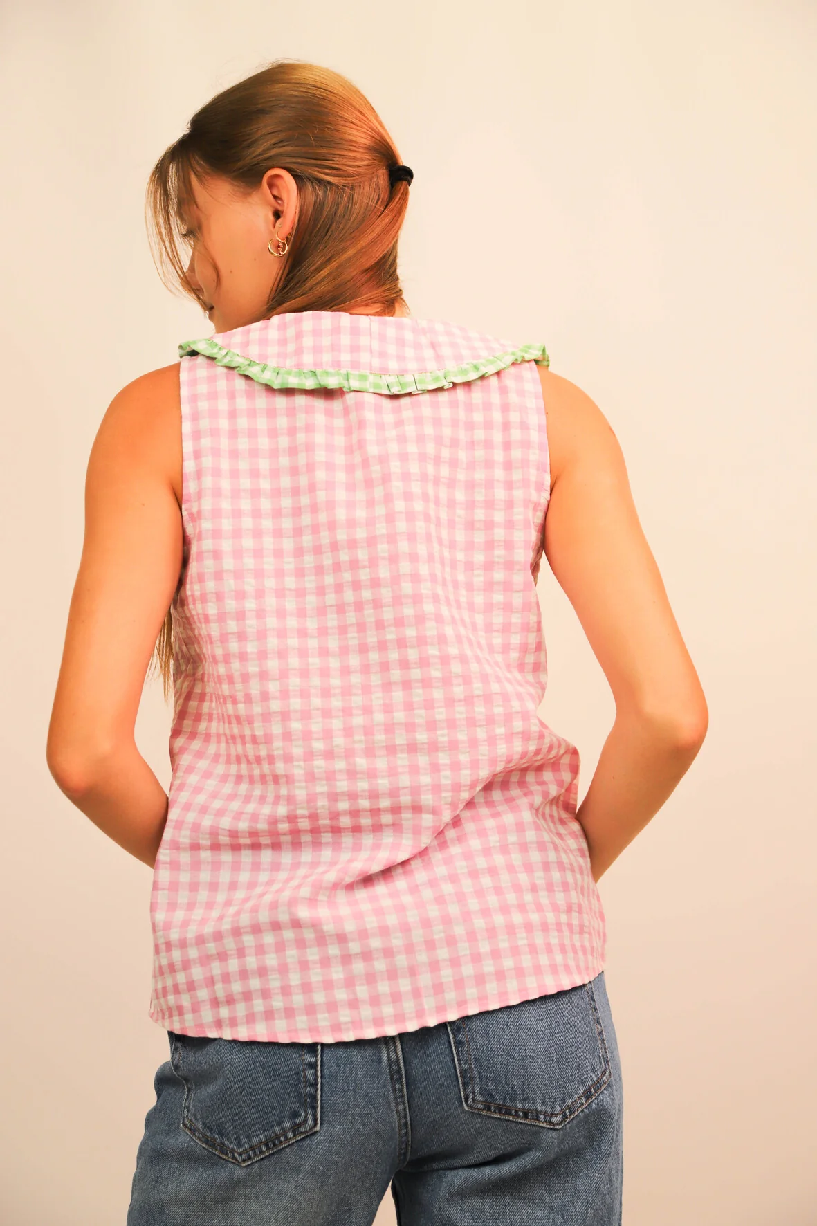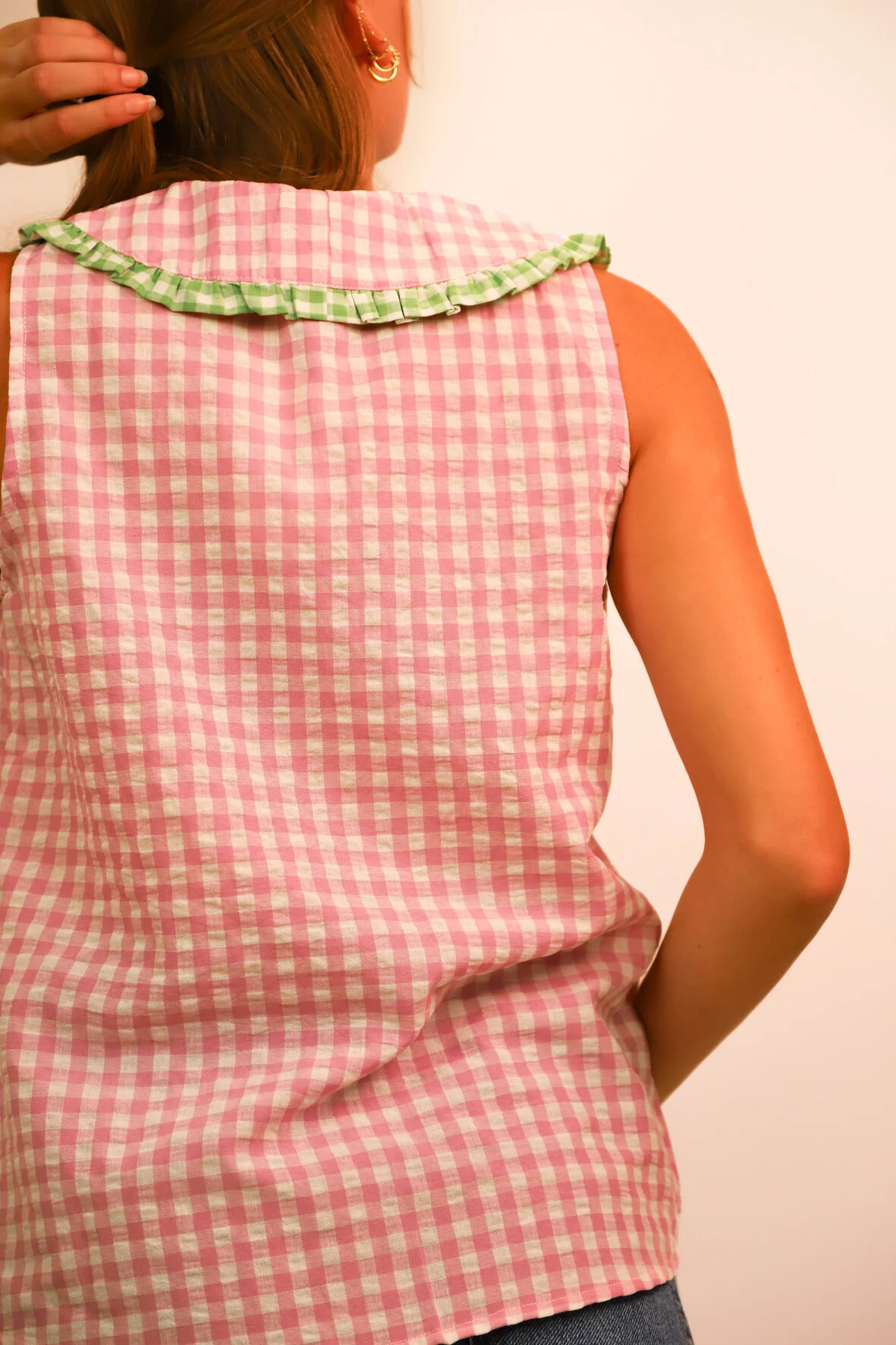 DESCRIPTIF Blouse vichy sans manches. Grand col claudine avec liseret vichy vert