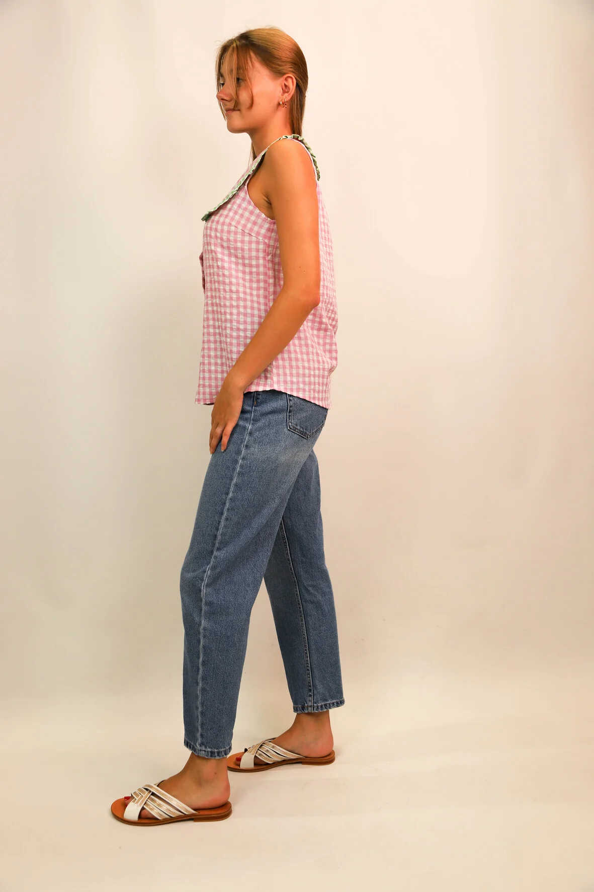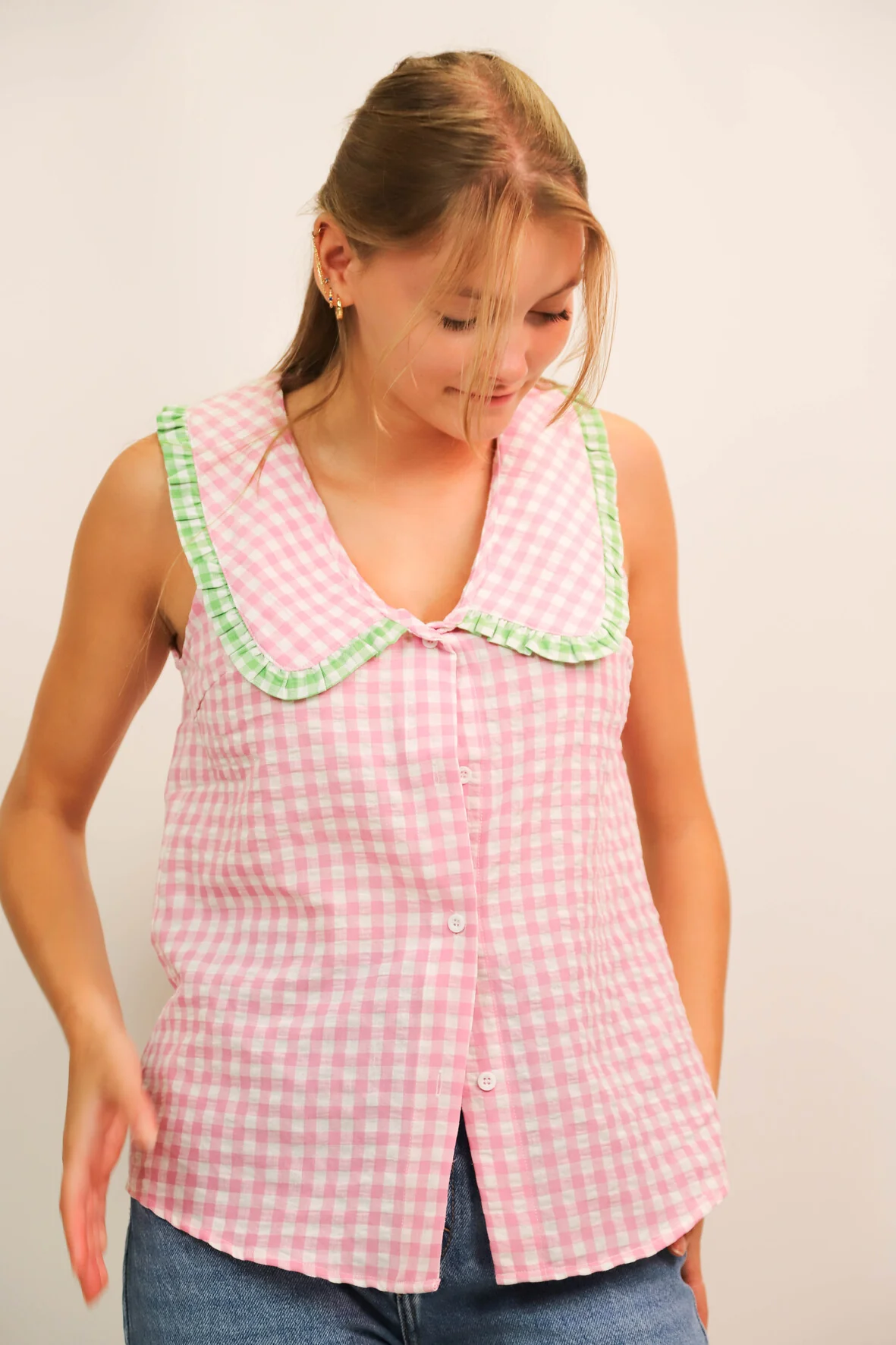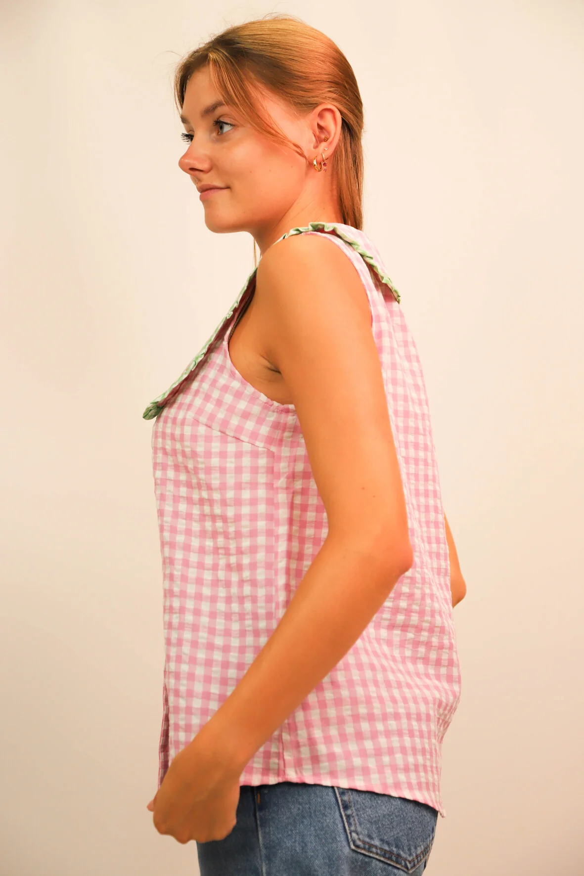 DESCRIPTIF Blouse vichy sans manches. Grand col claudine avec liseret vichy vert
