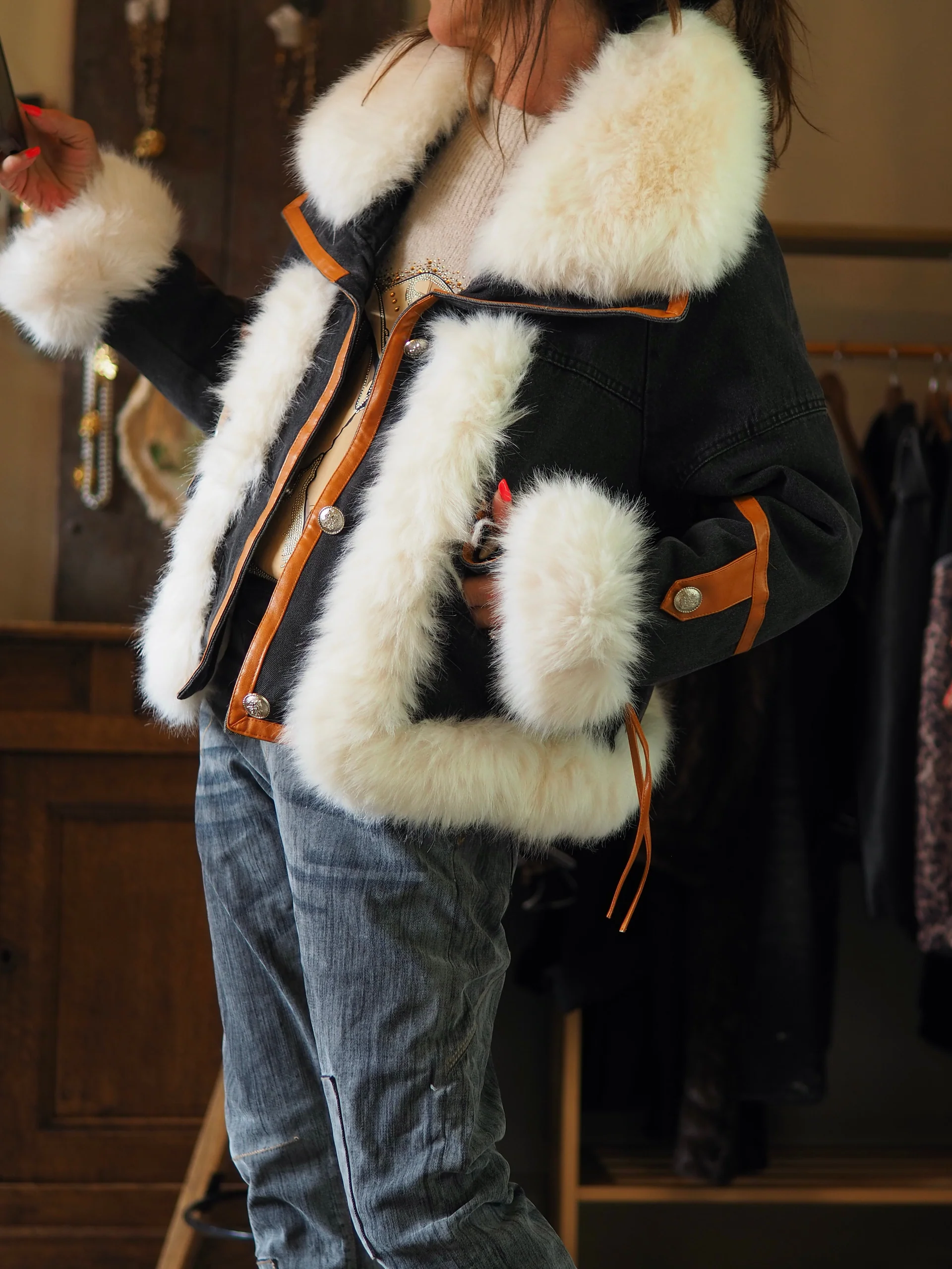 Magnifique blouson jeans anthracite avec fausse fourrure blanche. Doublée.