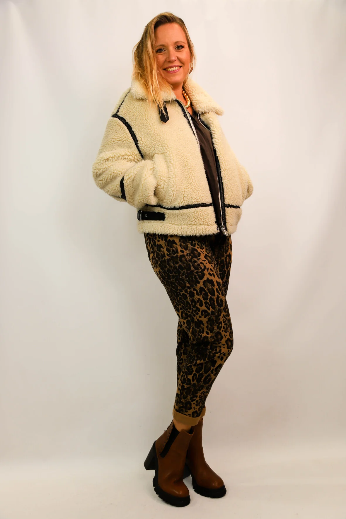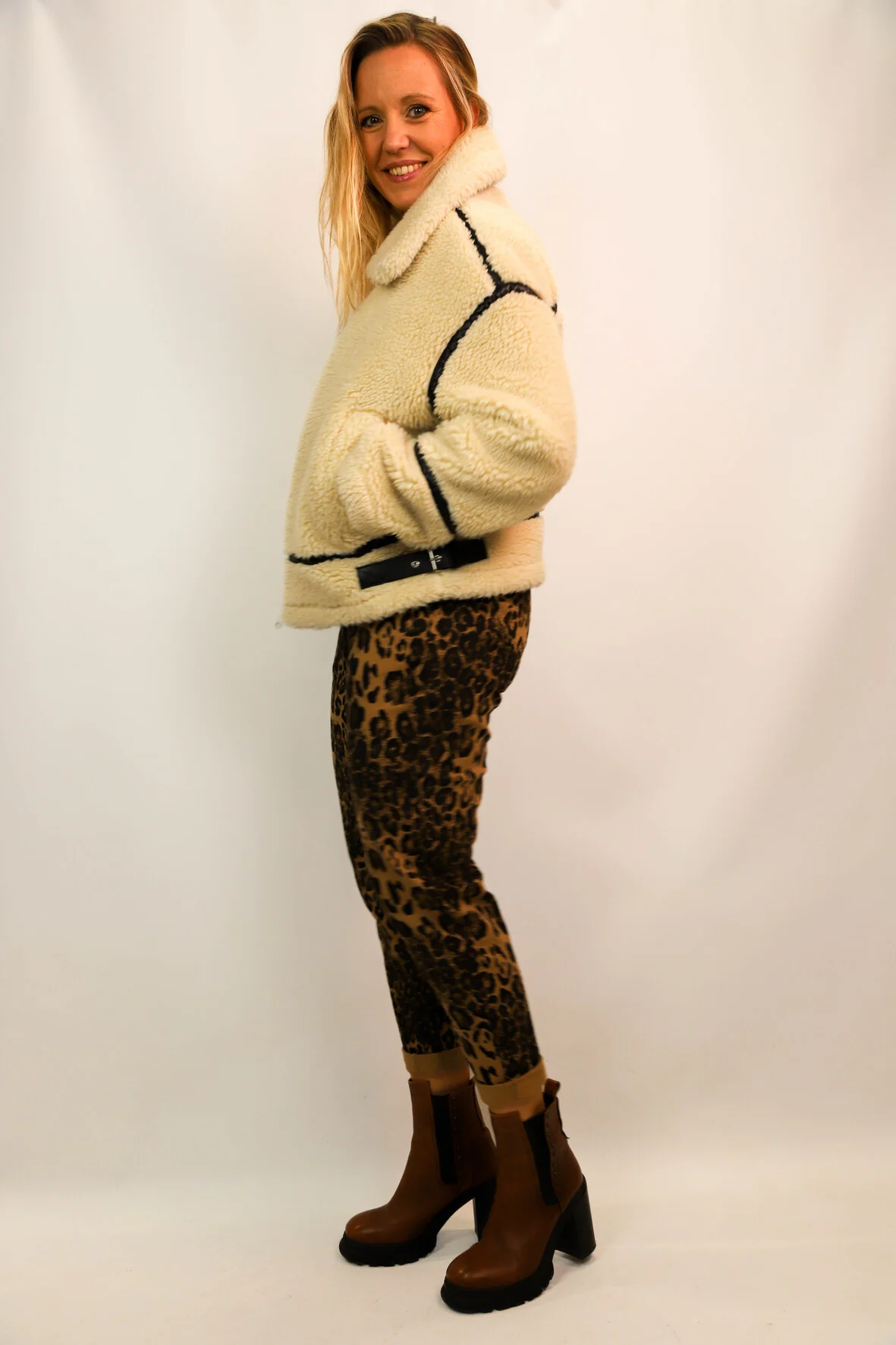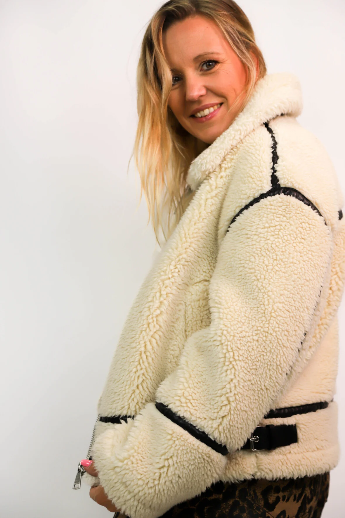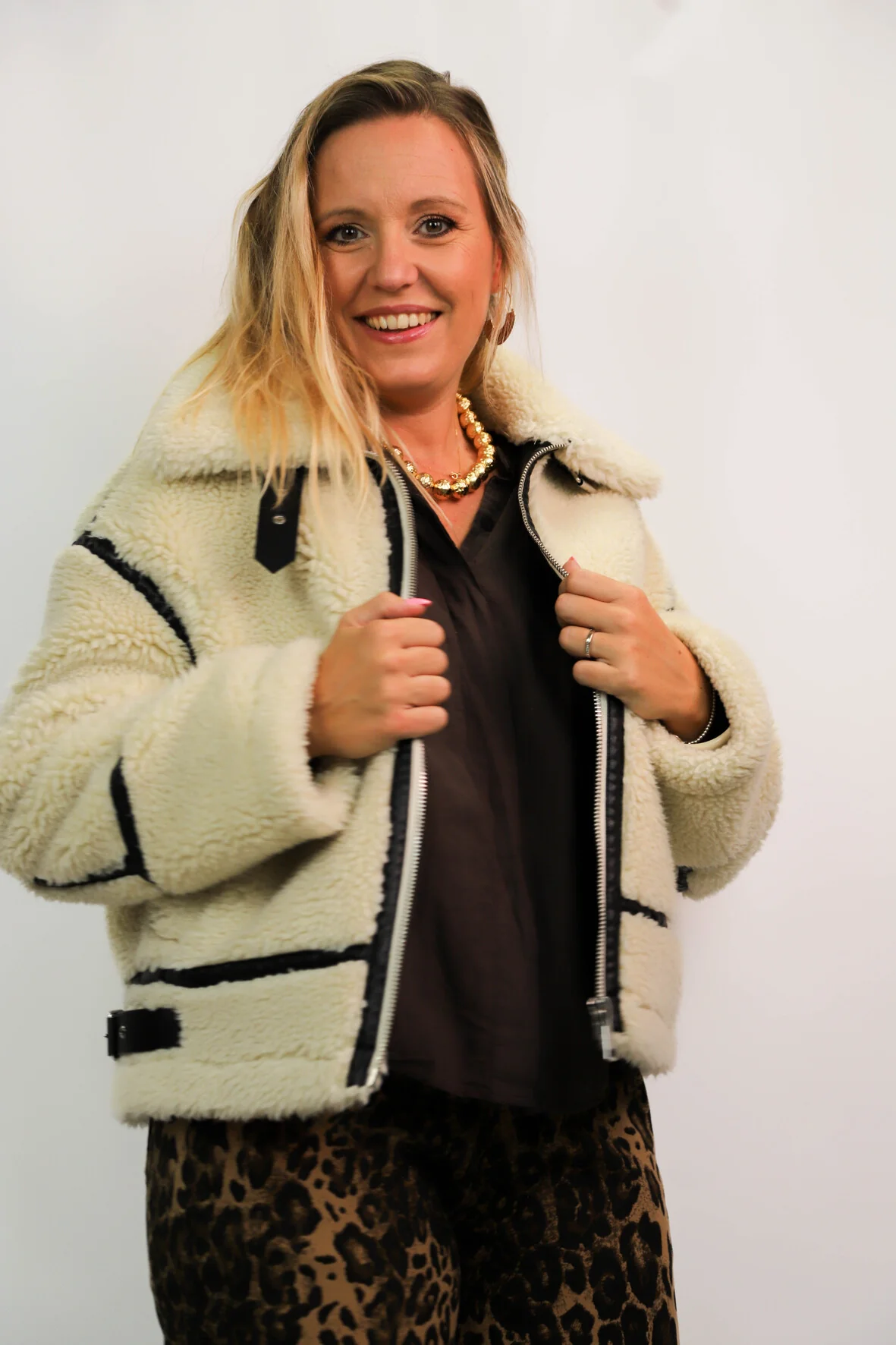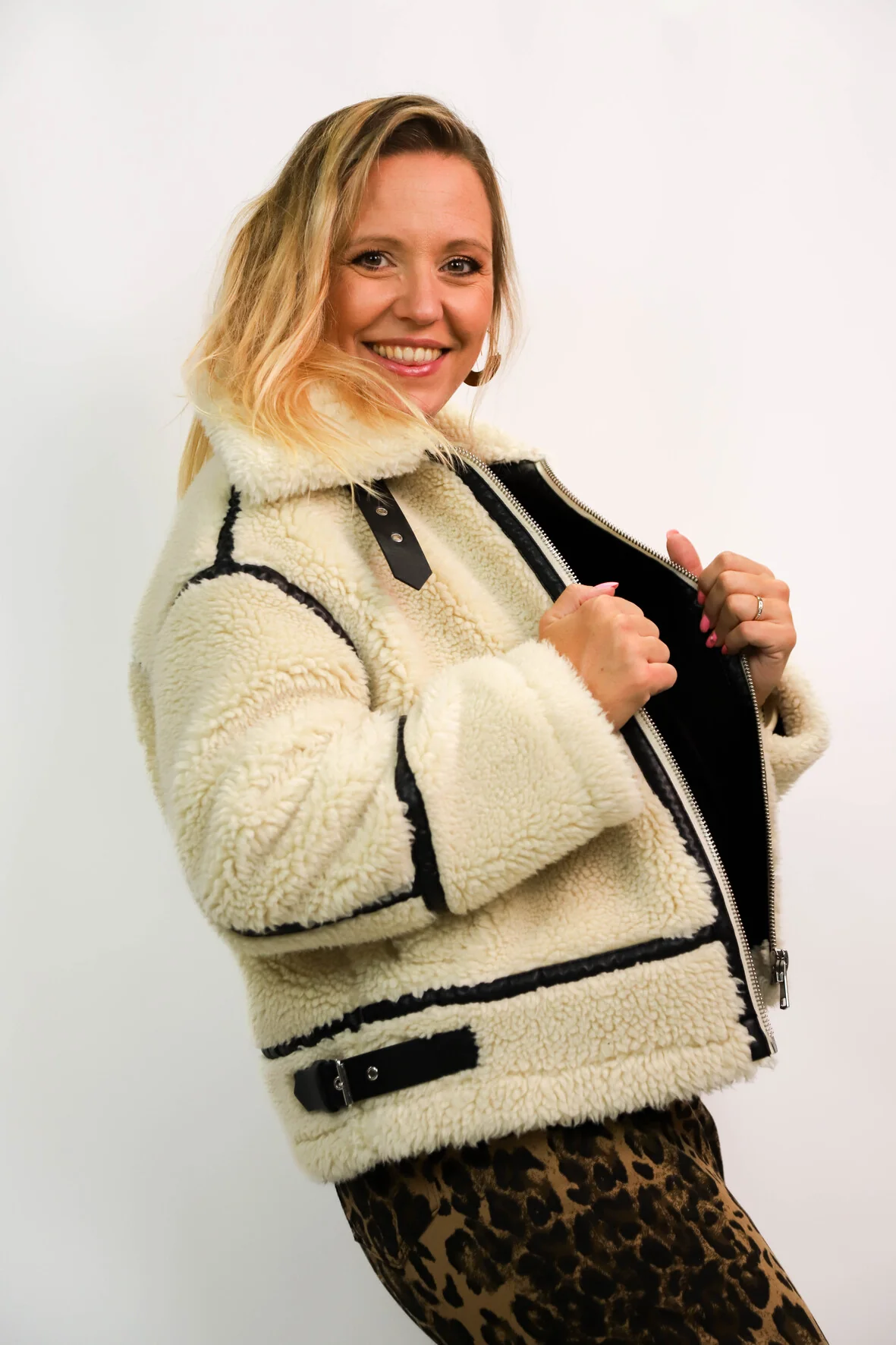 DESCRIPTIF Blouson aviateur en fausse fourrure avec détail en similicuir. Poches latérales