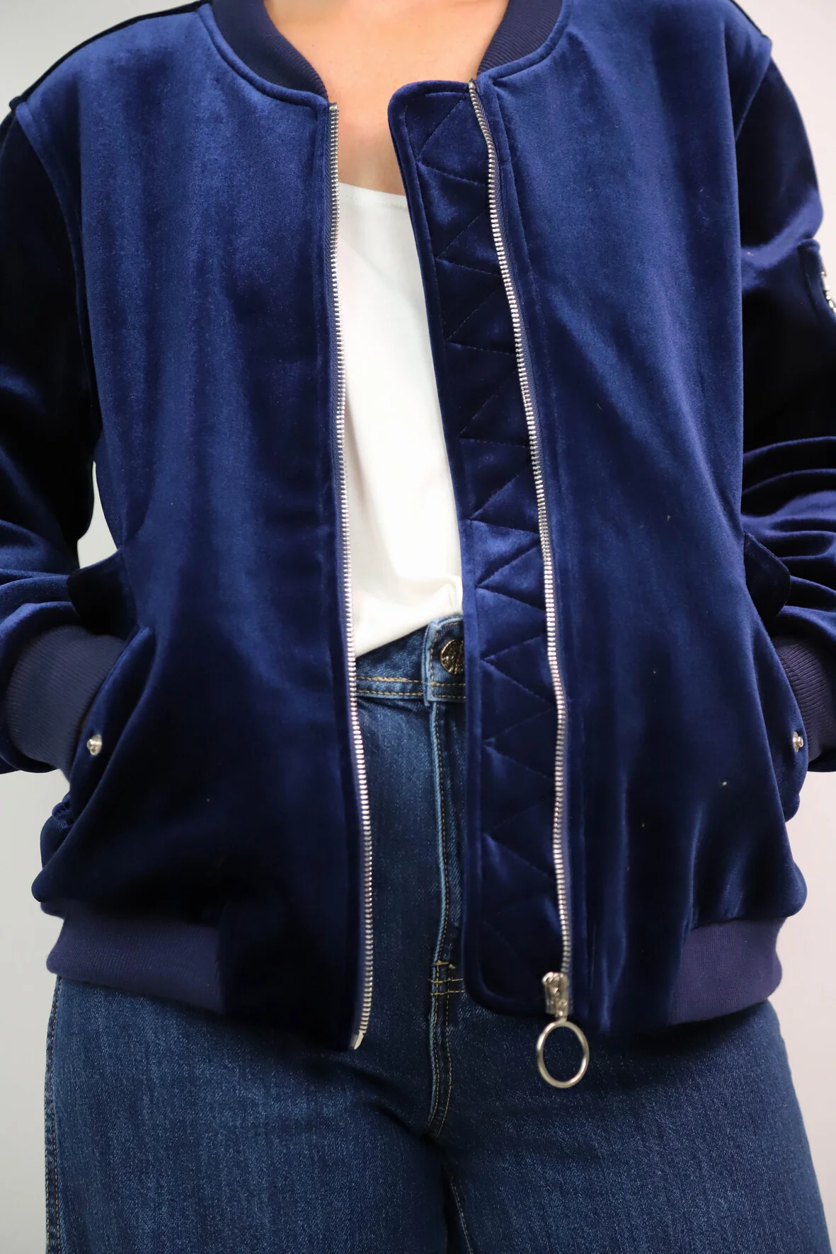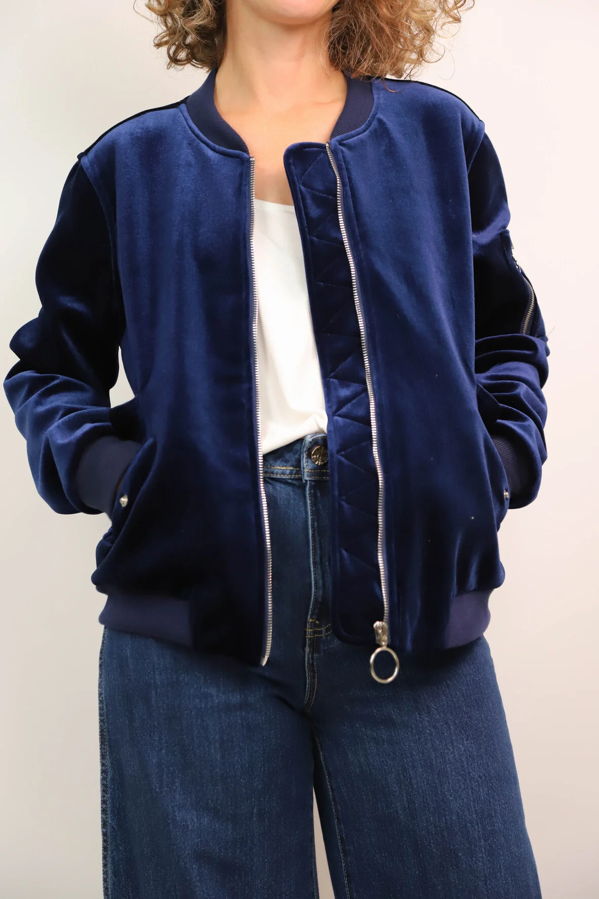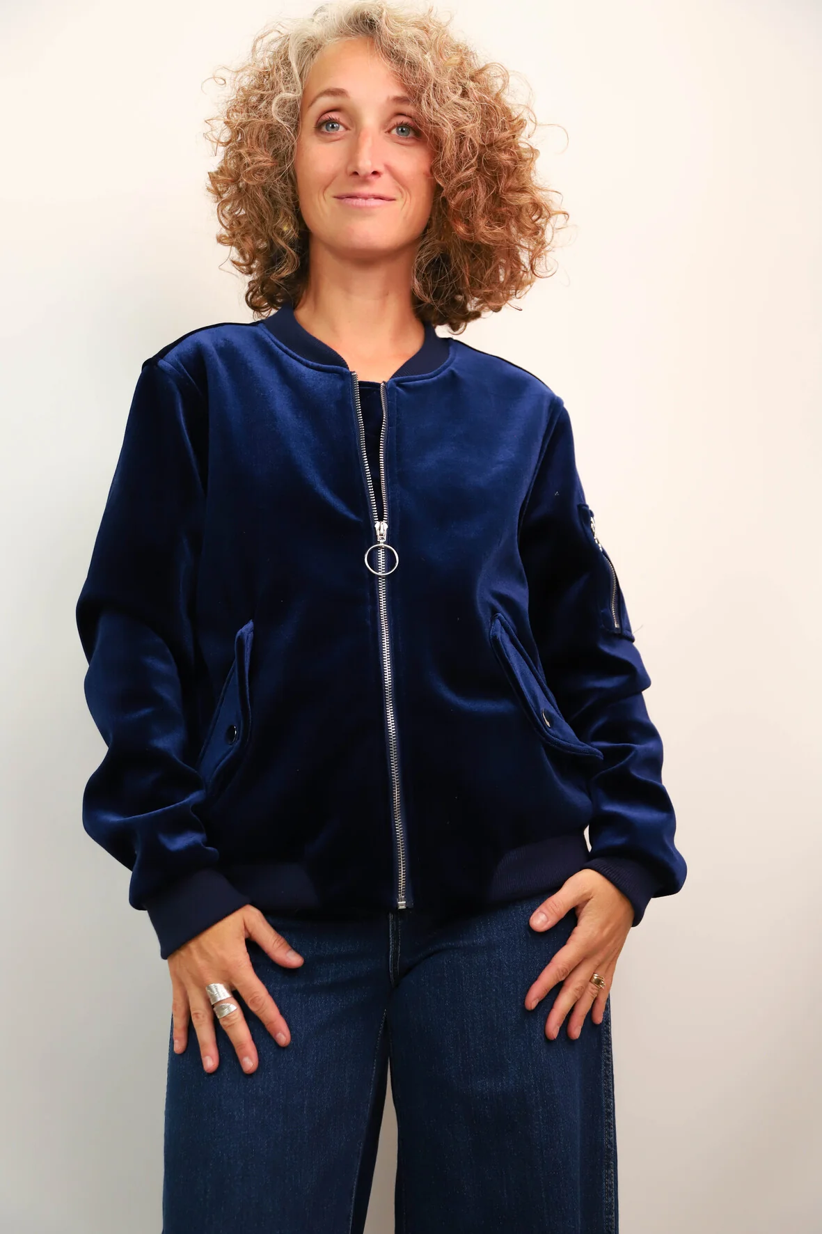 Bombers en velours. Fermeture par zip. Poches latérales avec fermeture par boutons pressions. Poche sur la manche gauche