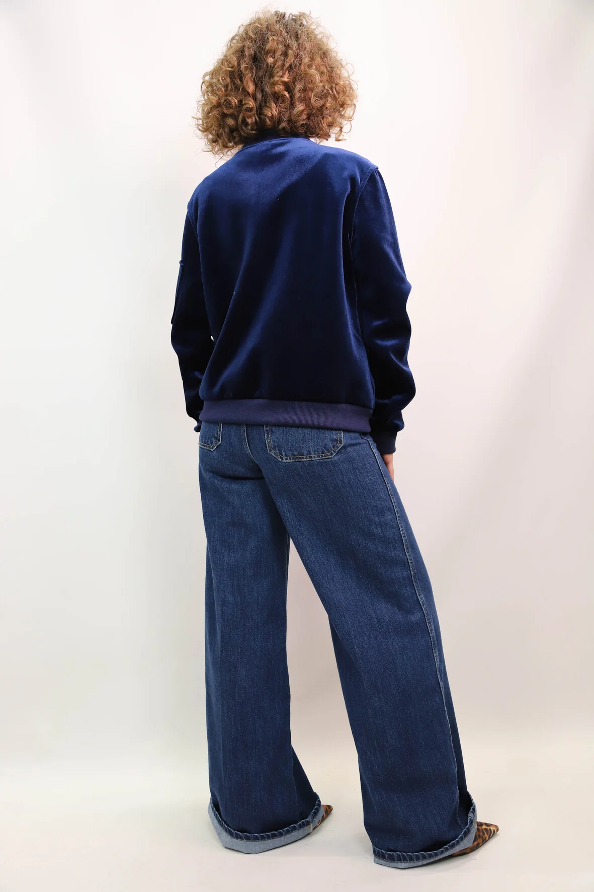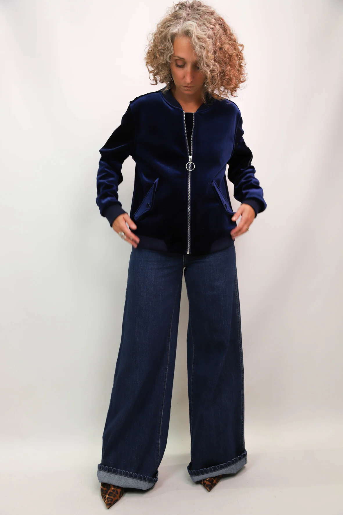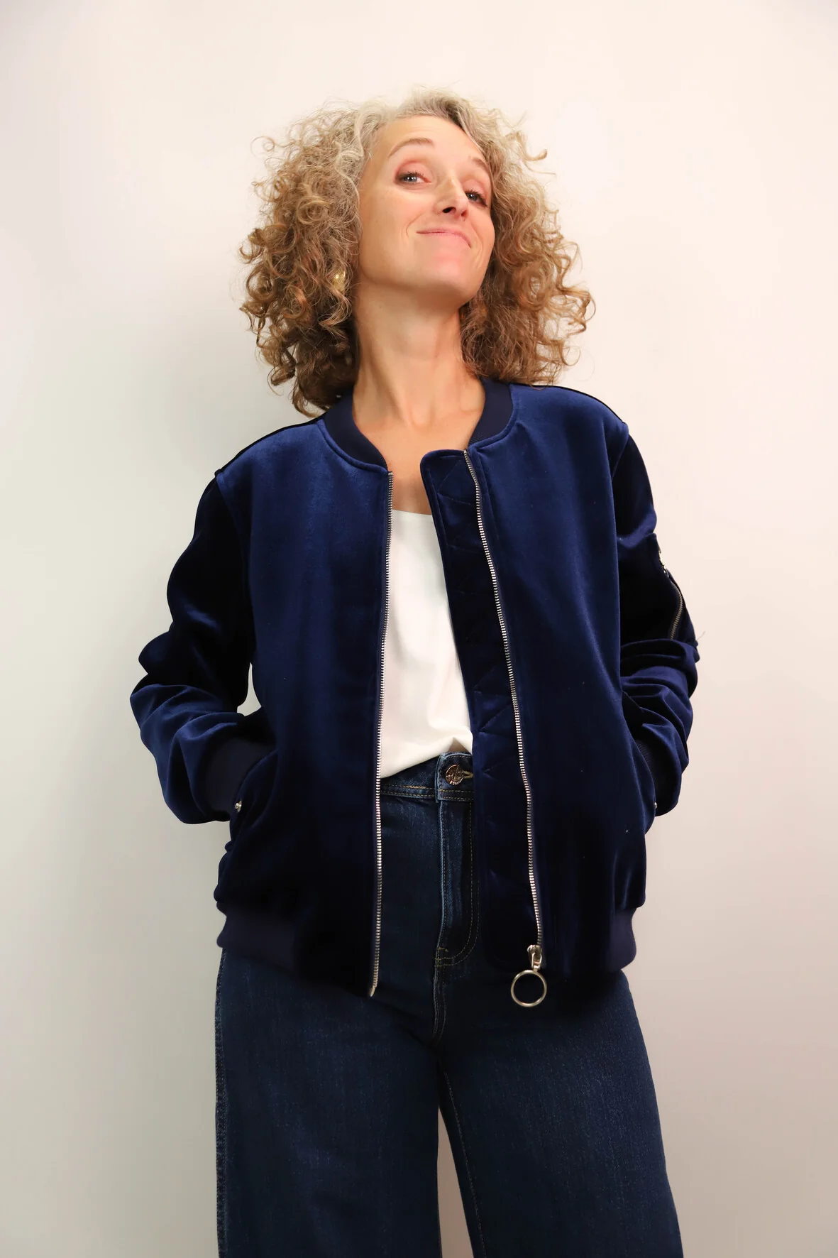 Bombers en velours. Fermeture par zip. Poches latérales avec fermeture par boutons pressions. Poche sur la manche gauche