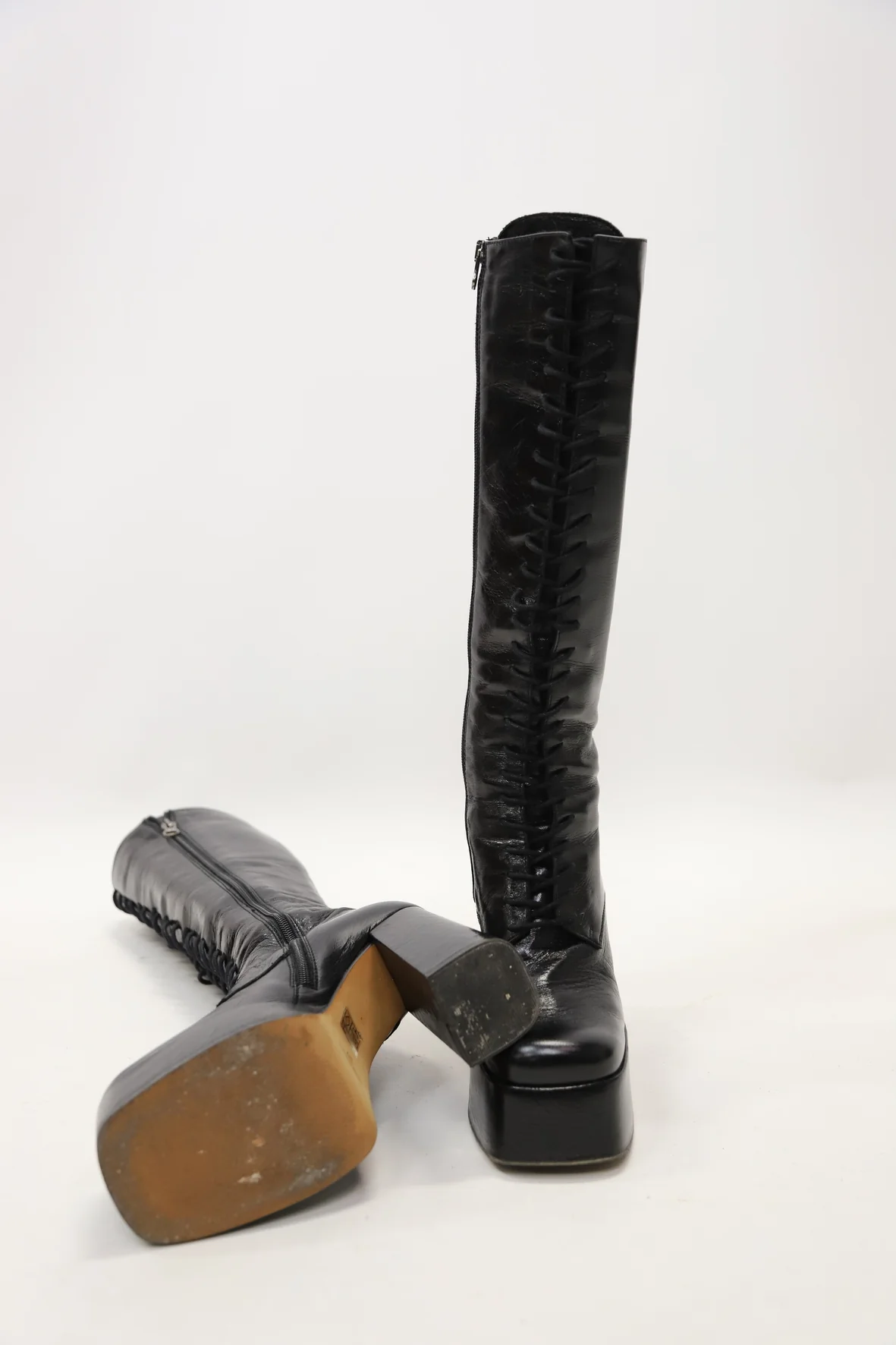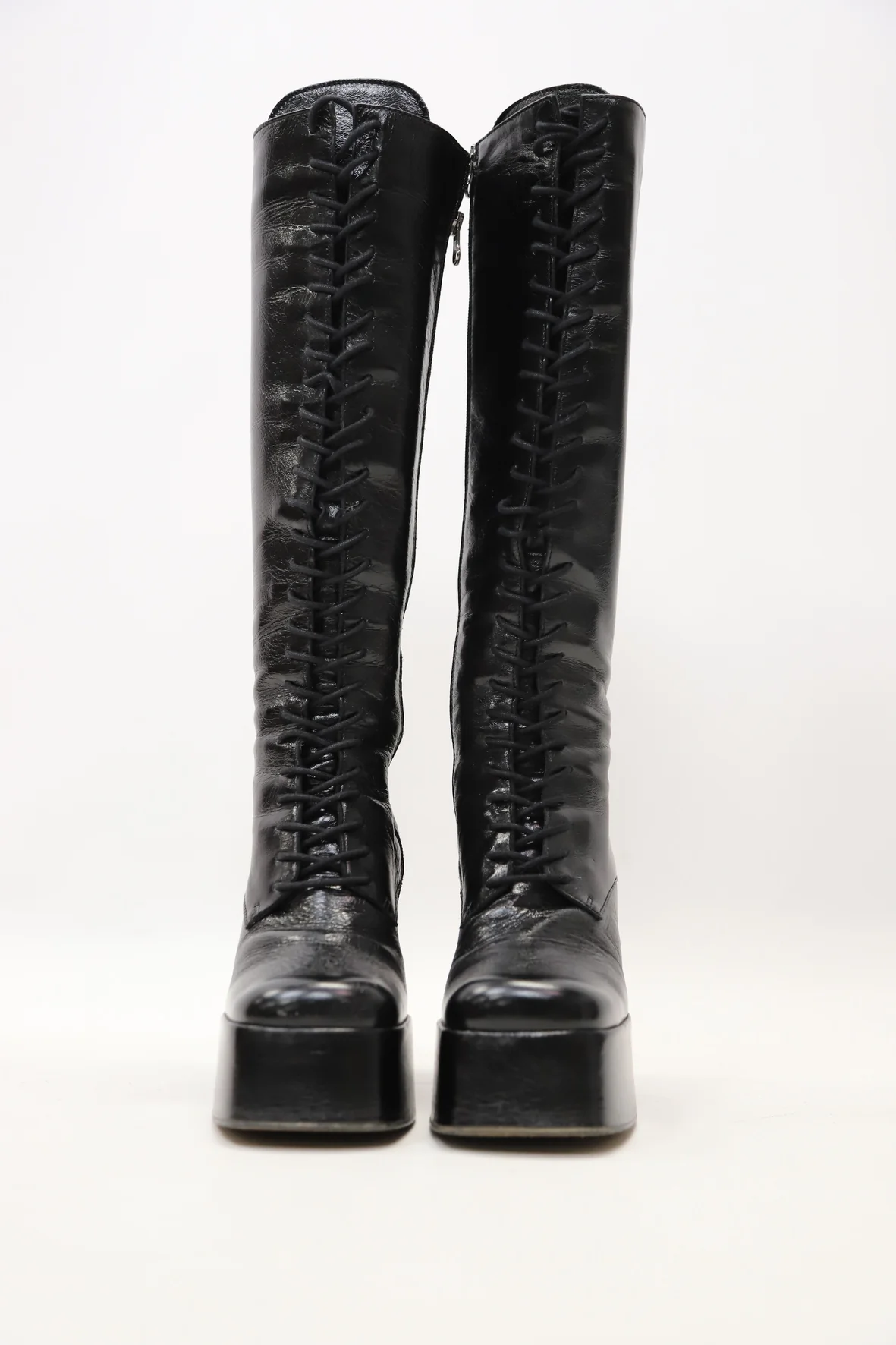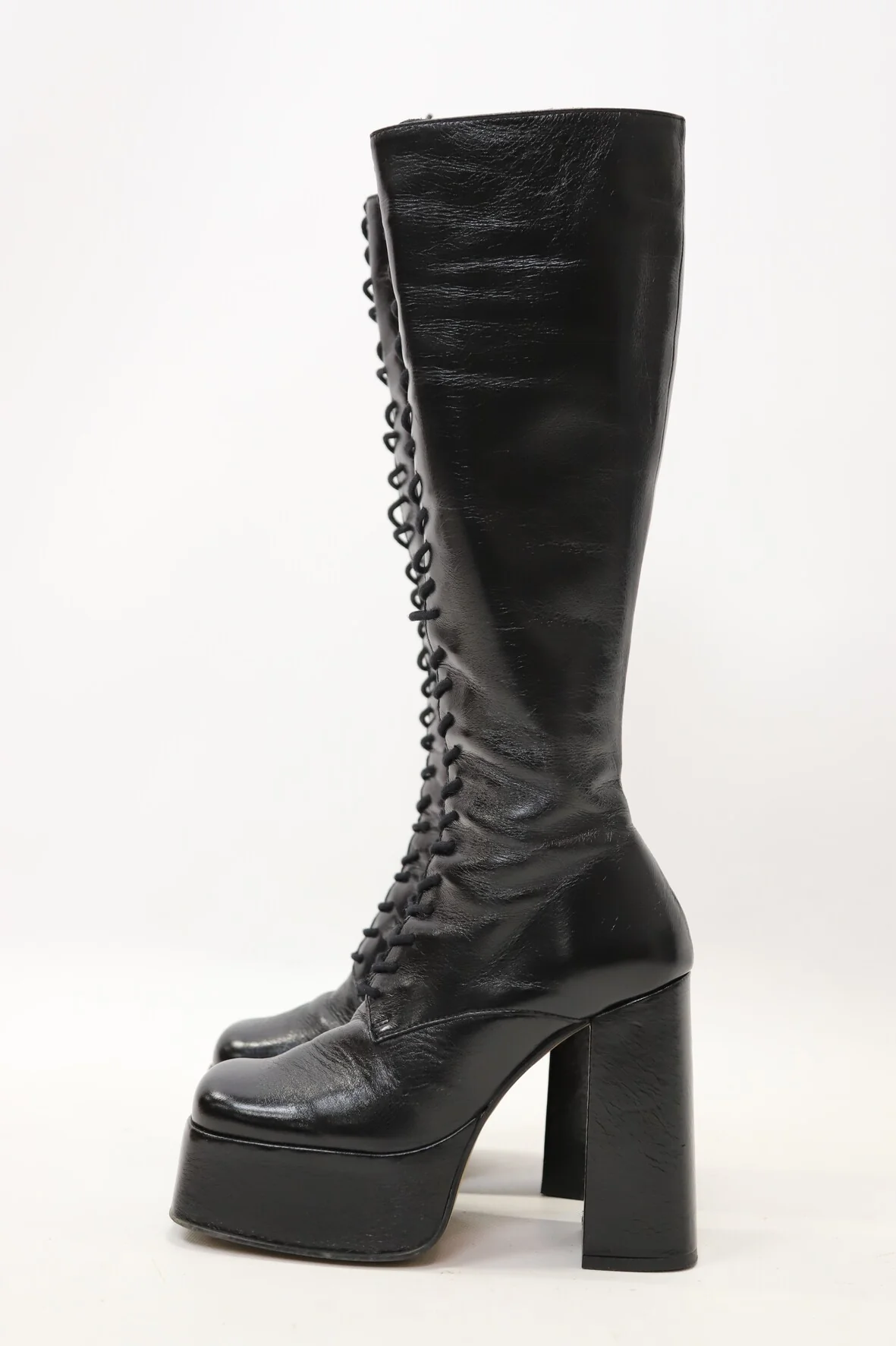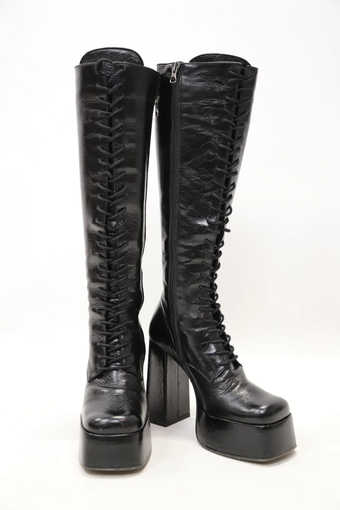Bottes à talons et plateforme. Fermeture éclair sur l’intérieur de la jambe et lacets sur le dessus