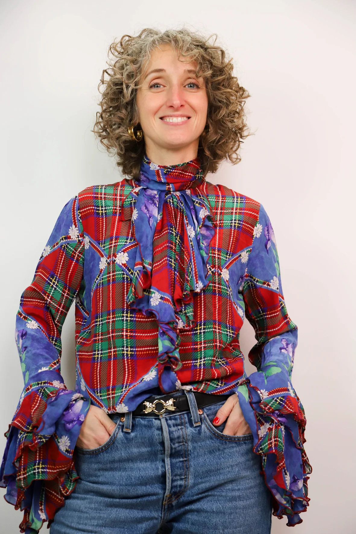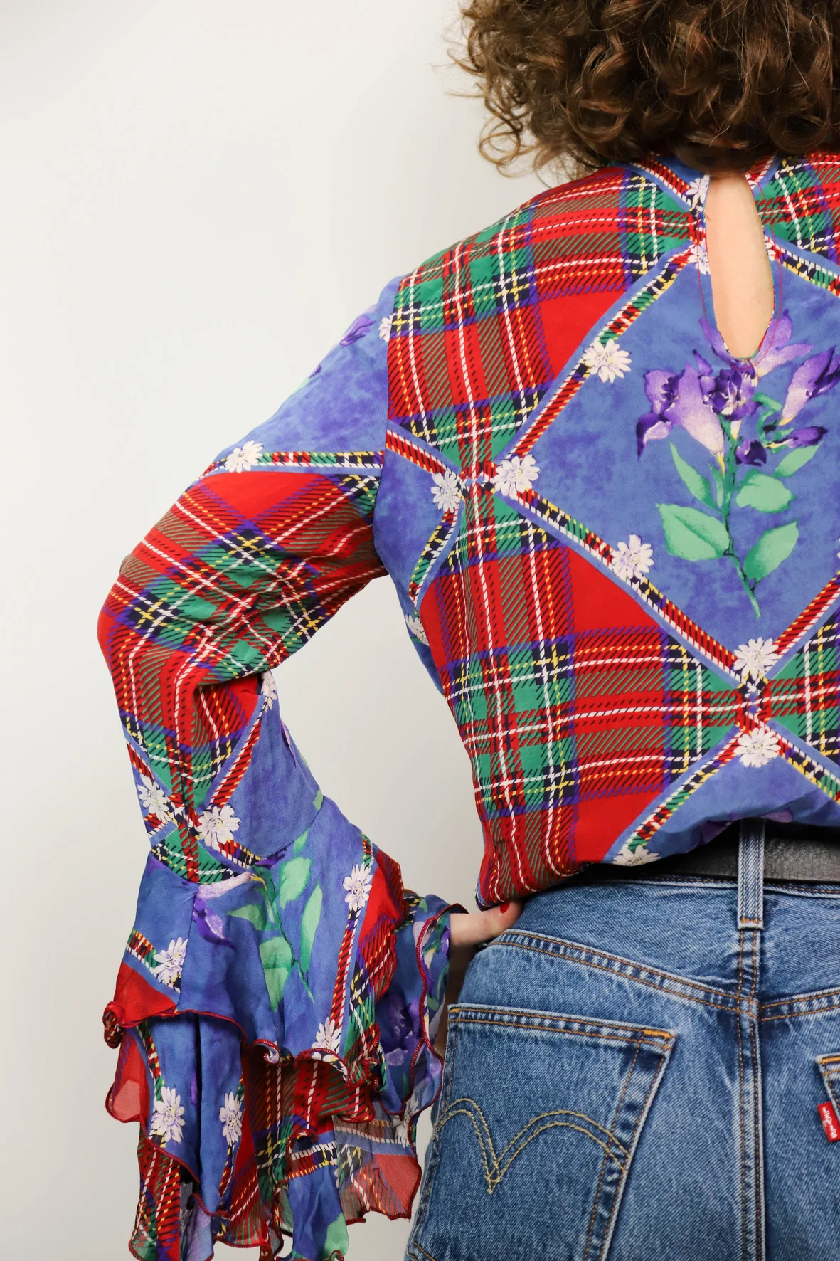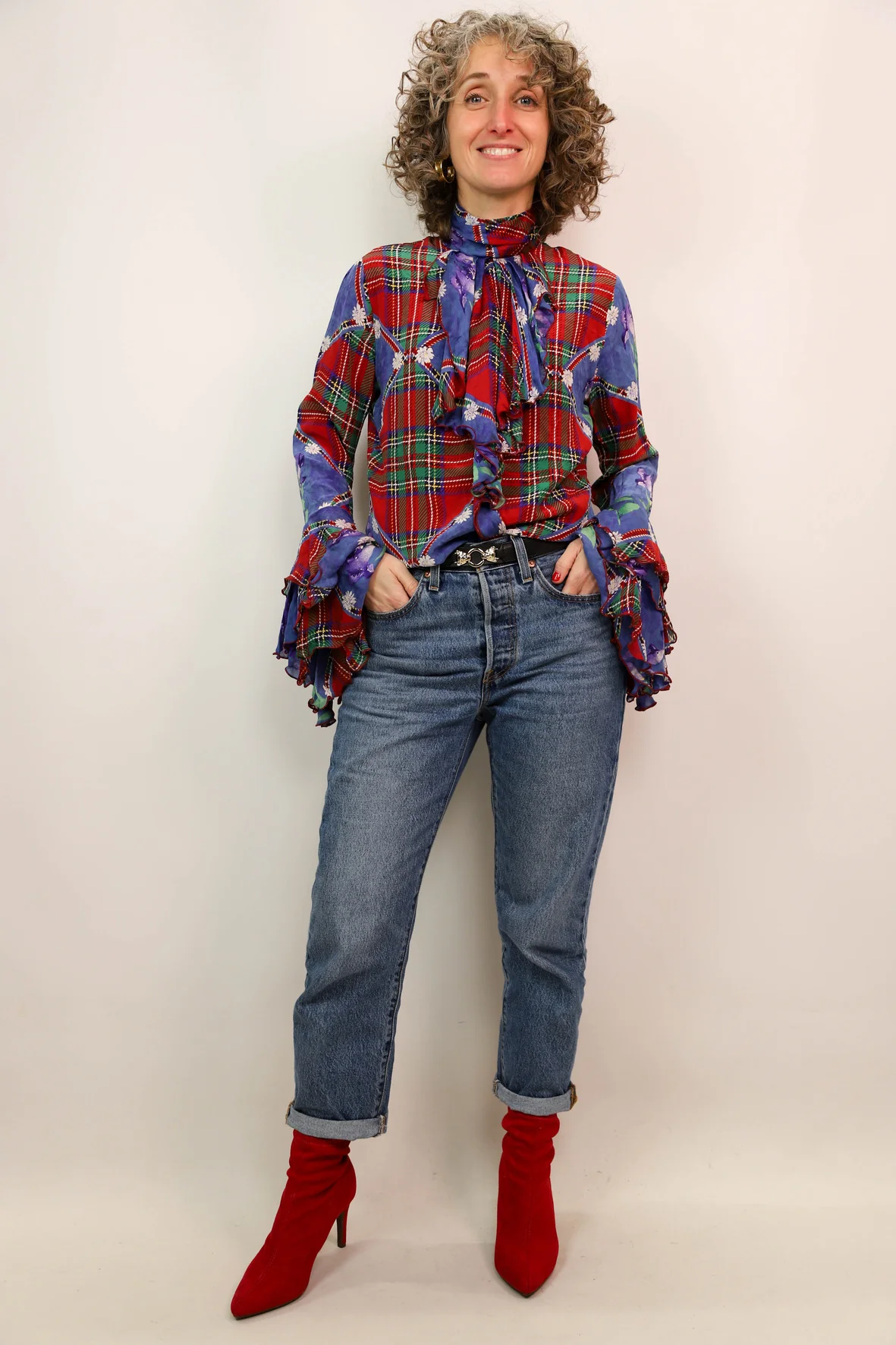 DESCRIPTIF Chemise à carreaux et fleurs. Volants au niveau des manches et du col