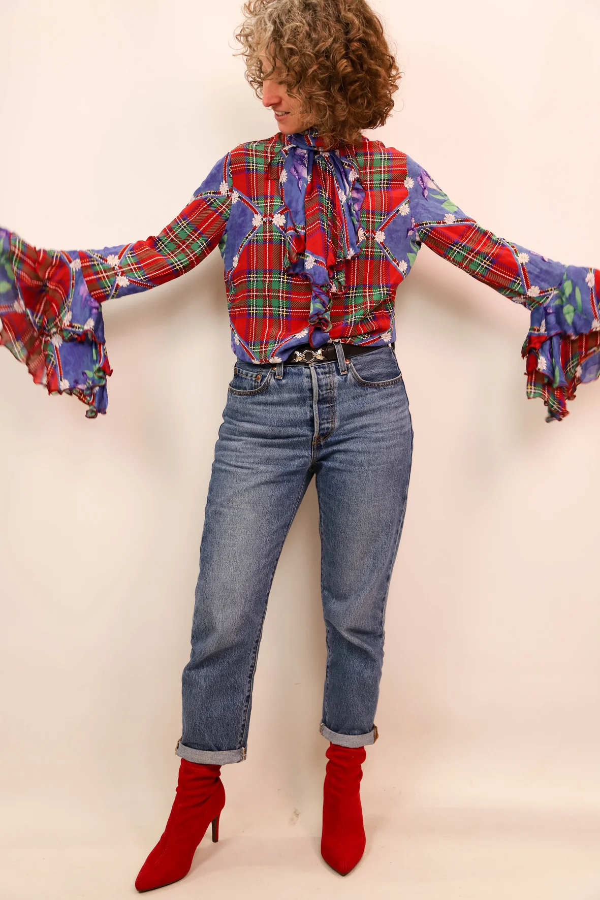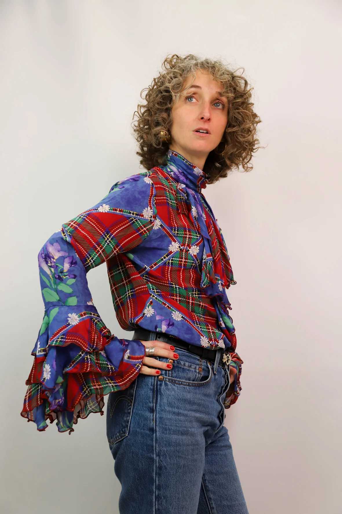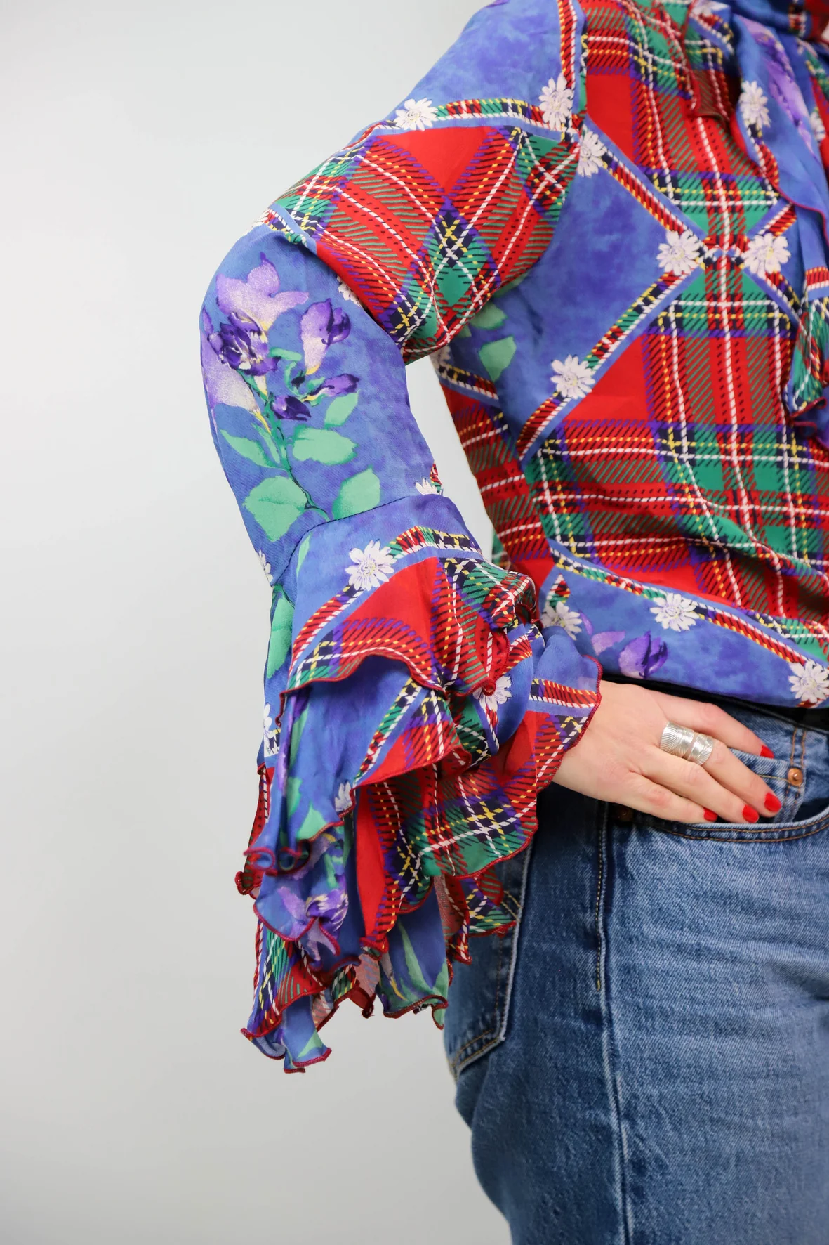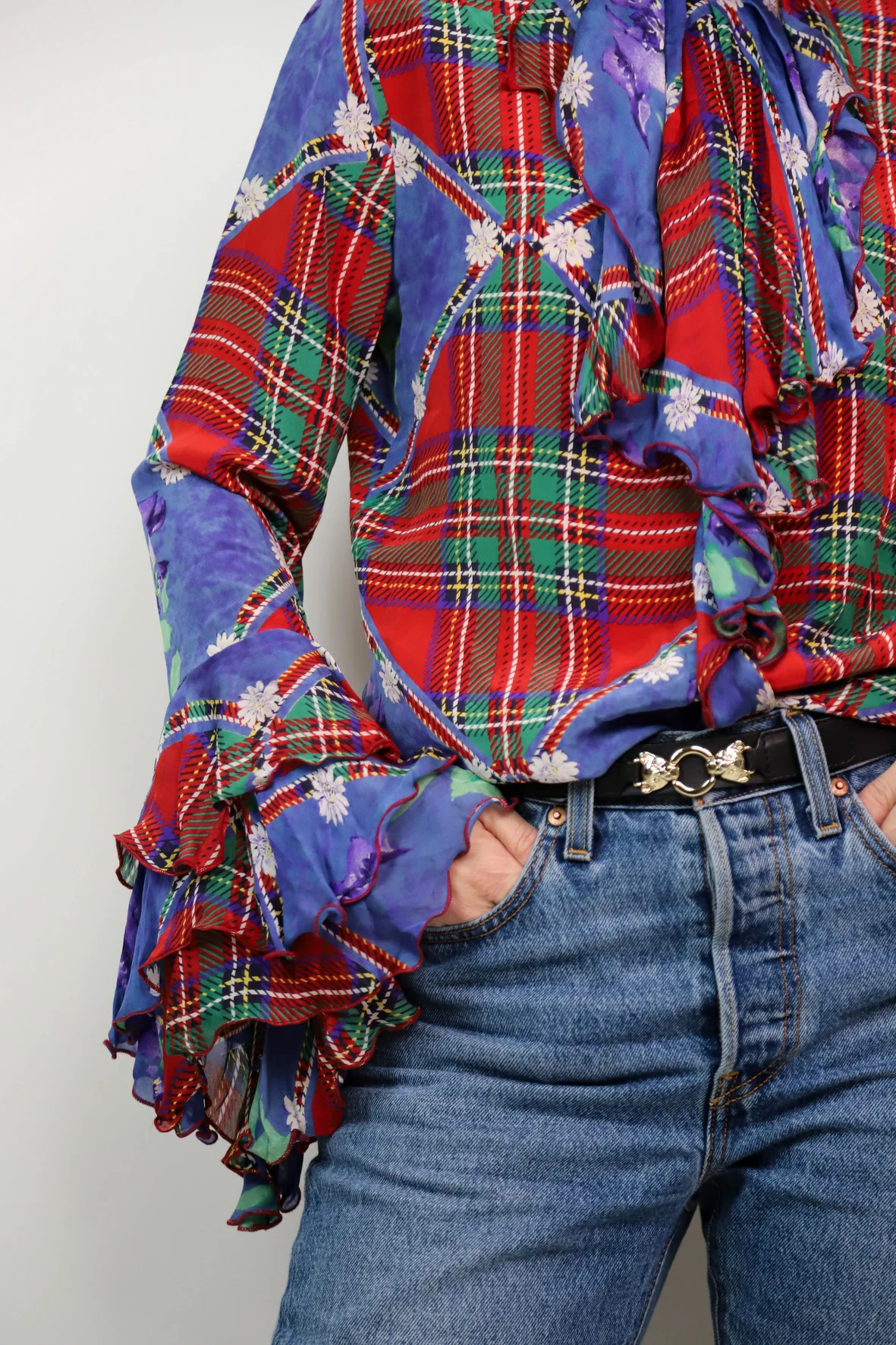 DESCRIPTIF Chemise à carreaux et fleurs. Volants au niveau des manches et du col
