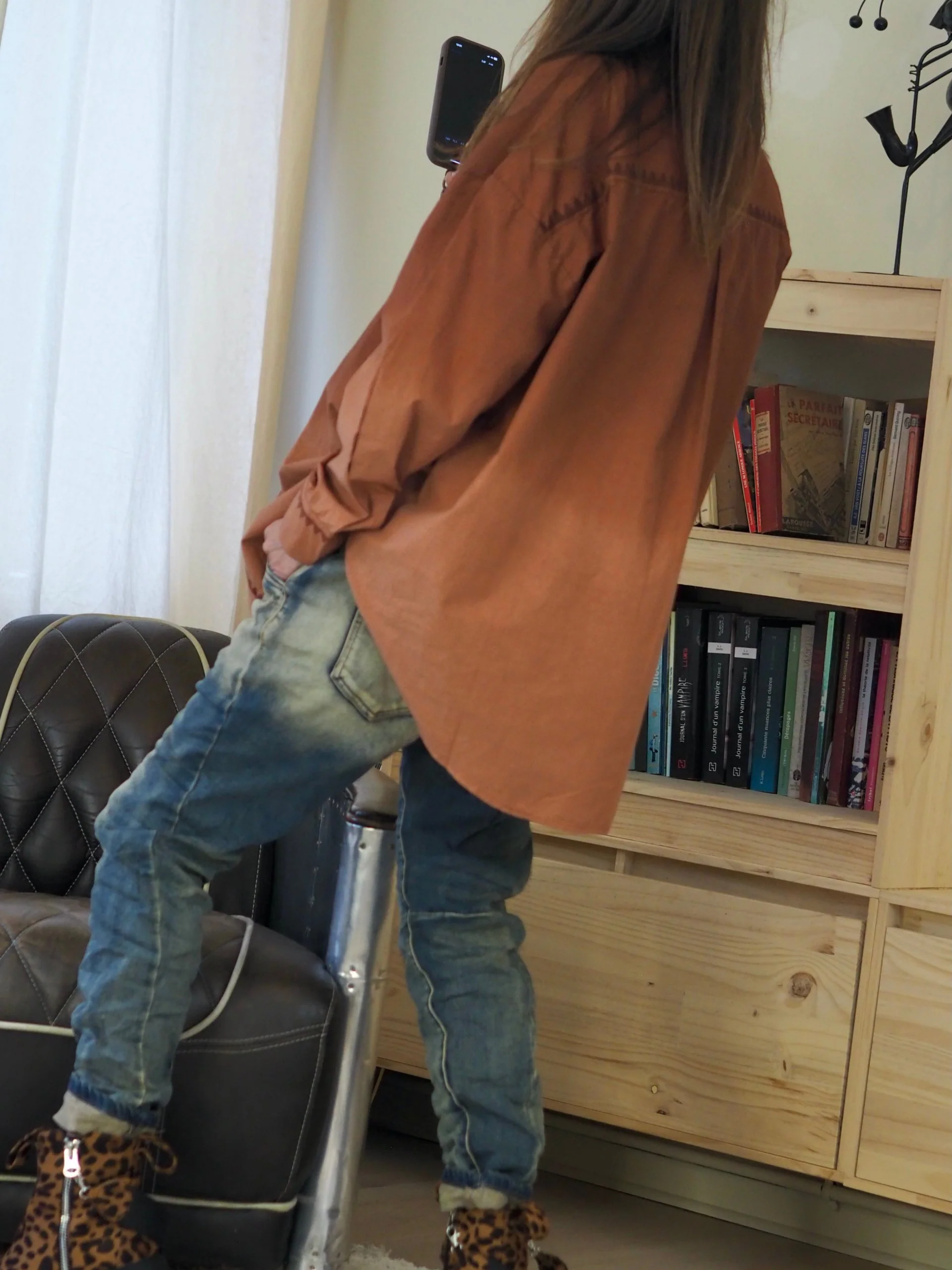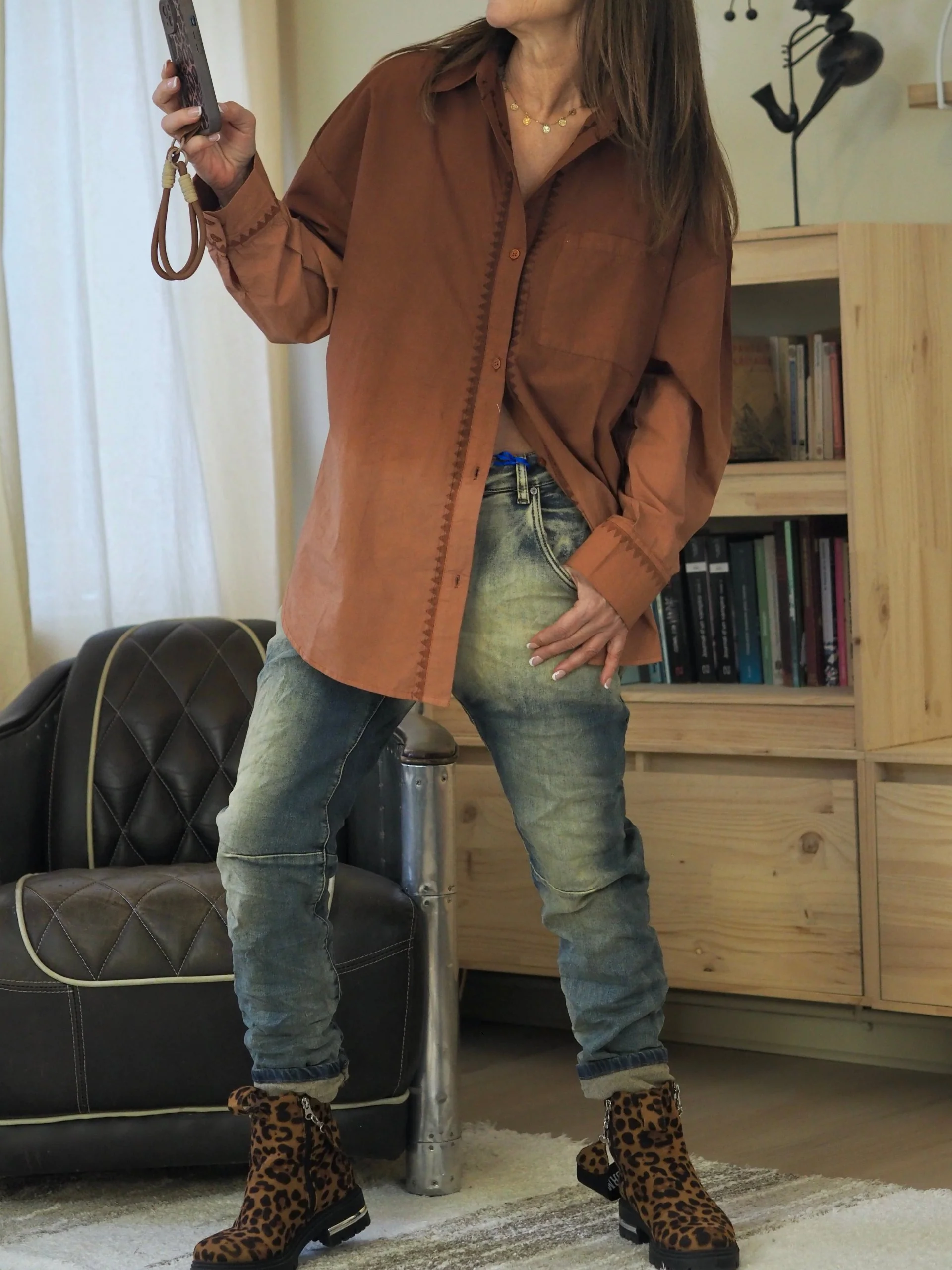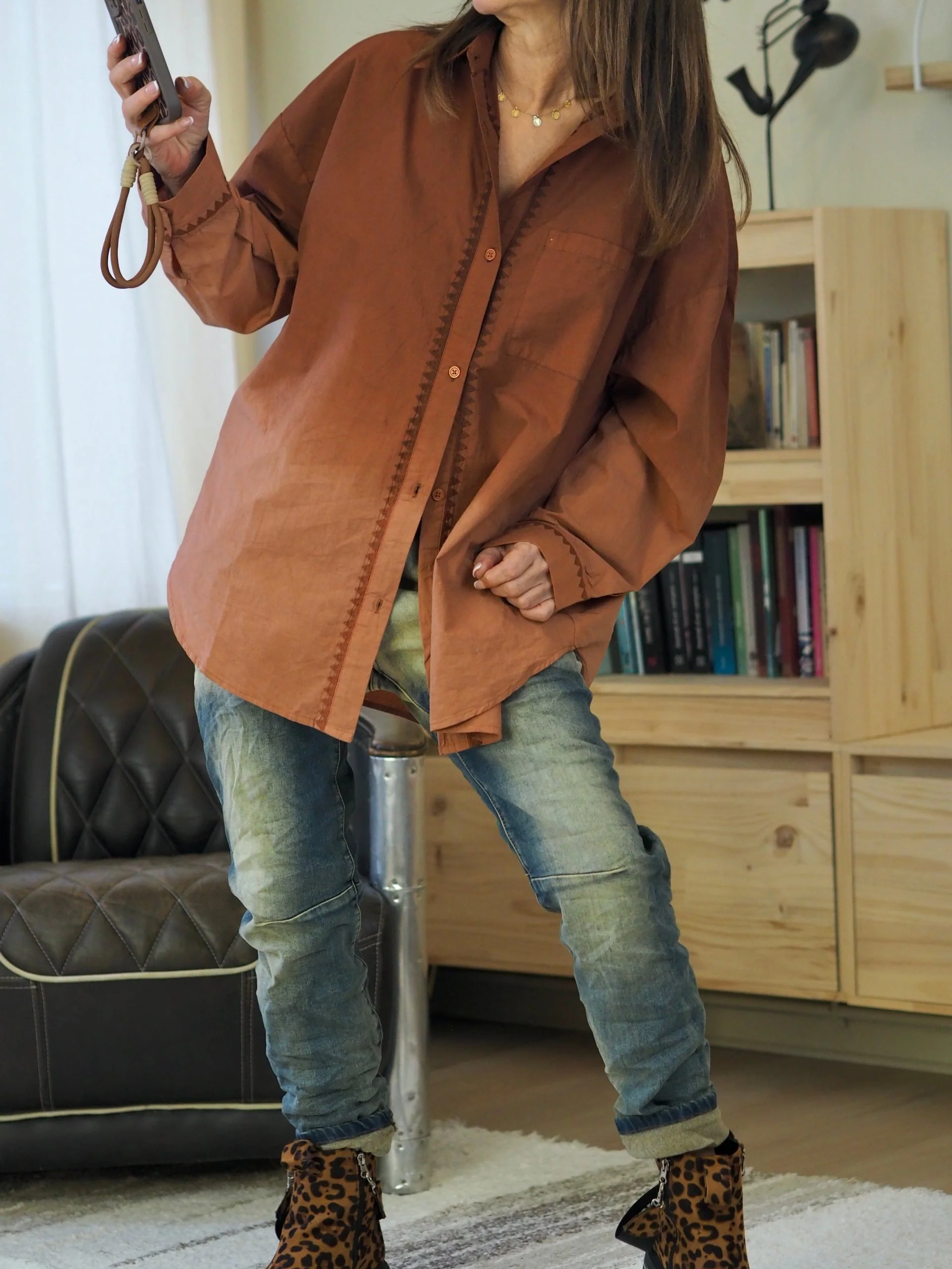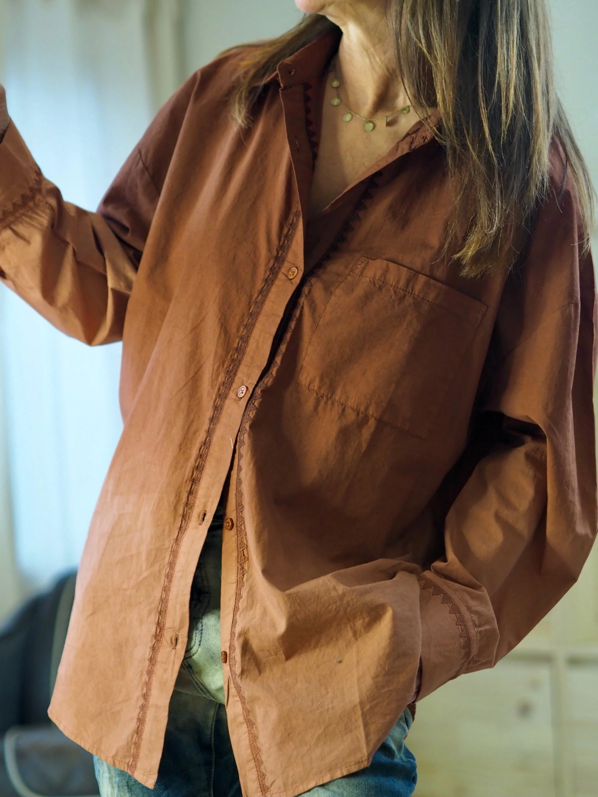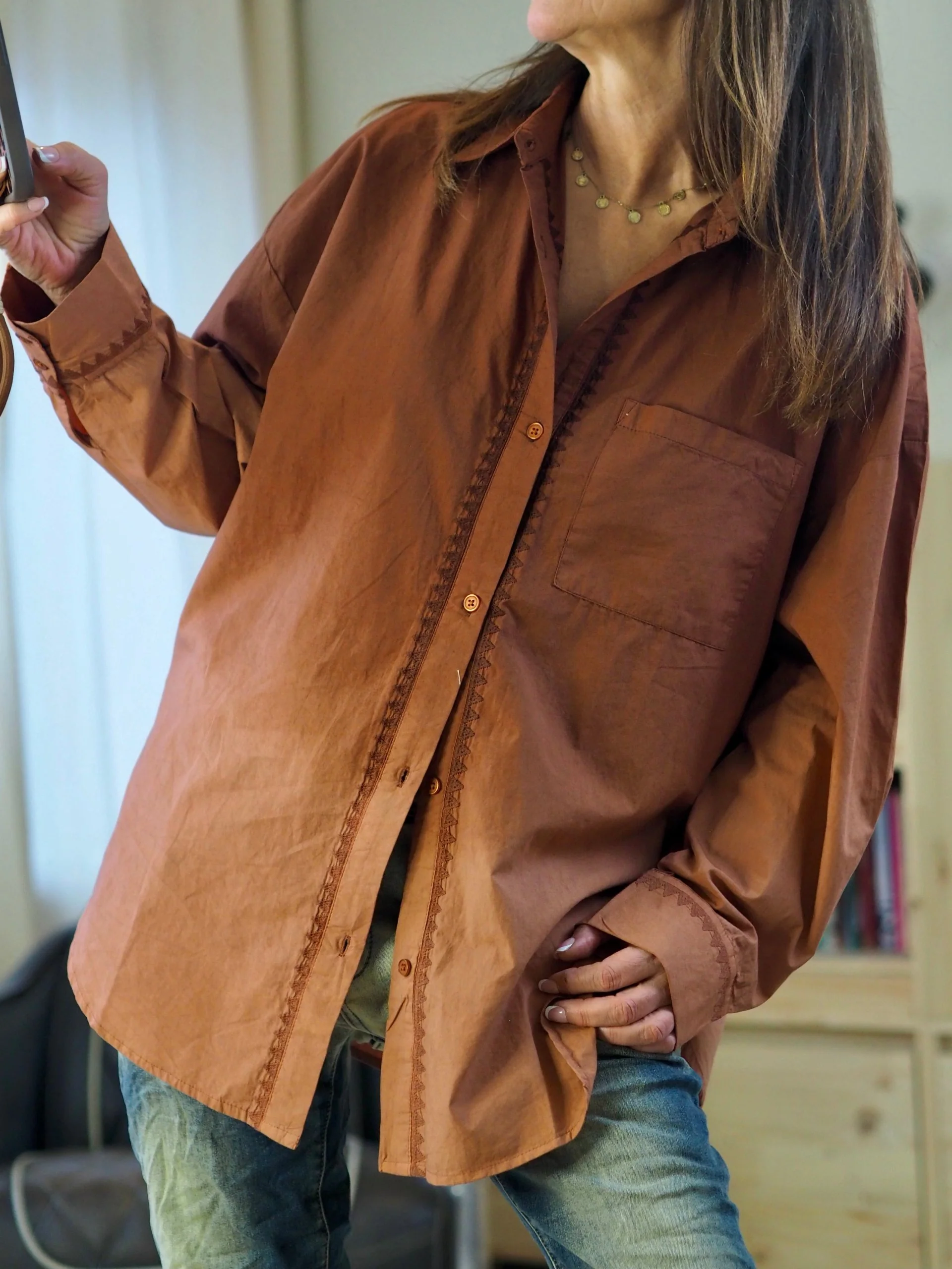 Chemise couleur rouille avec un effet délavé dans le bas et sur les manches. Avec broderies. Popeline de coton.