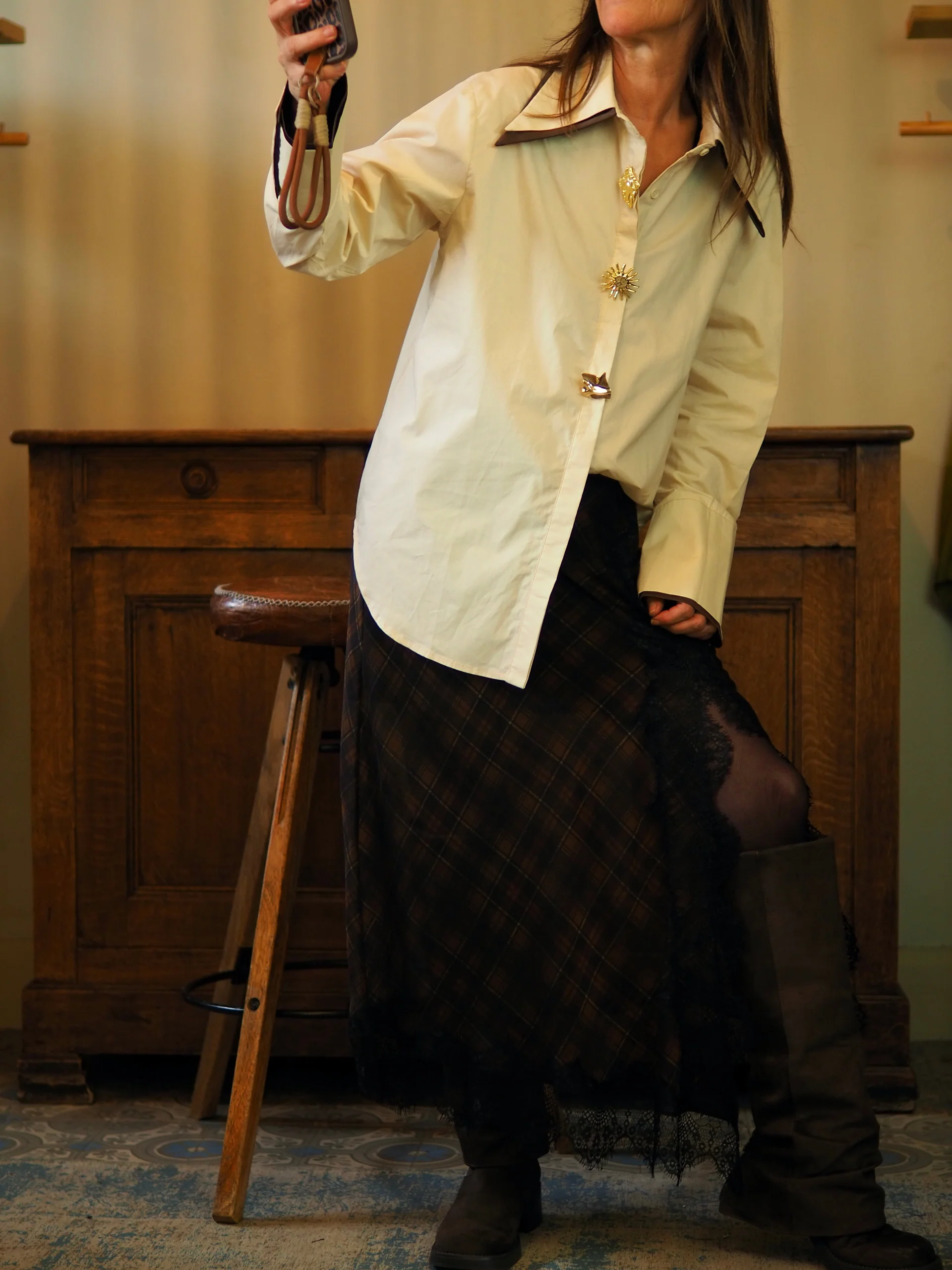 Chemise beige avec 3 boutons bijoux. Double col et doubles manchettes marrons. Entiérement boutonnée sur l’avant.