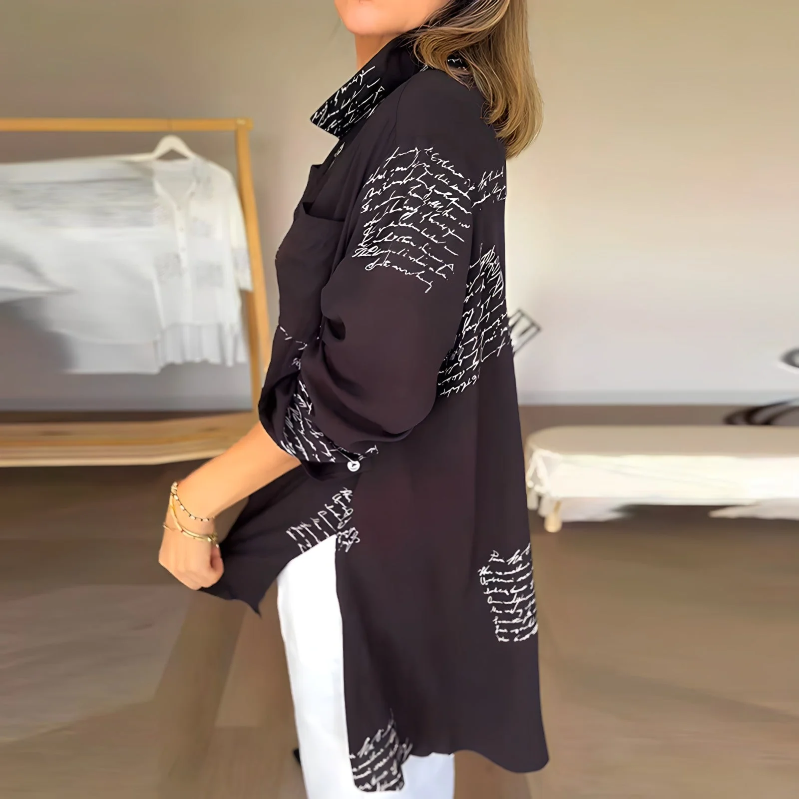 Conçue pour les femmes qui chérissent l’élégance portée par des détails singuliers, cette chemise se présente comme une toile vierge ornée de mots stylisés qui racontent une histoire.
