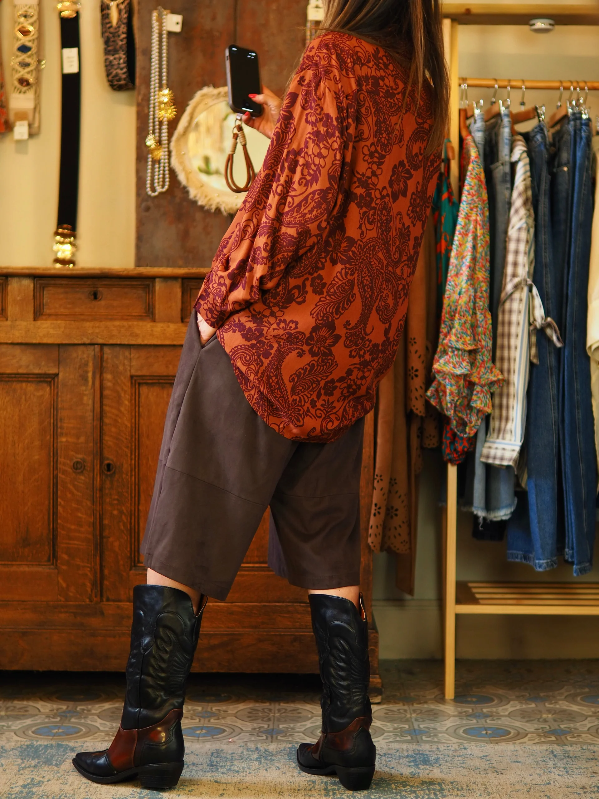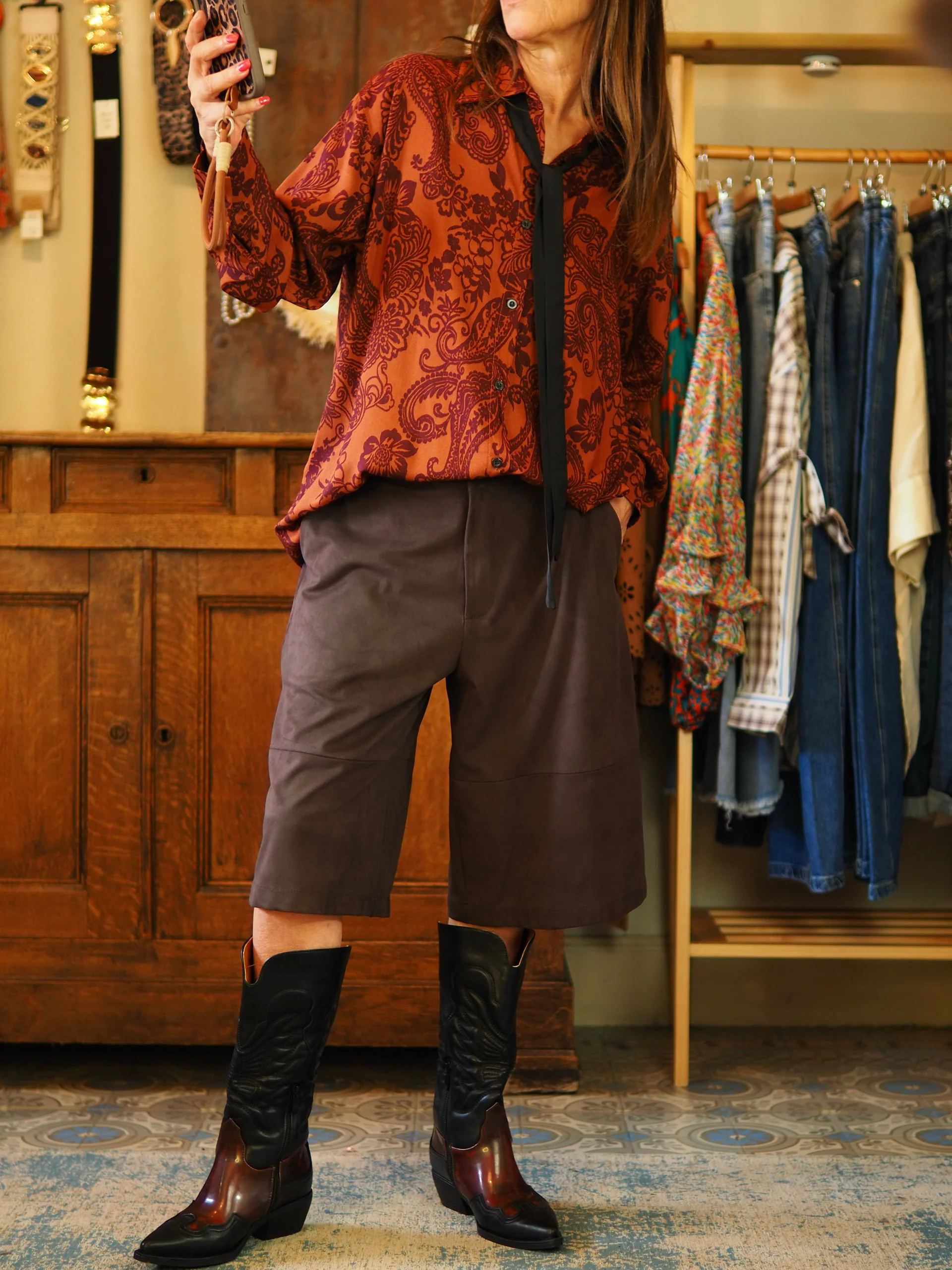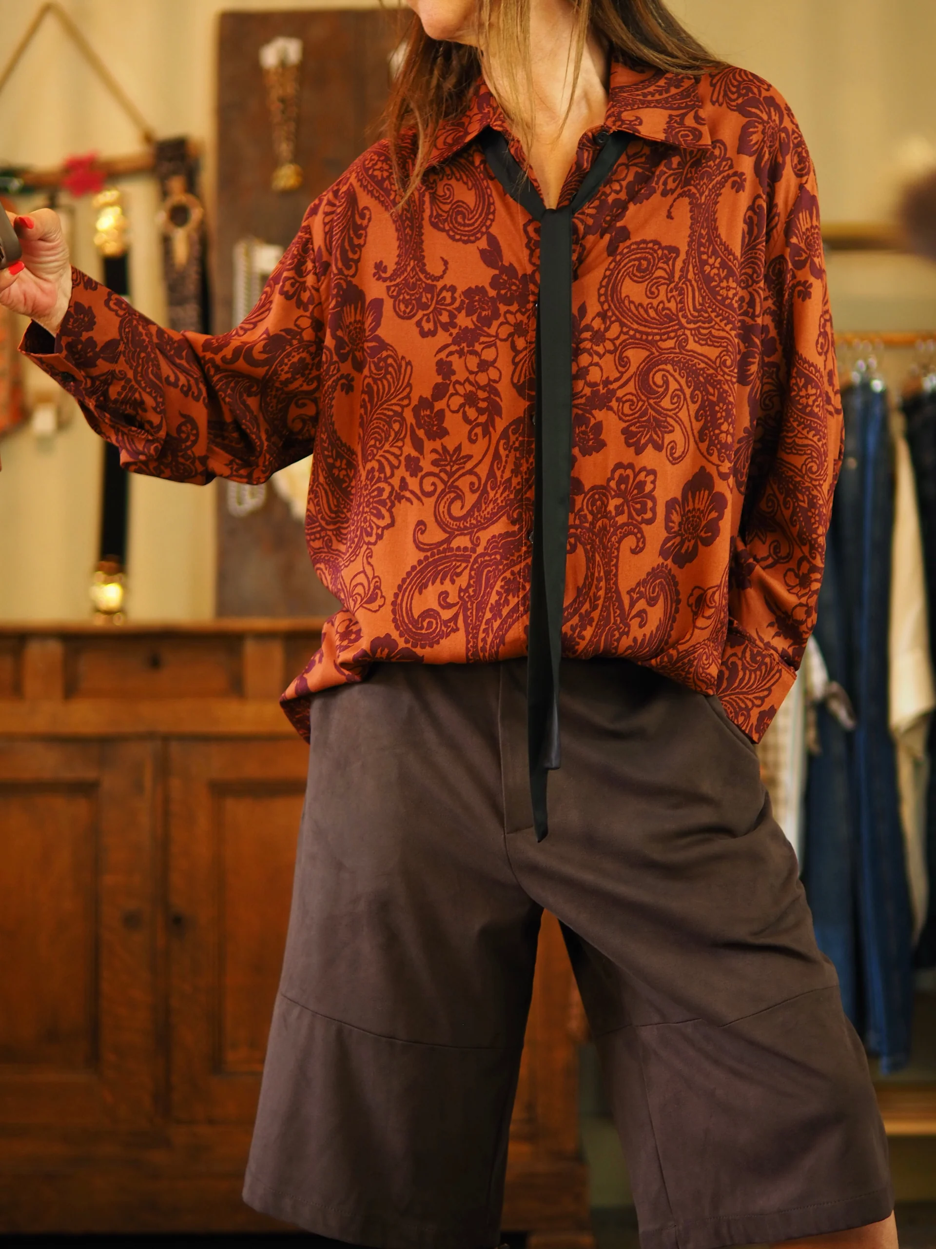Chemise rouille avec imprimé bordaux. Avec fine cravate noire.
