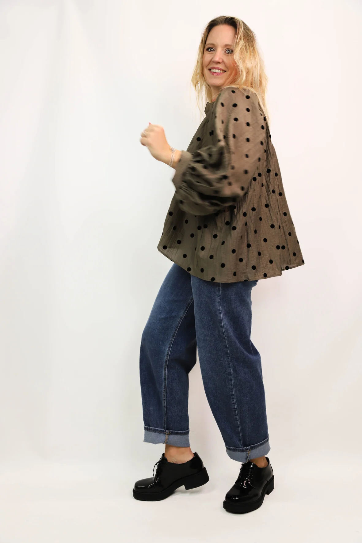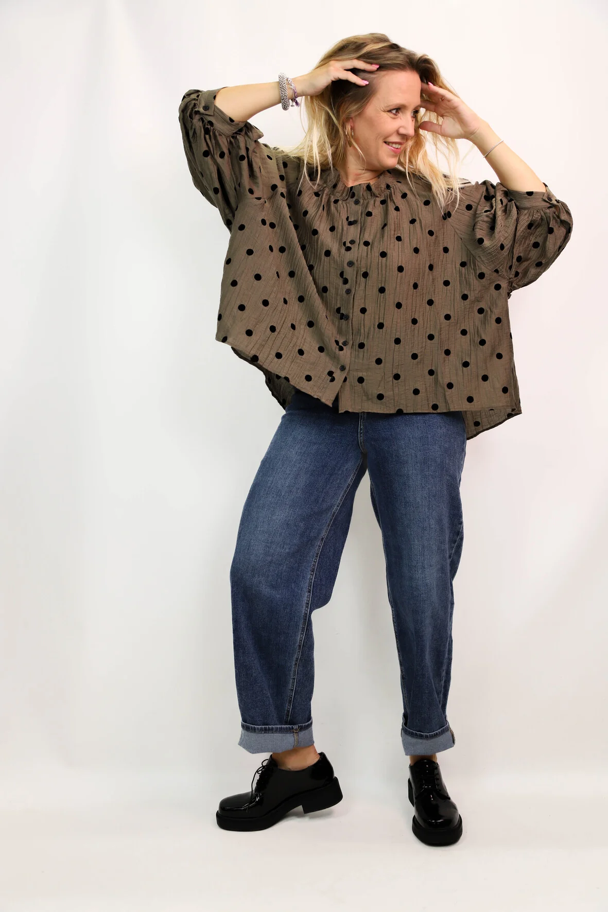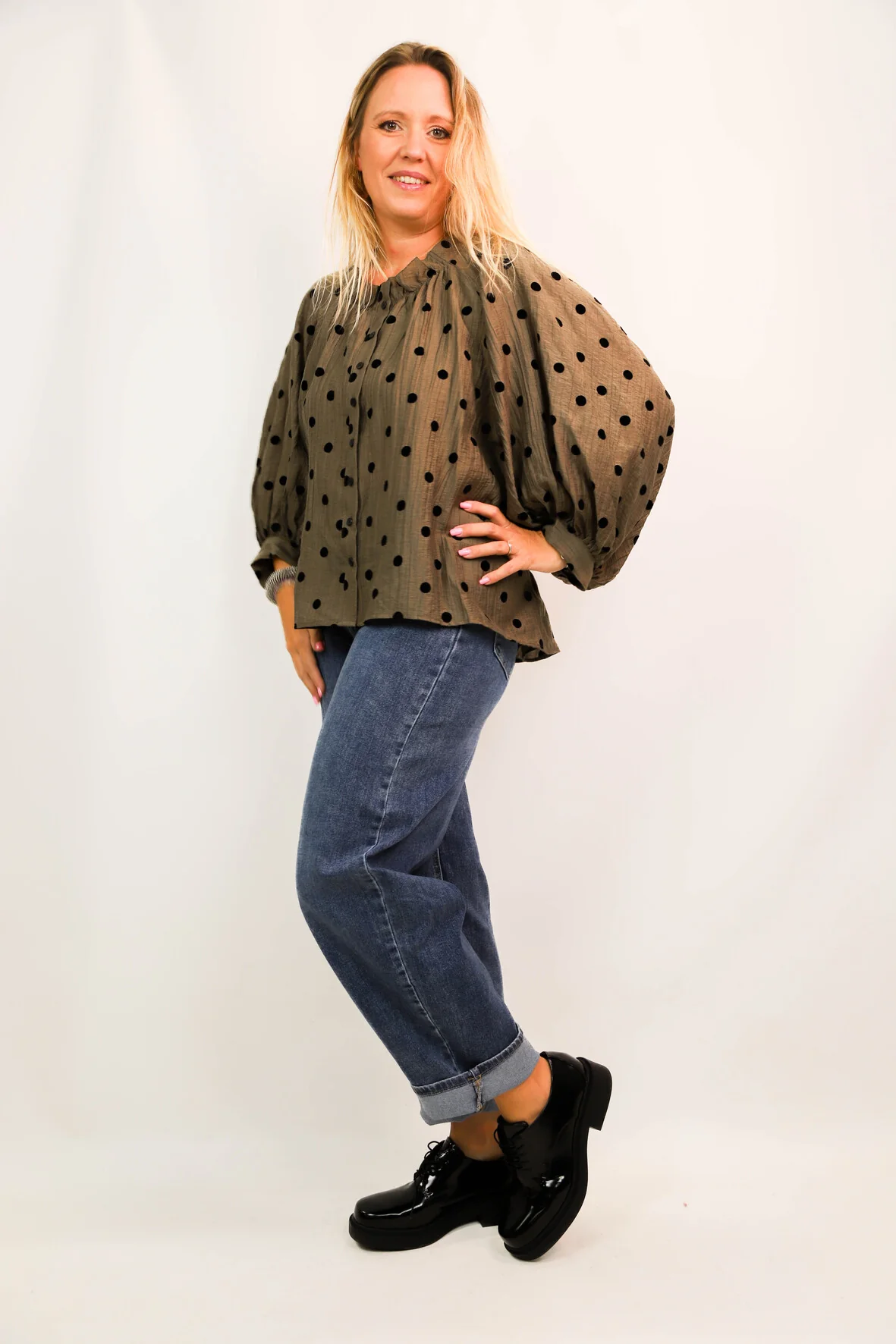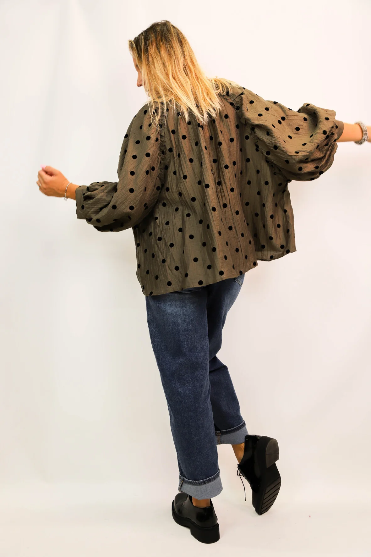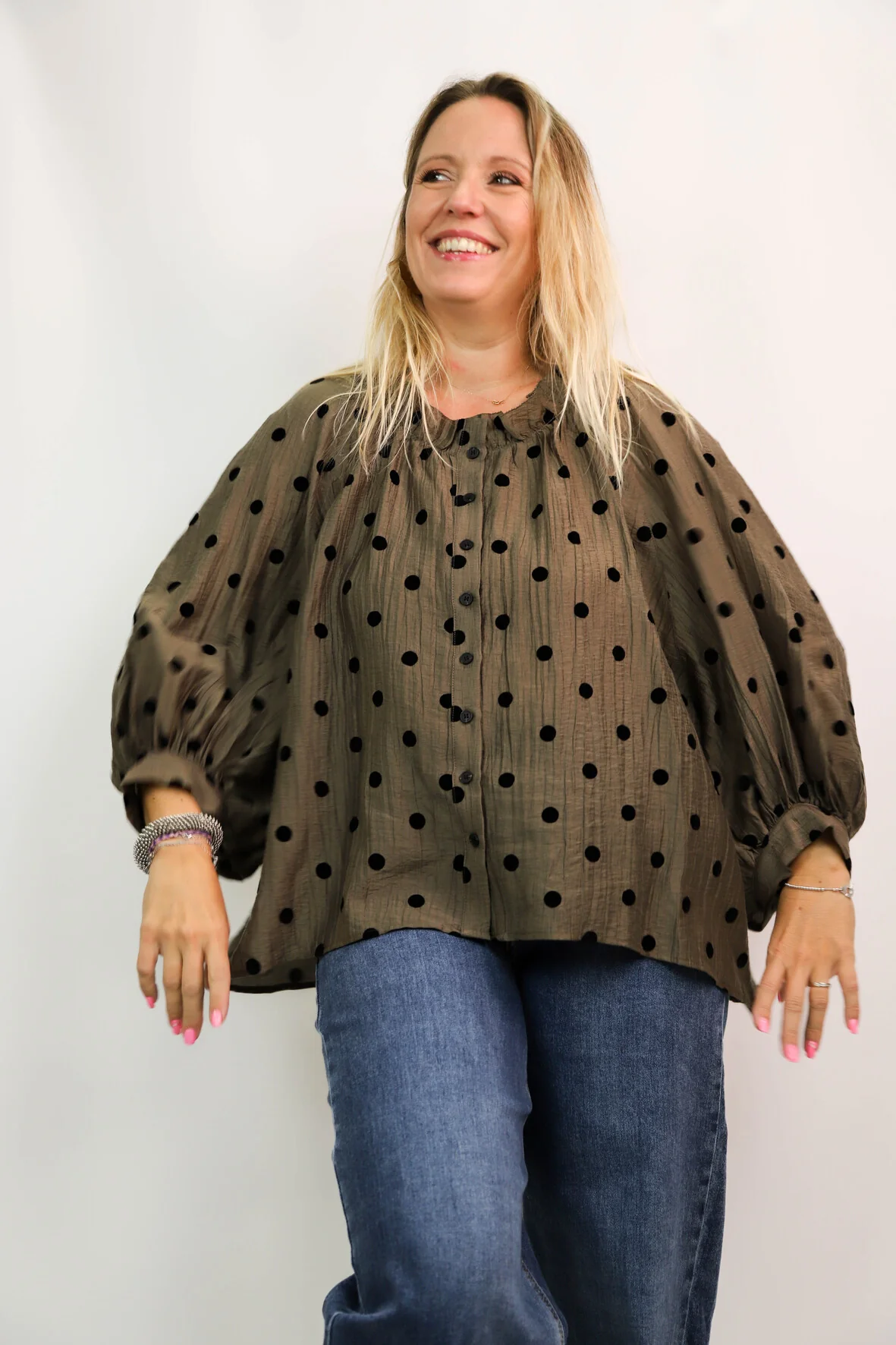 | DESCRIPTIF | Chemisier manches large et col rond. Motif pois noir |