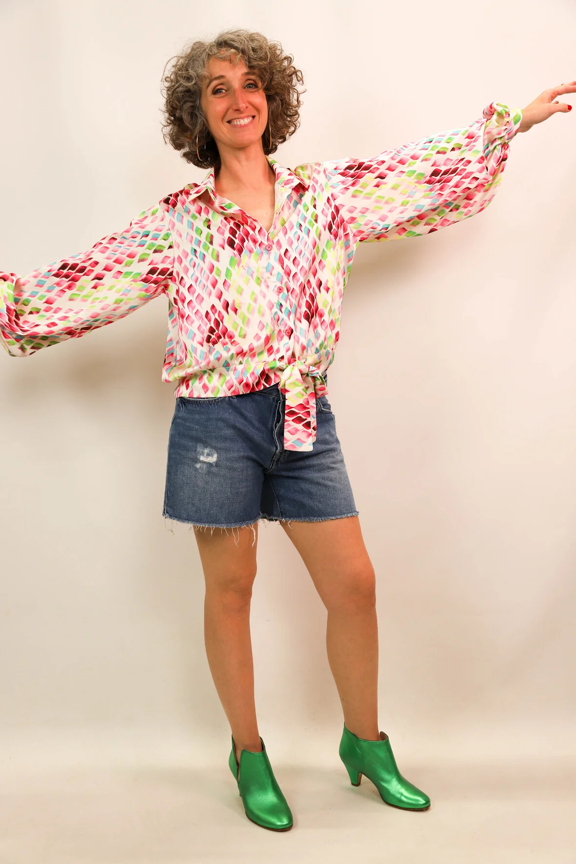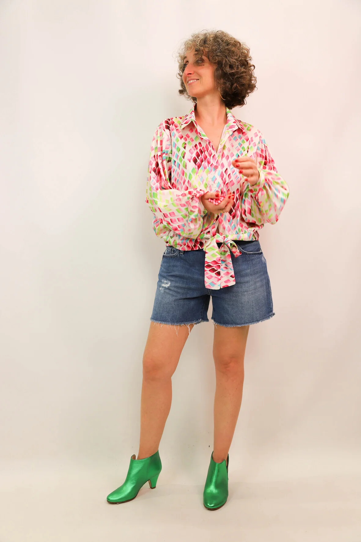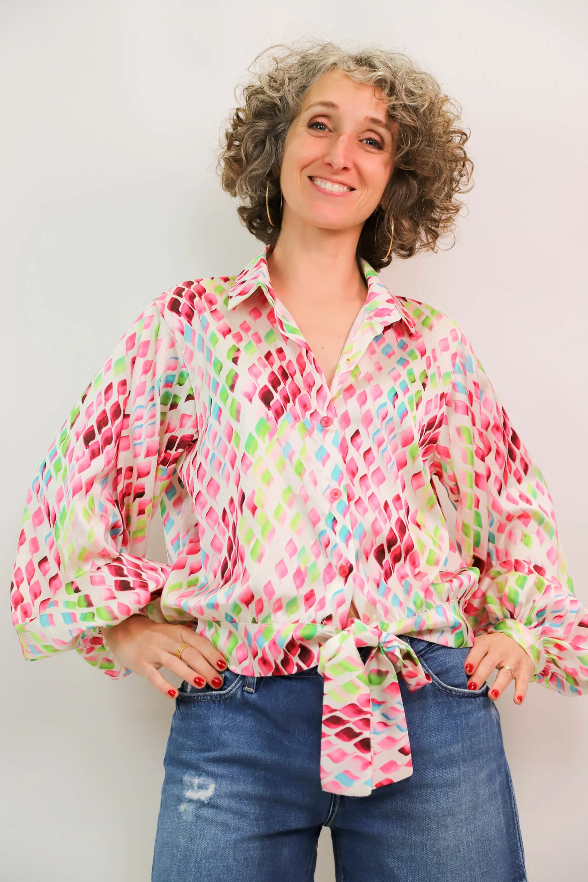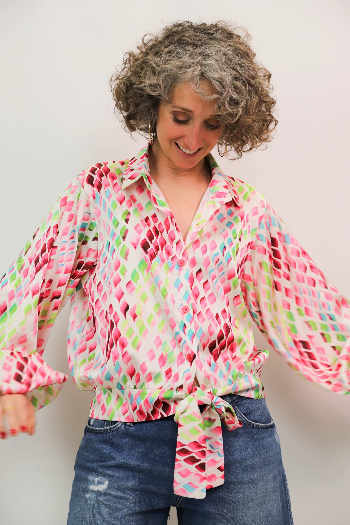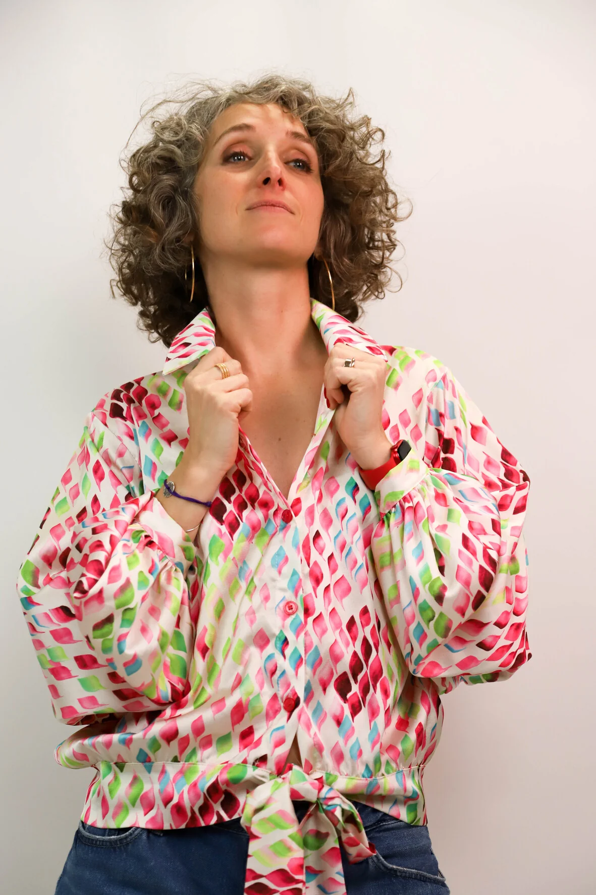 DESCRIPTIF Chemisier à motif rose et vert avec lacets à nouer