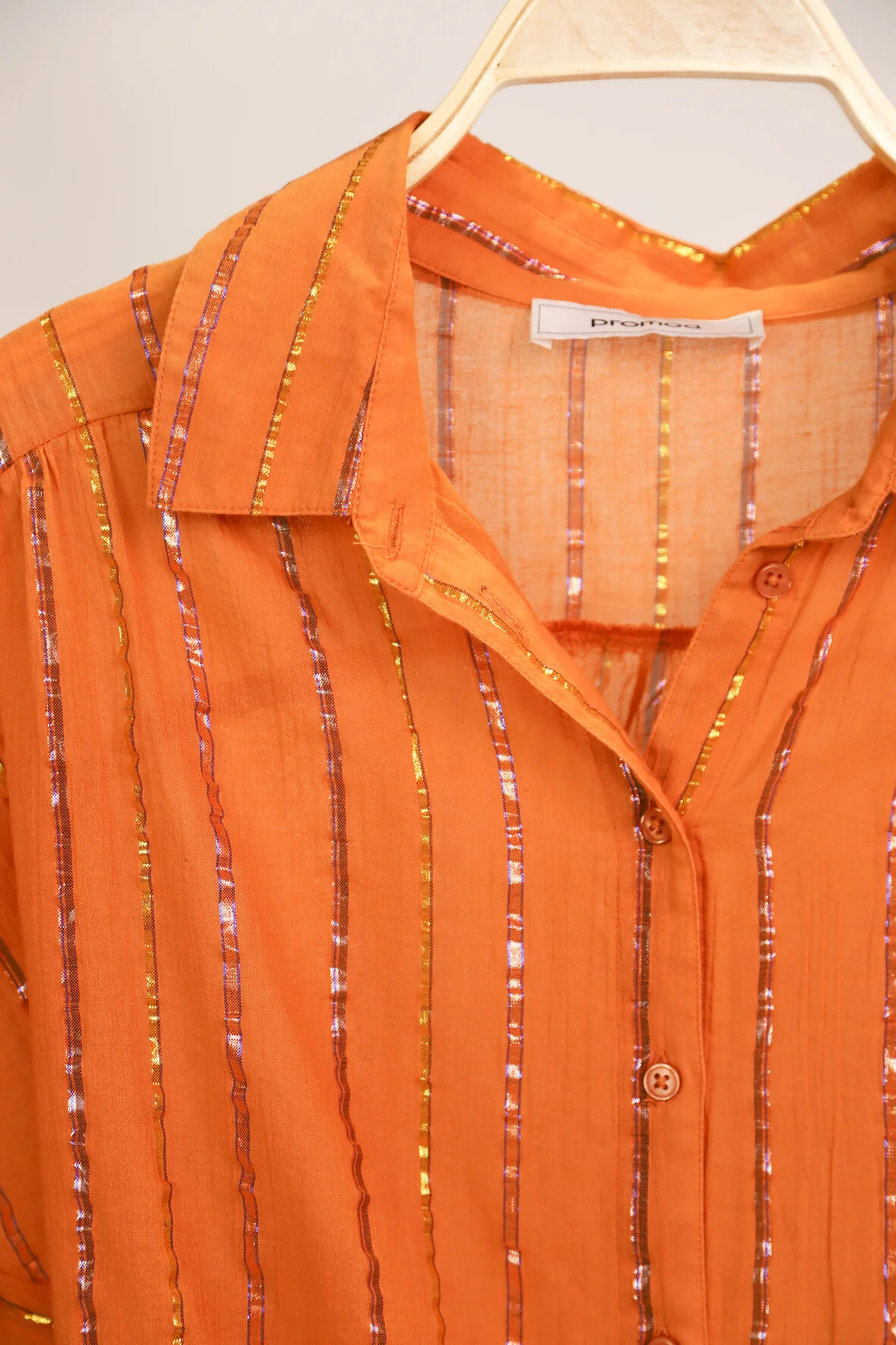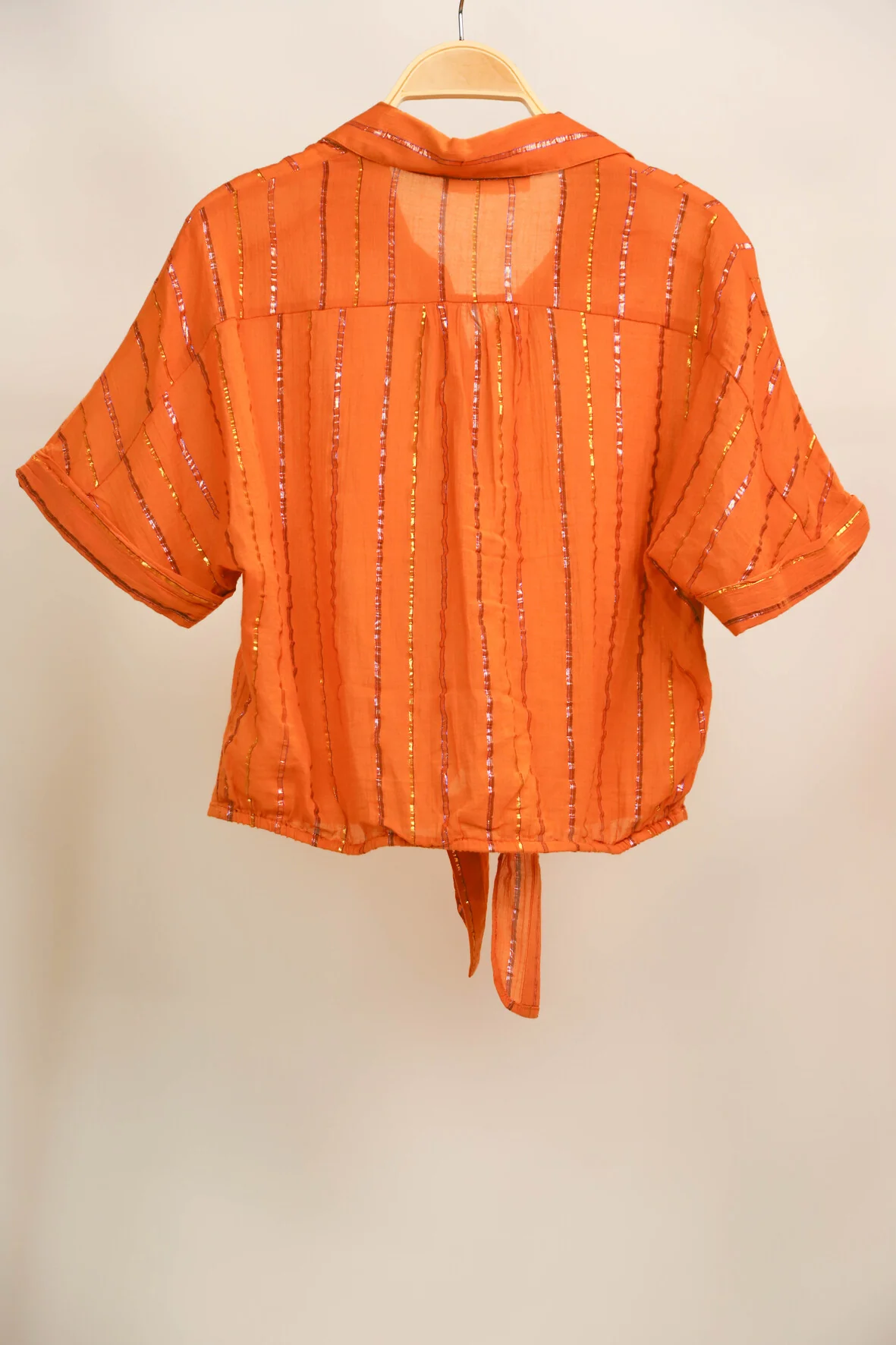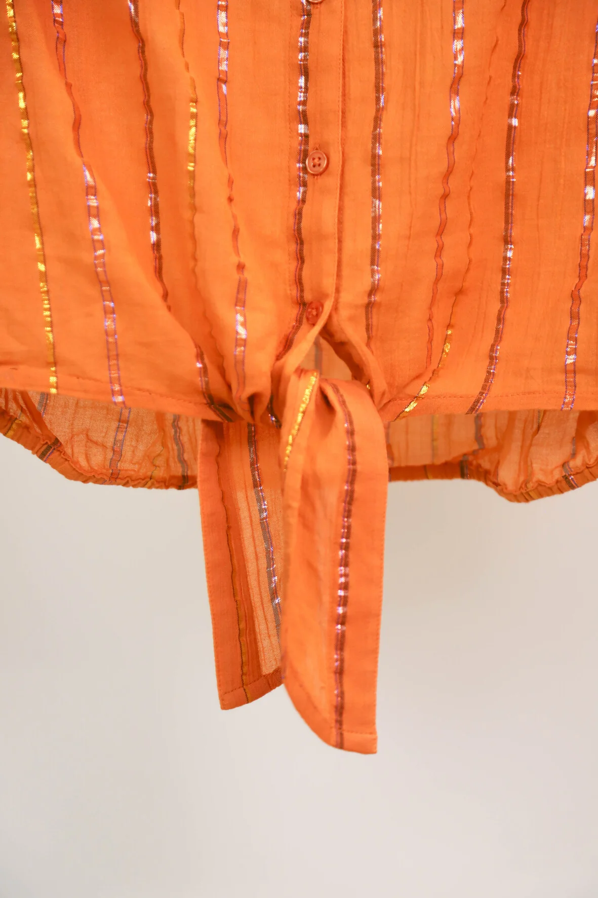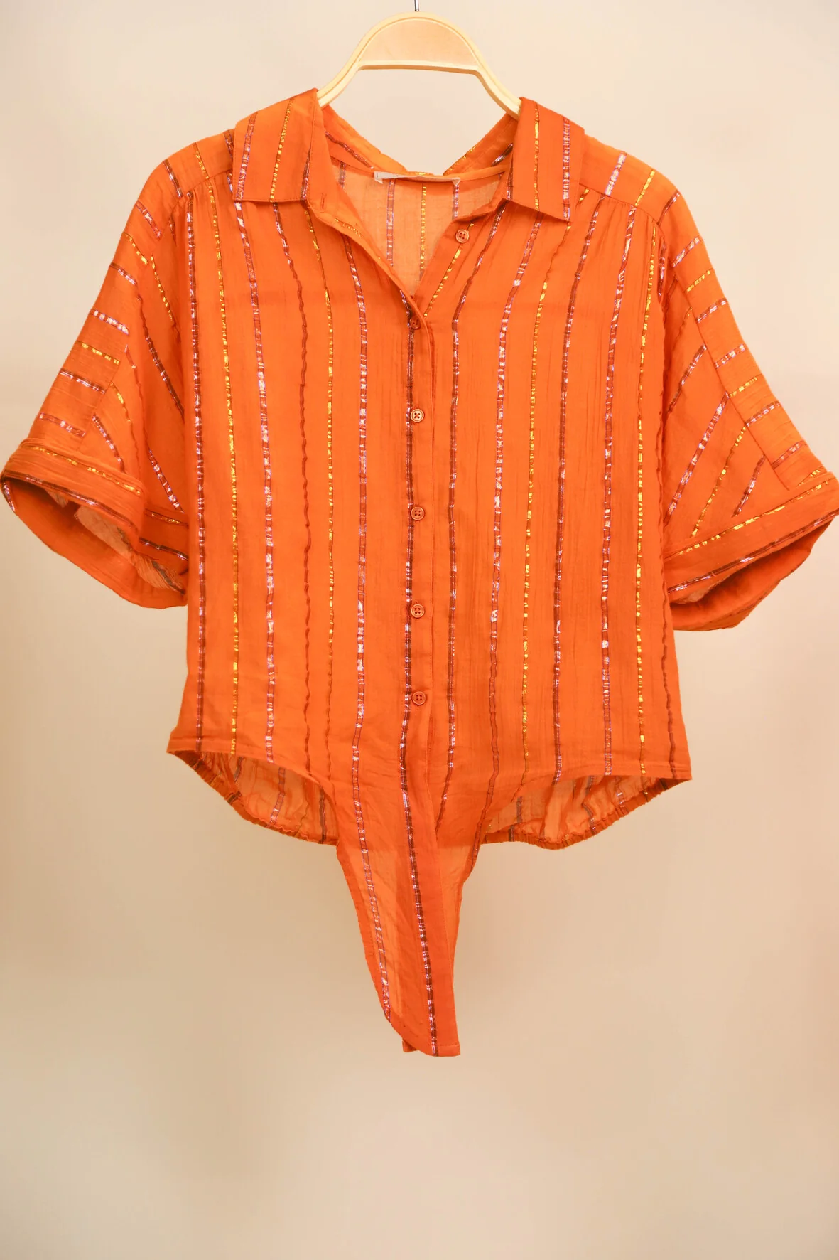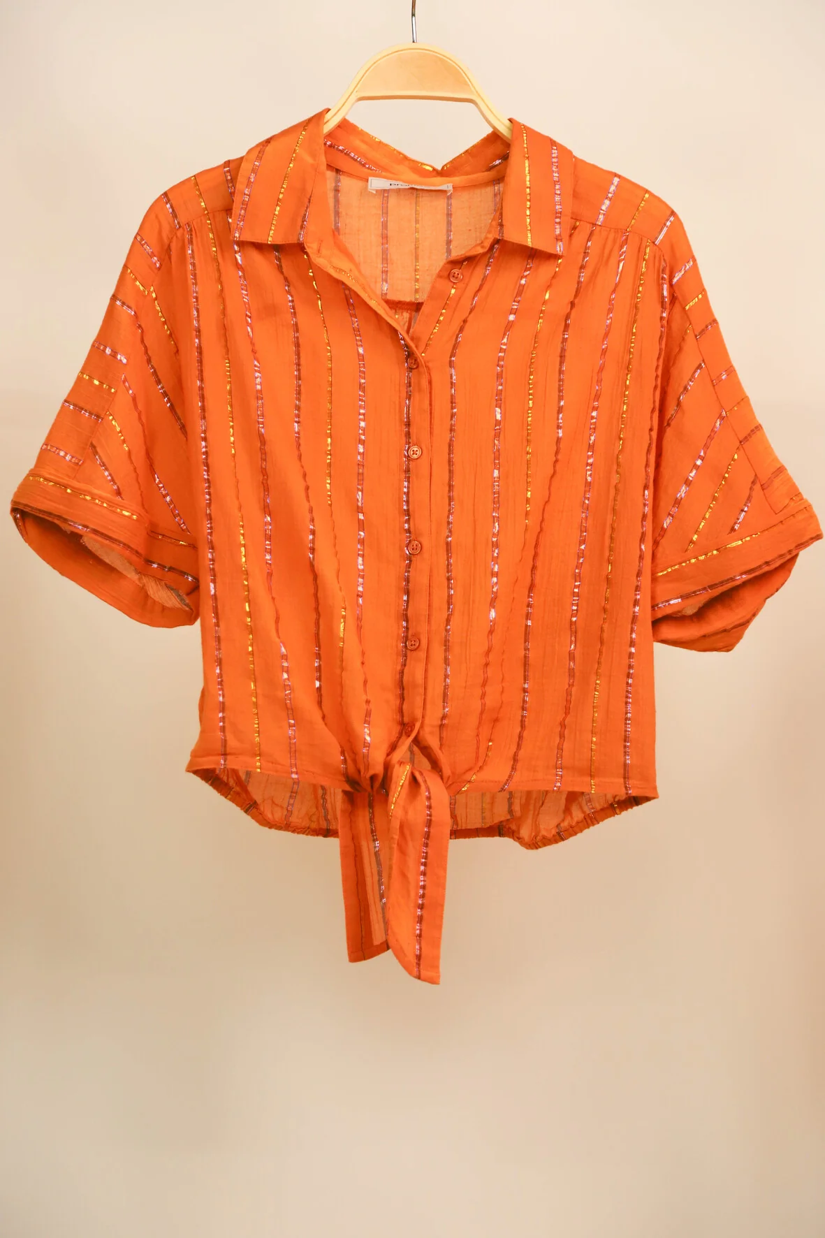 | DESCRIPTIF | Chemisier manches courtes avec noeud sur le bas. Rayures fils brillants |