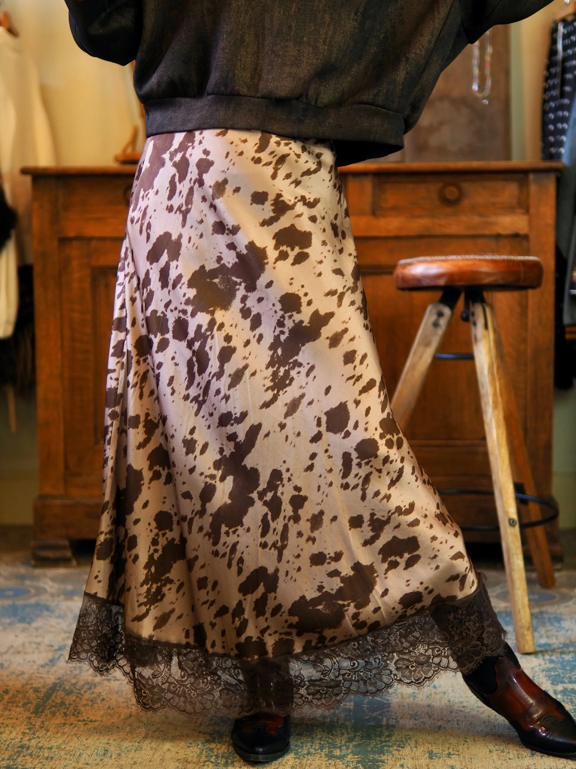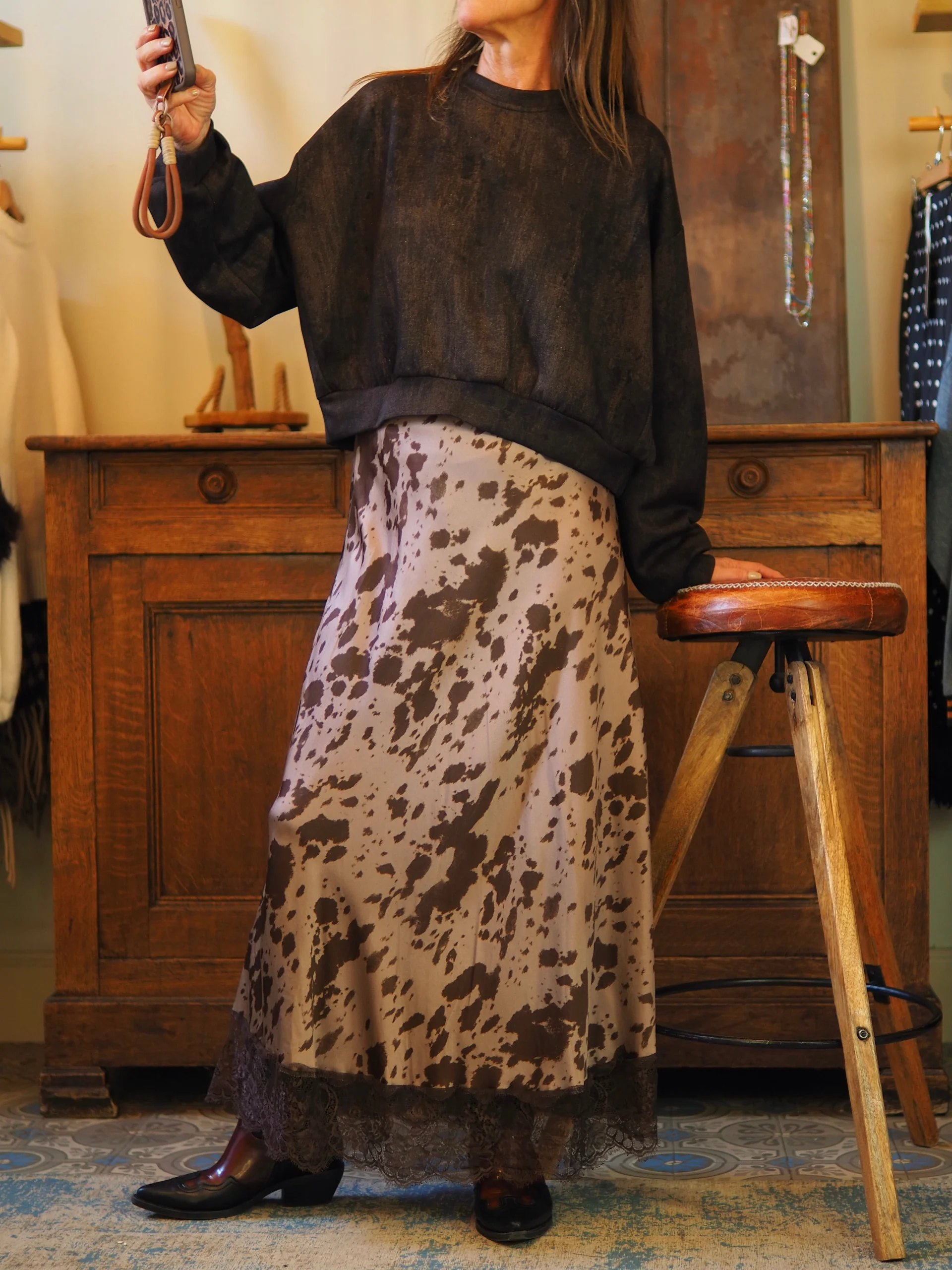 Jupe satin dans les tons chocolats avec dentelles dans le bas. Elastique à la taille.
