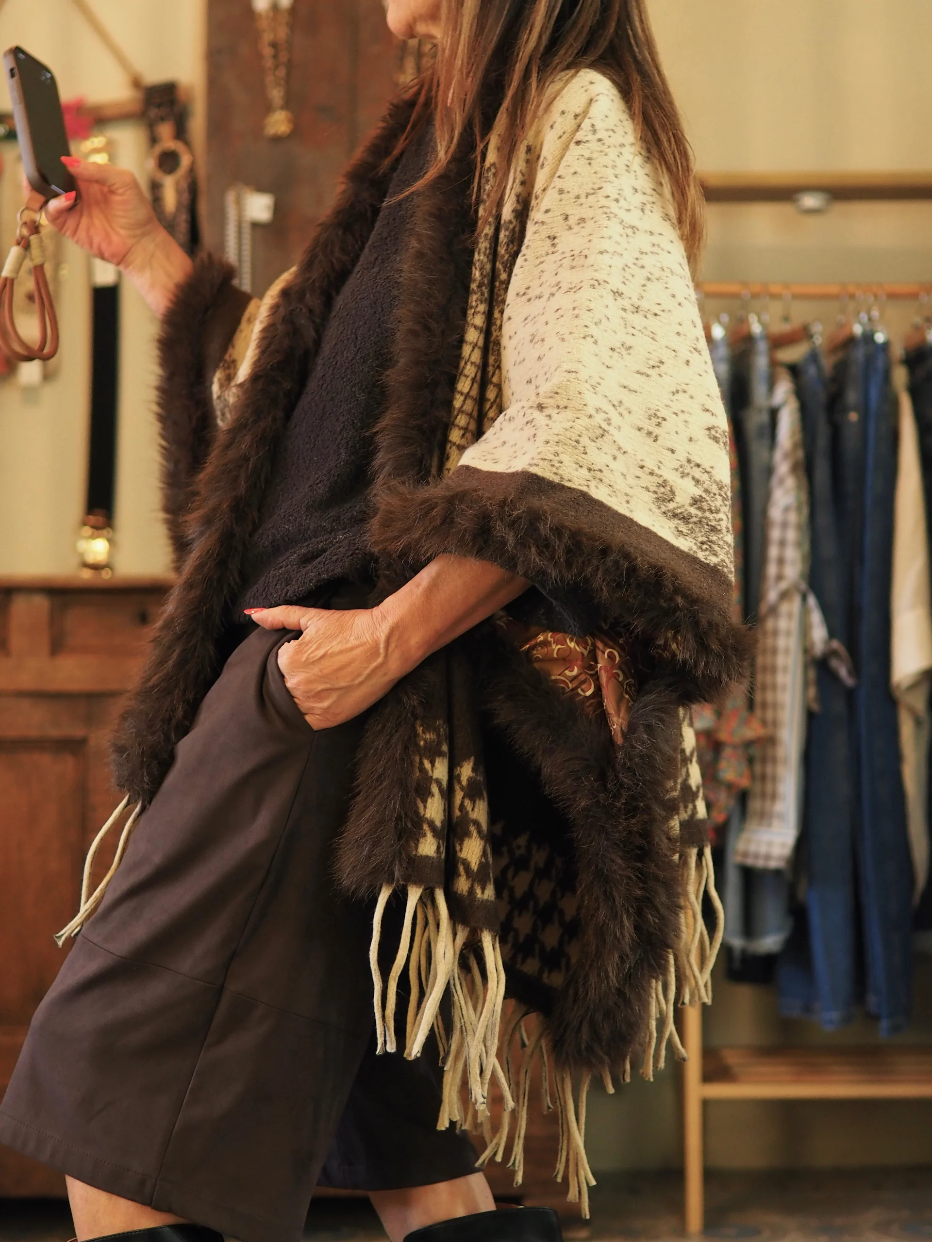 Manteau Cape dans les tons marrons avec doublures satinée fantaisie et fausse fourrure. Une trés belle pièce..