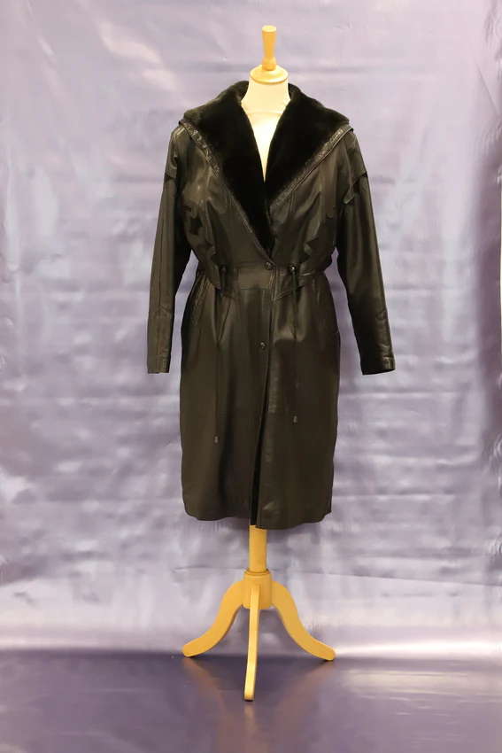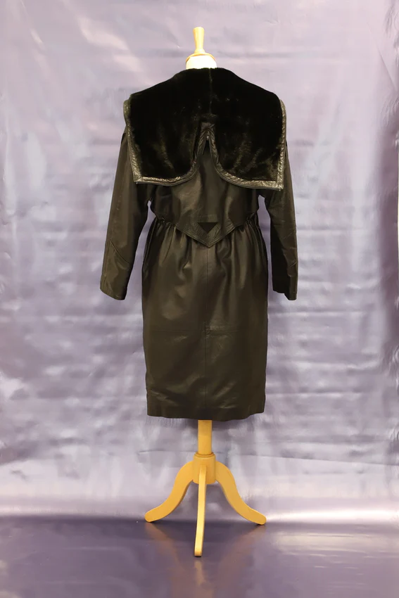 – Manteau 3/4 en cuir noir avec capuche fourrée, liens pour resserrer la taille