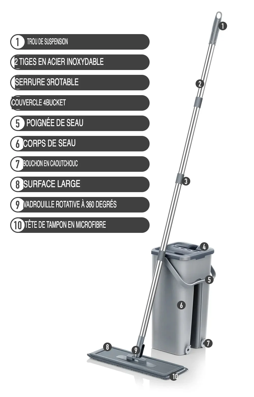 Notre serpillière est équipée d’un système de hauteur réglable qui vous permet d’atteindre facilement chaque recoin et les zones en hauteur. Cette fonctionnalité veille à ce qu’aucun espace ne soit négligé, garantissant un nettoyage minutieux à chaque utilisation.