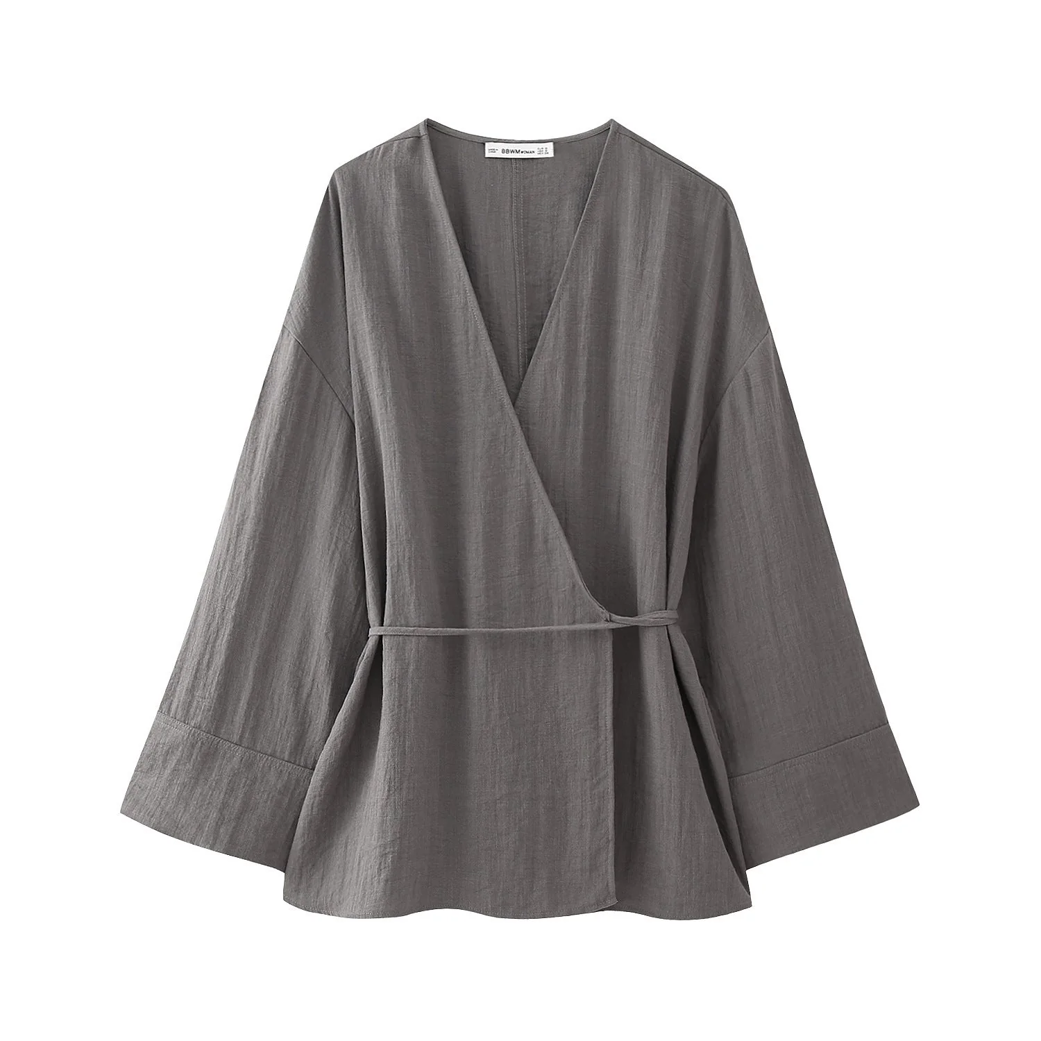 Le haut du kimono présente un cou libre et de larges manches, créant une silhouette élégante et décontractée.