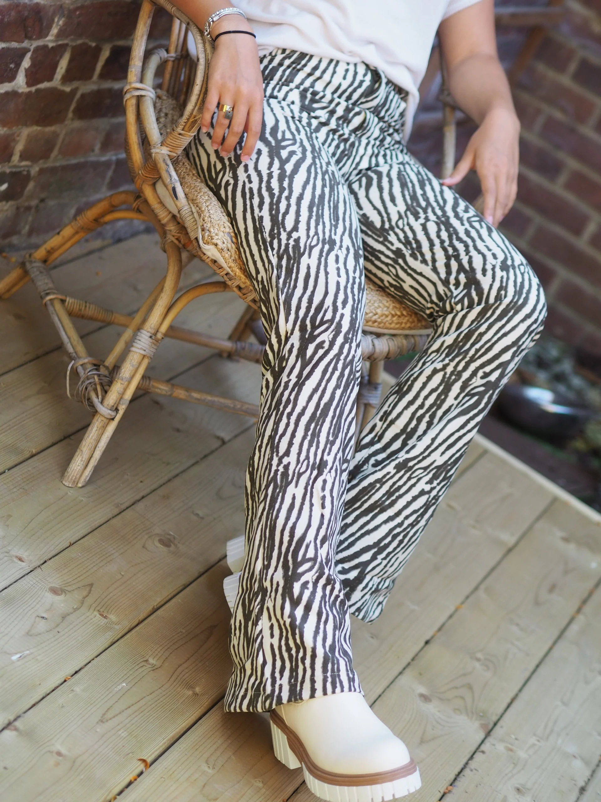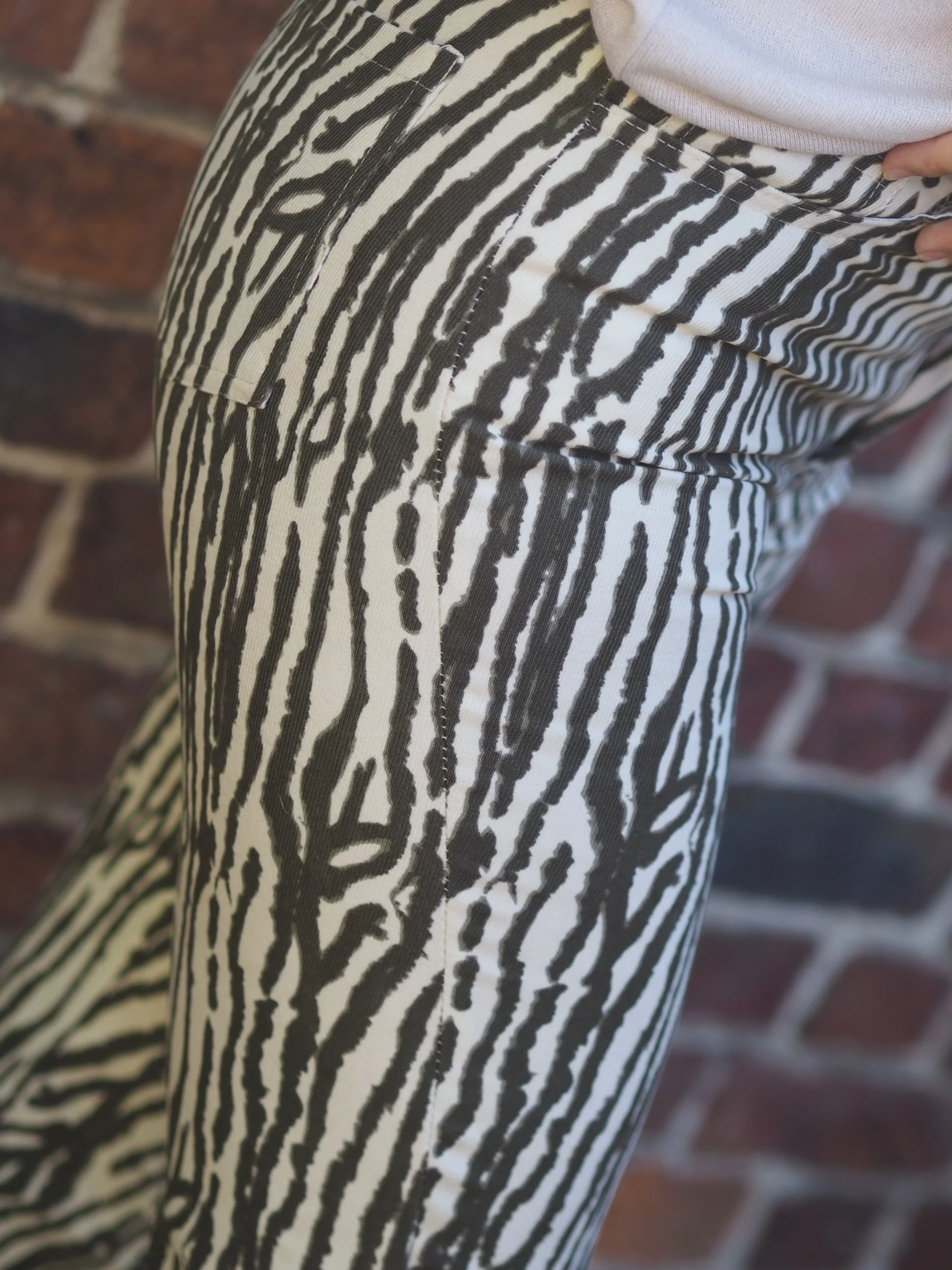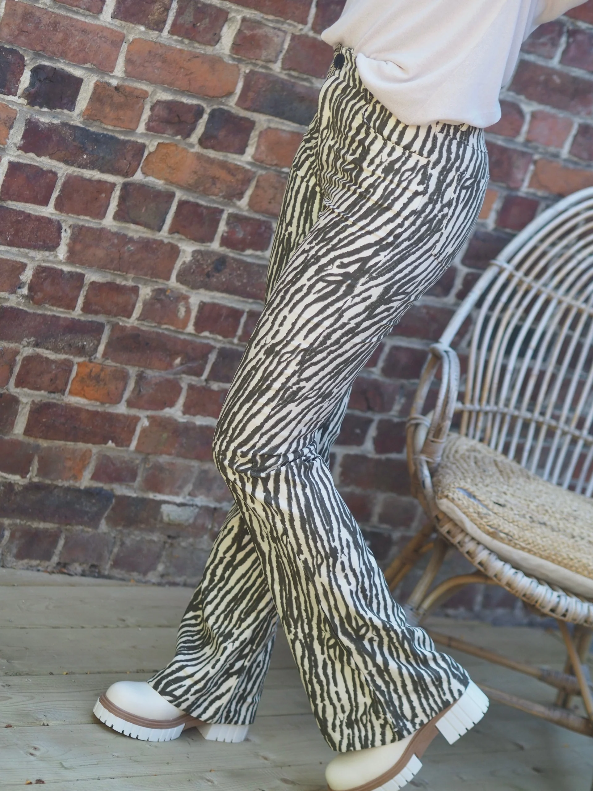 - Pantalon motifs kaki. 2 poches arrières et 2 poches avants. Légèrement évasé dans le bas. Matière douce au touché. Fermeture avant bouton et tirette.