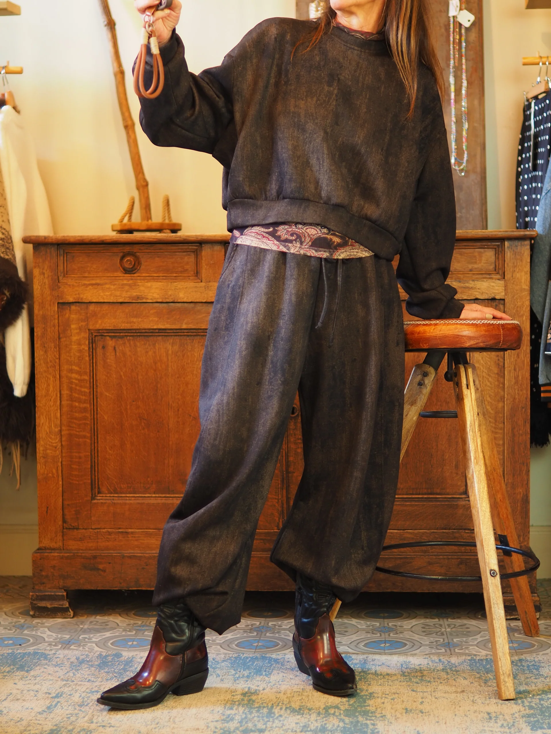 Pantalon jog forme Balloon noir, effet rouille/doré. 2 poches cotés.
