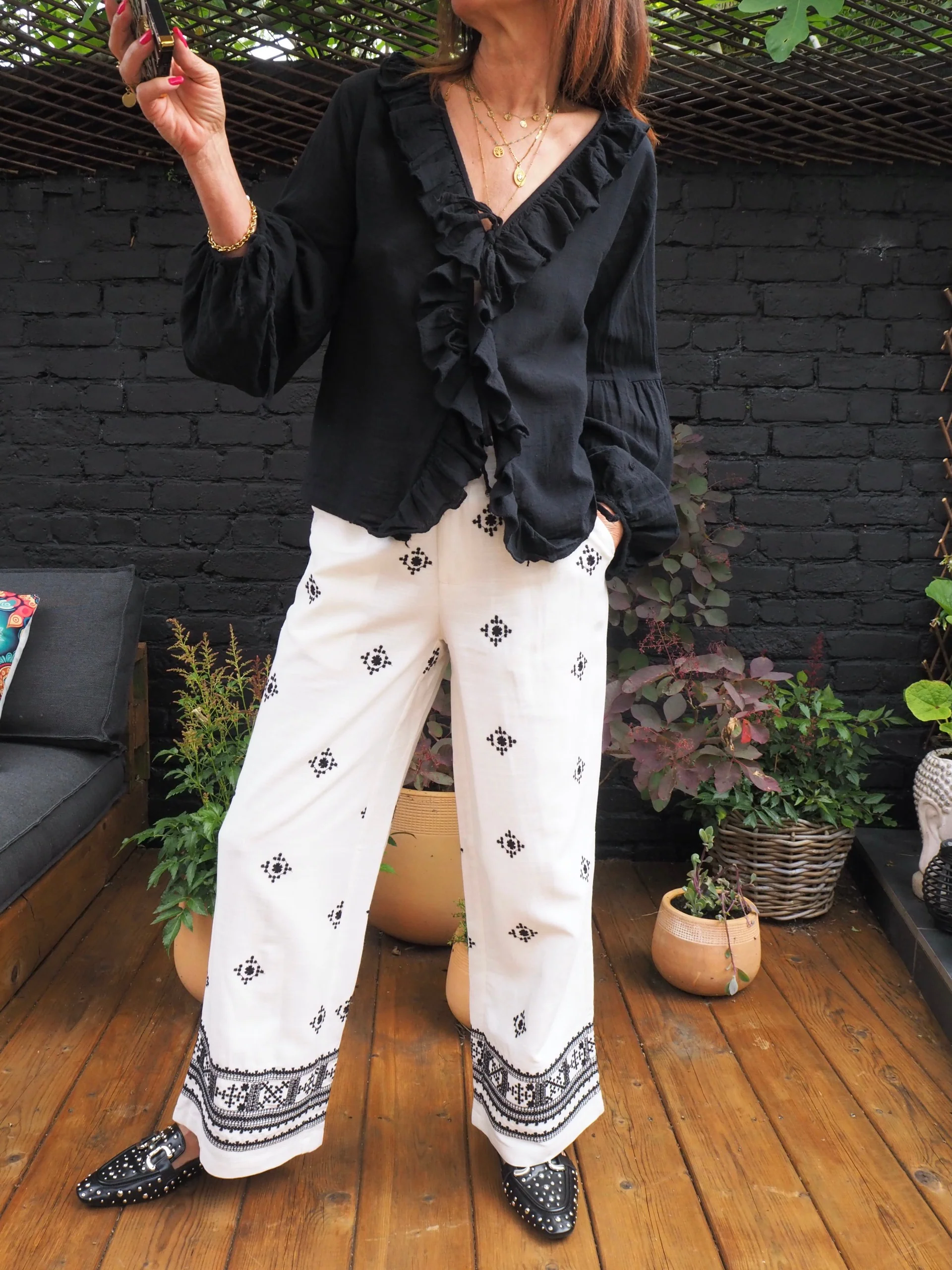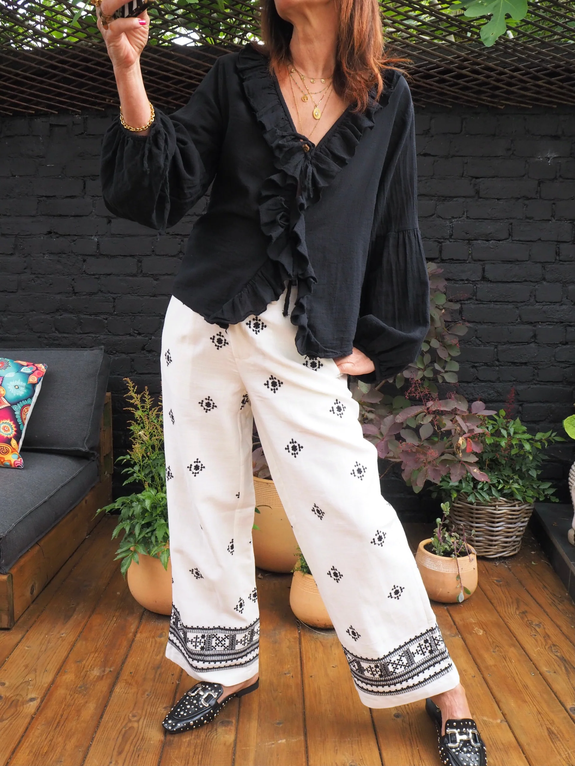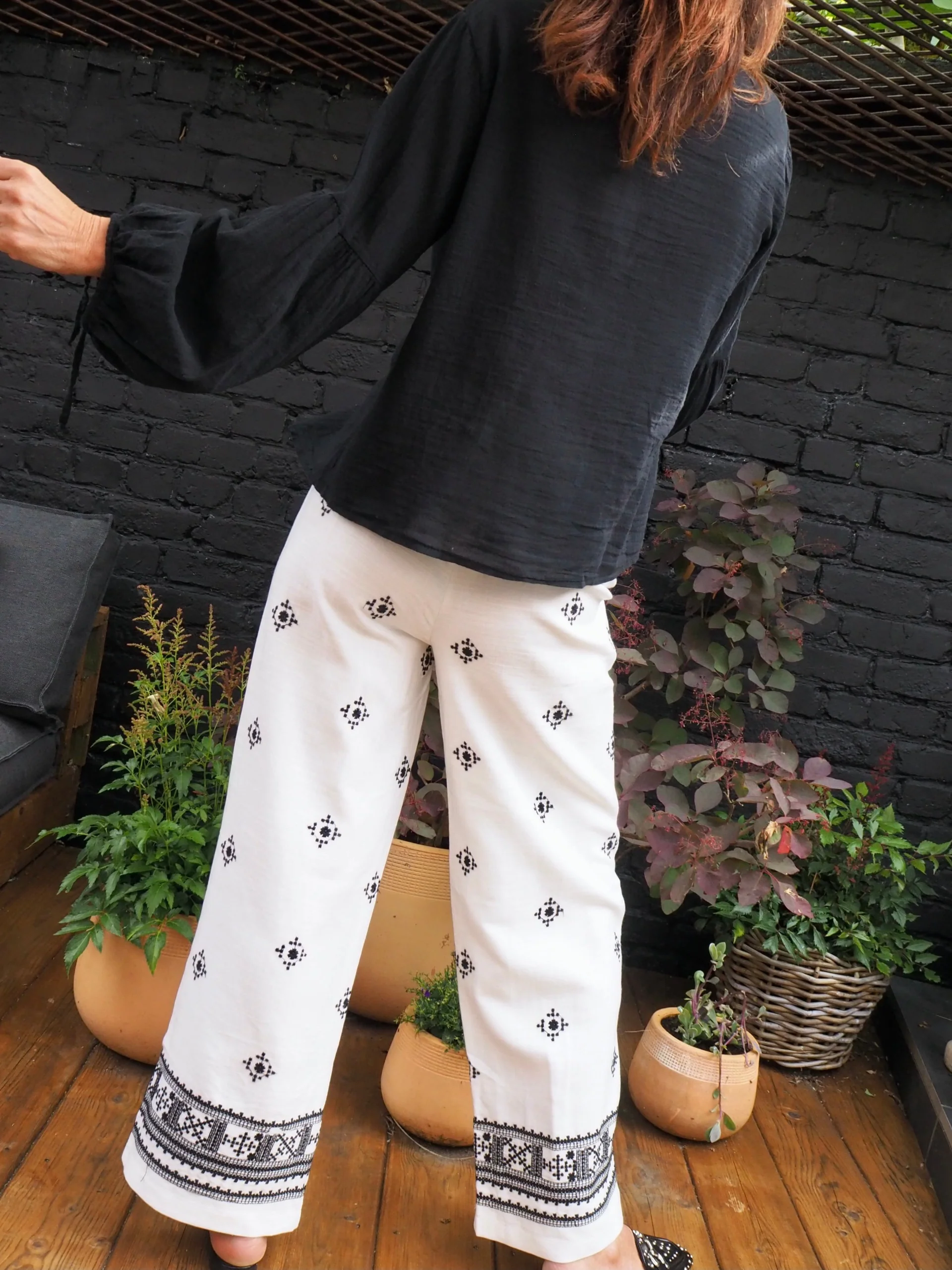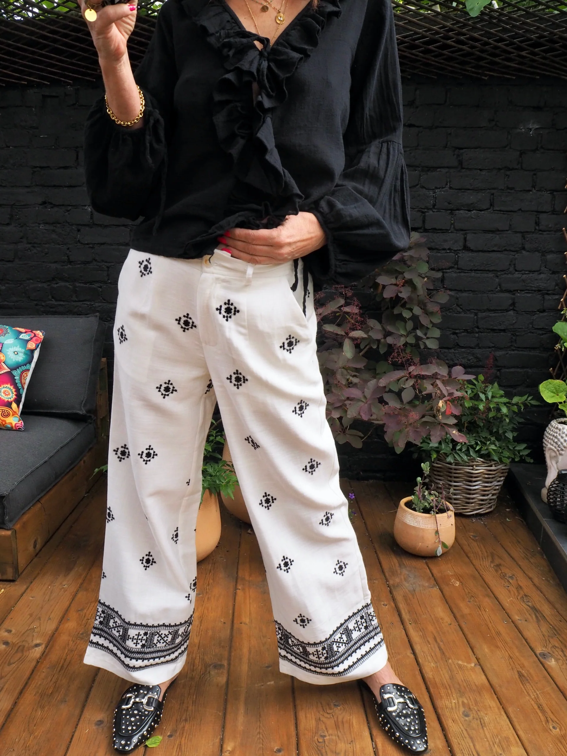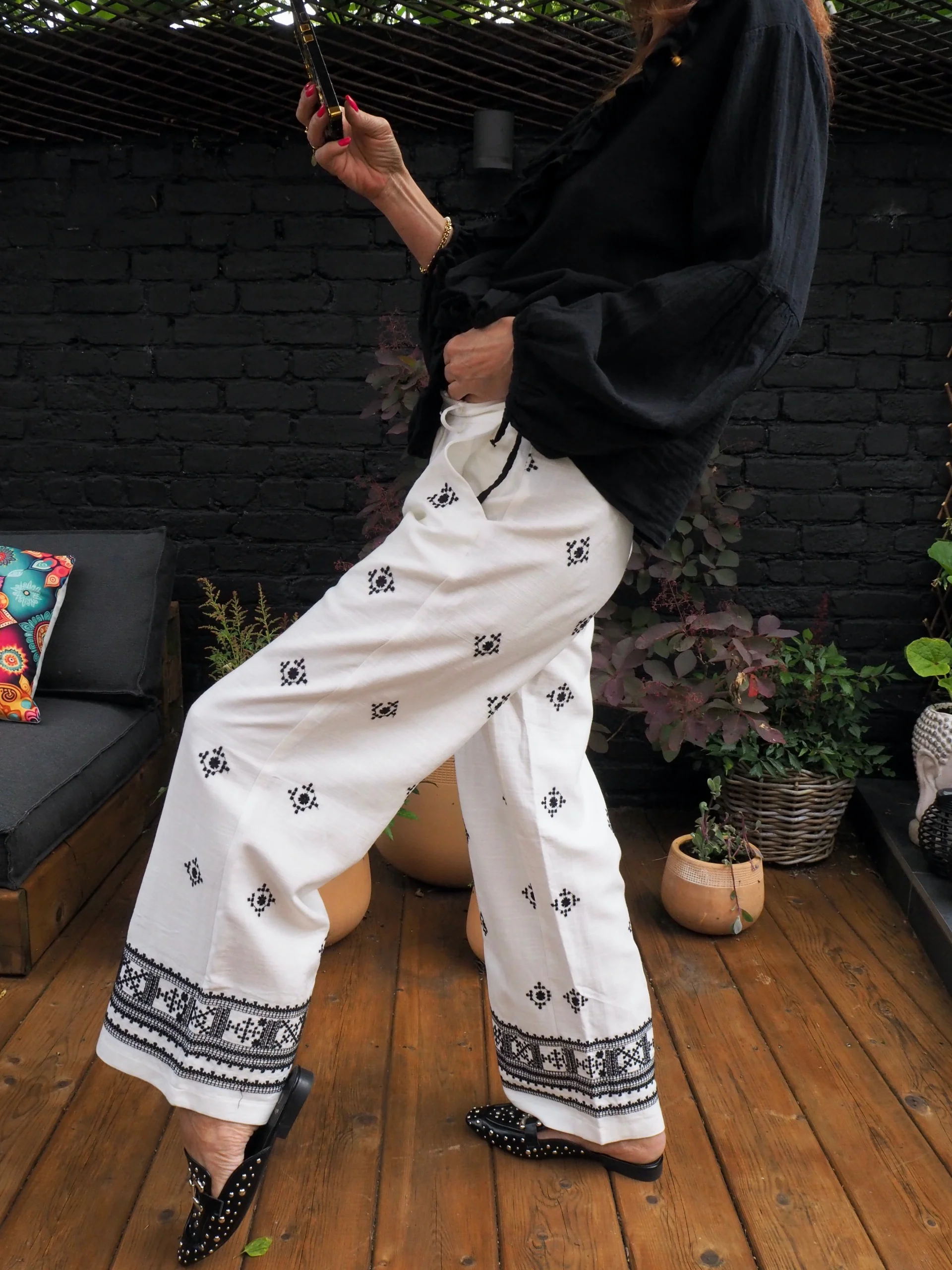 Pantalon coton/lin blanc avec motifs brodés noirs.