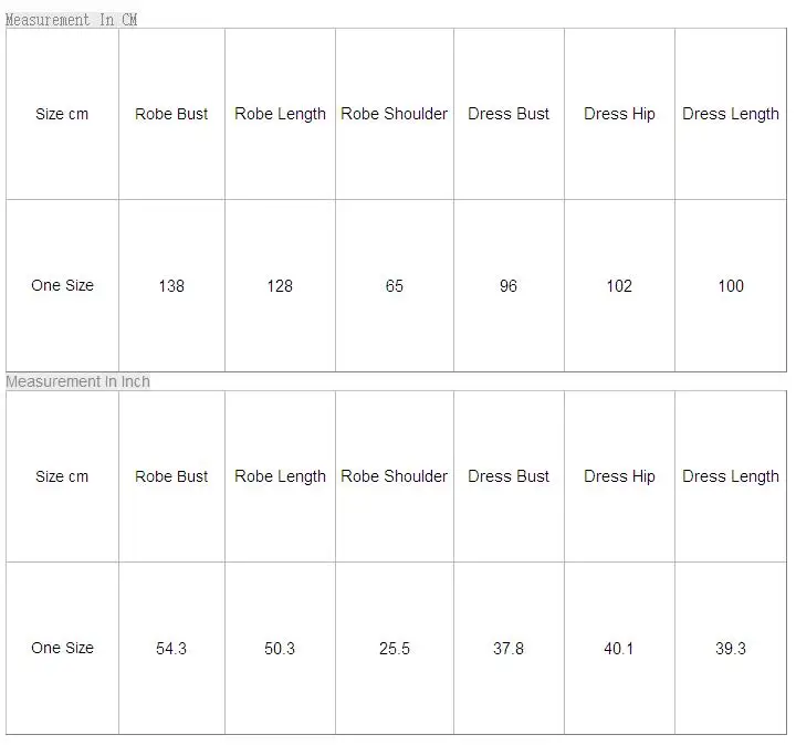 | Taille | Tour de poitrine robe (cm) | Longueur robe (cm) | Largeur d’épaules robe (cm) | Tour de poitrine robe courte (cm) | Tour de hanches robe courte (cm) | Longueur robe courte (cm) |