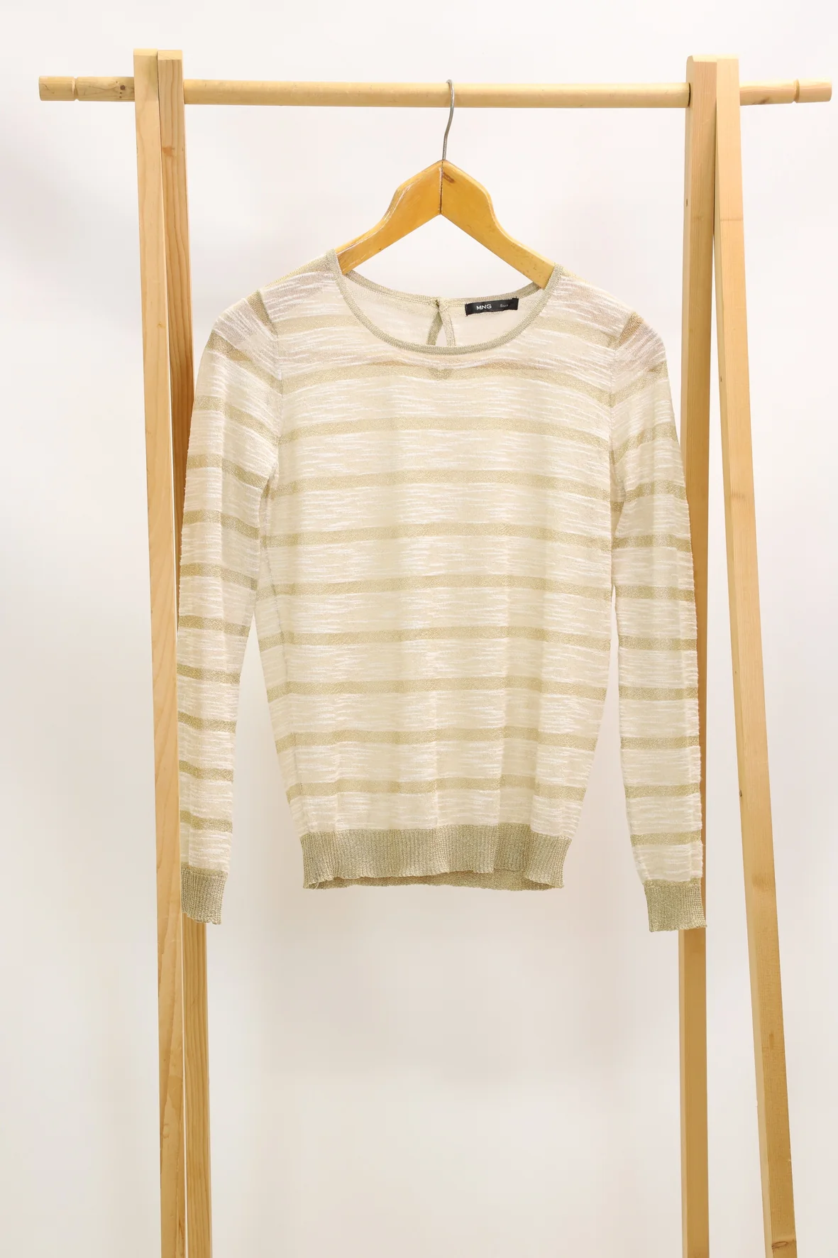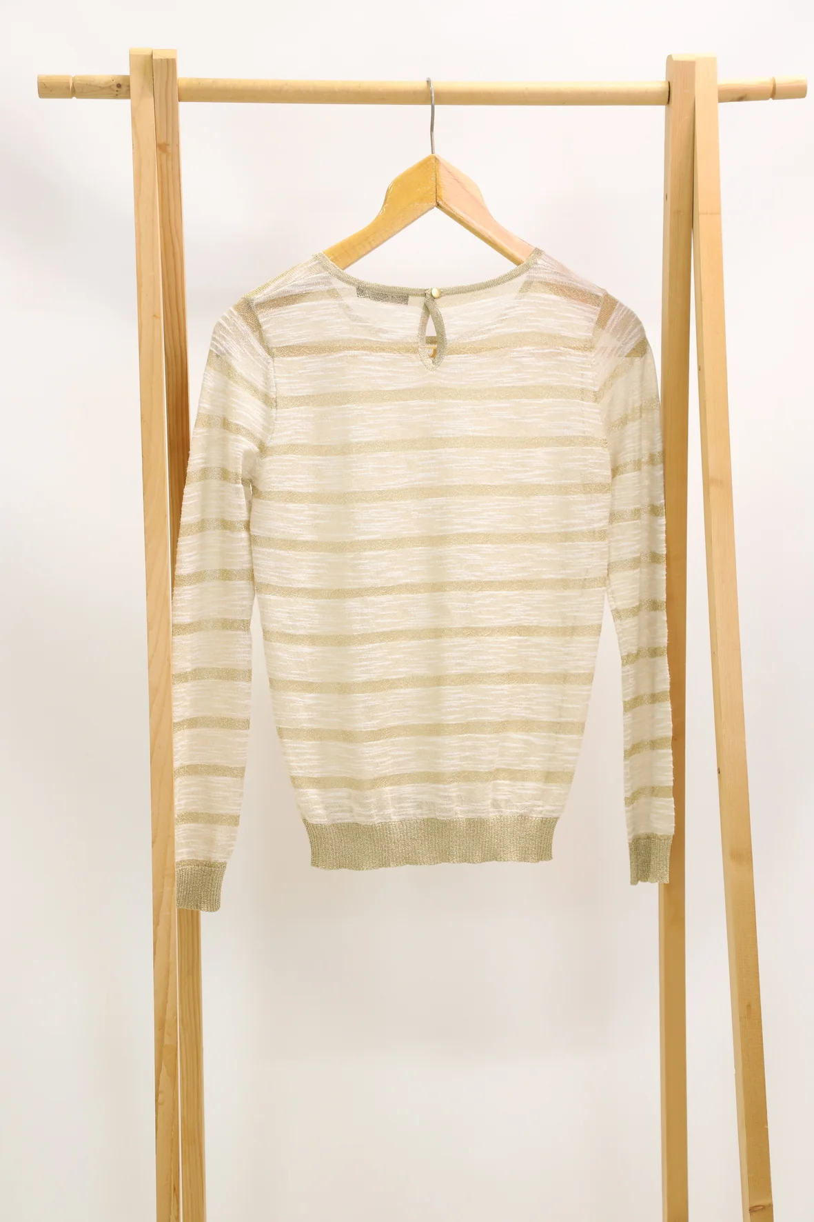 | DESCRIPTIF | Pull fin rayé beige et doré, col rond, petit bouton dans le dos |