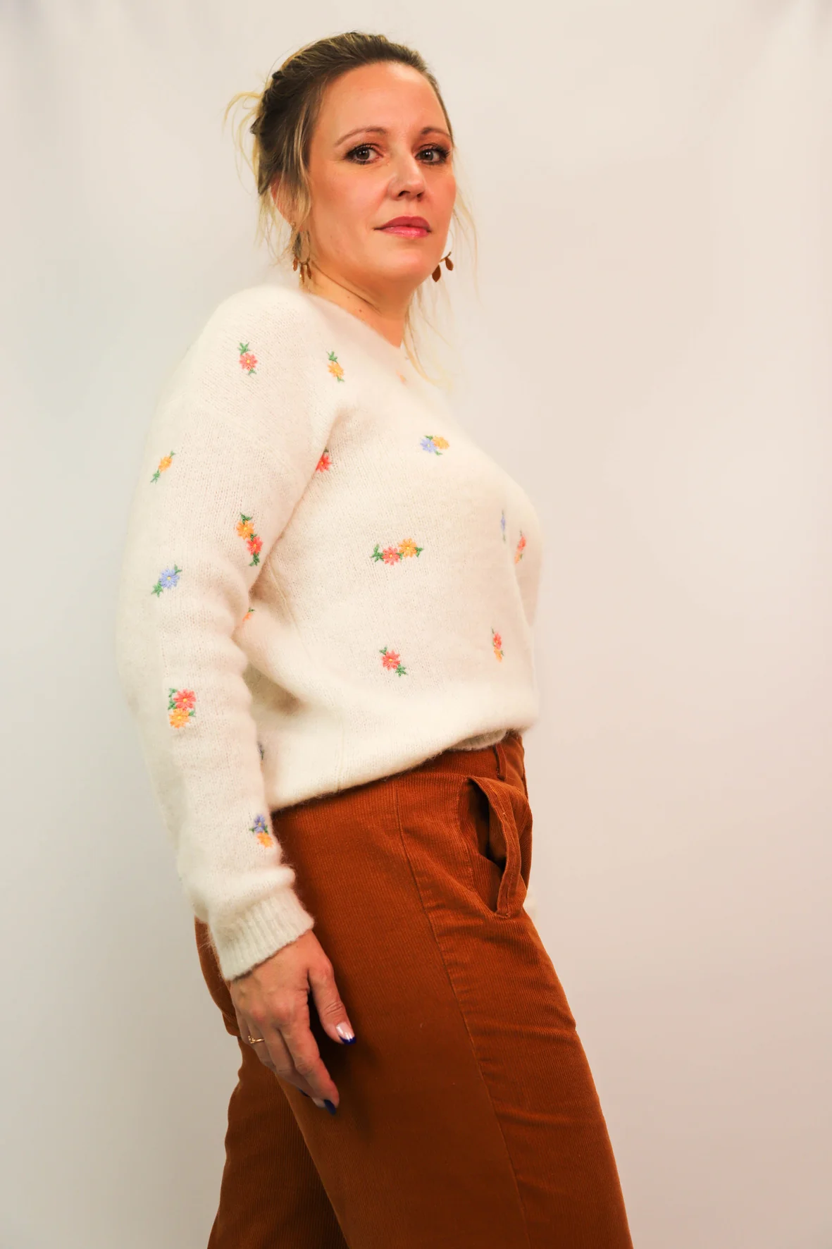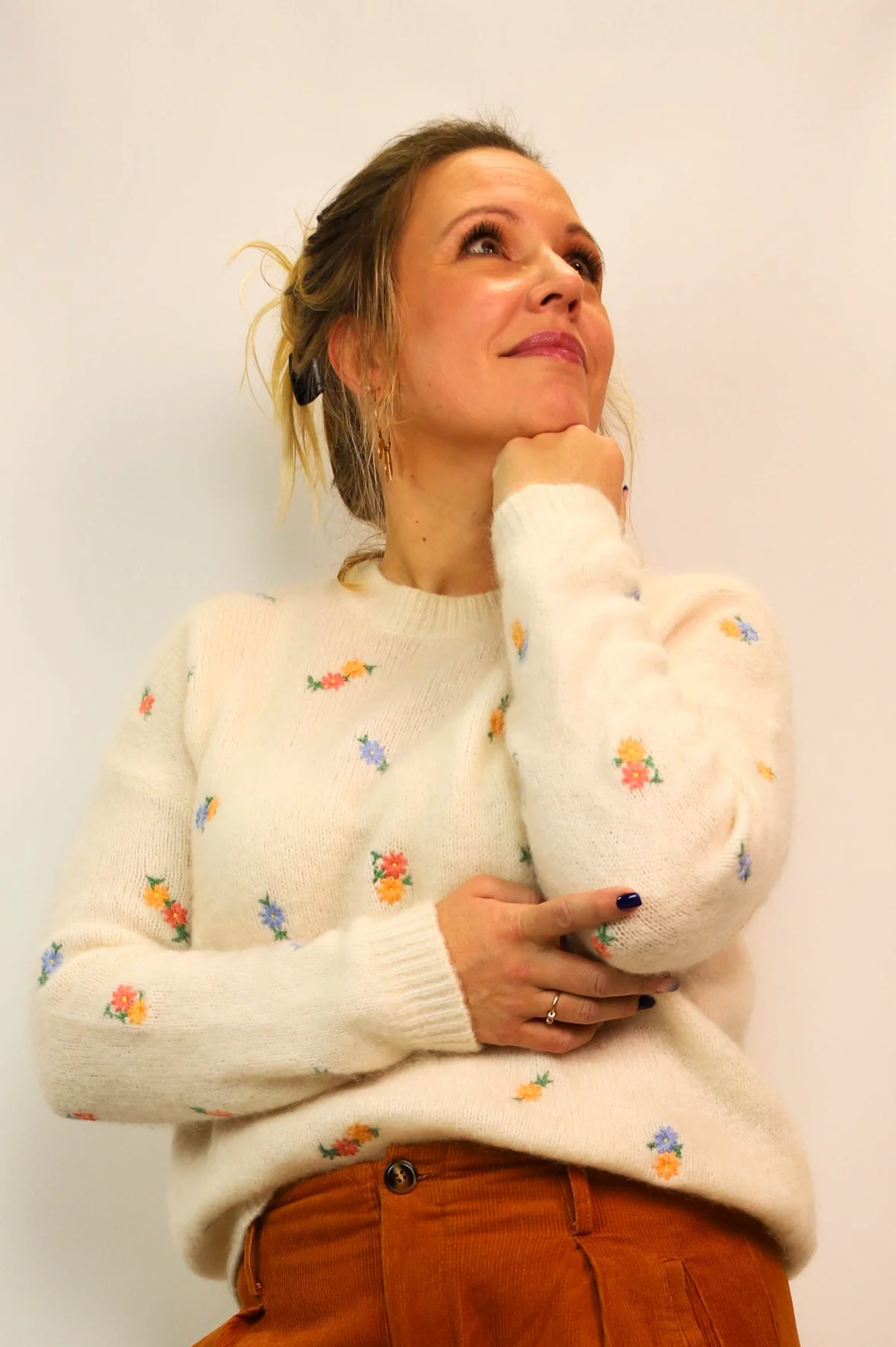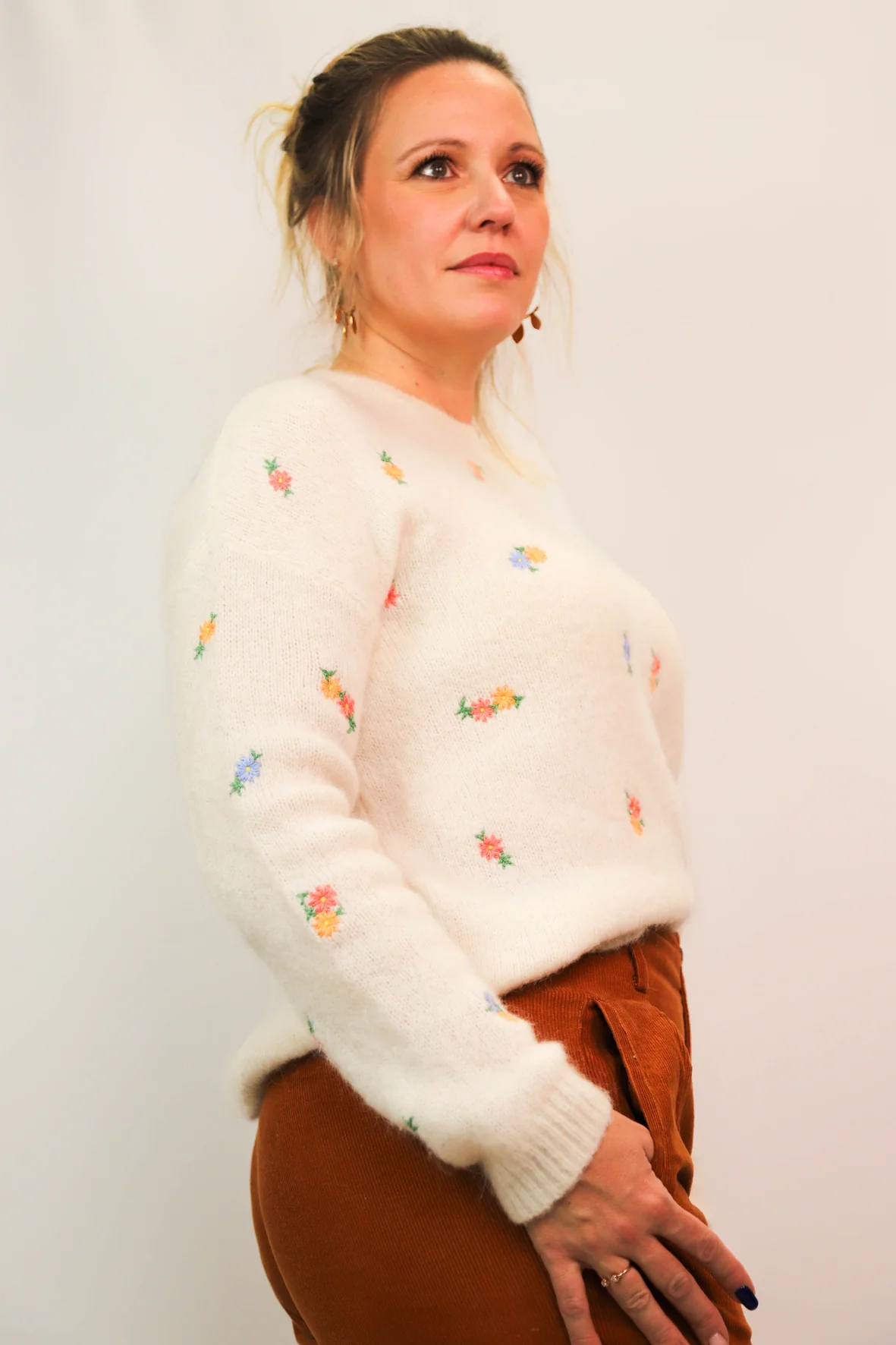 | DESCRIPTIF | Pull avec petites fleurs de couleurs brodées |