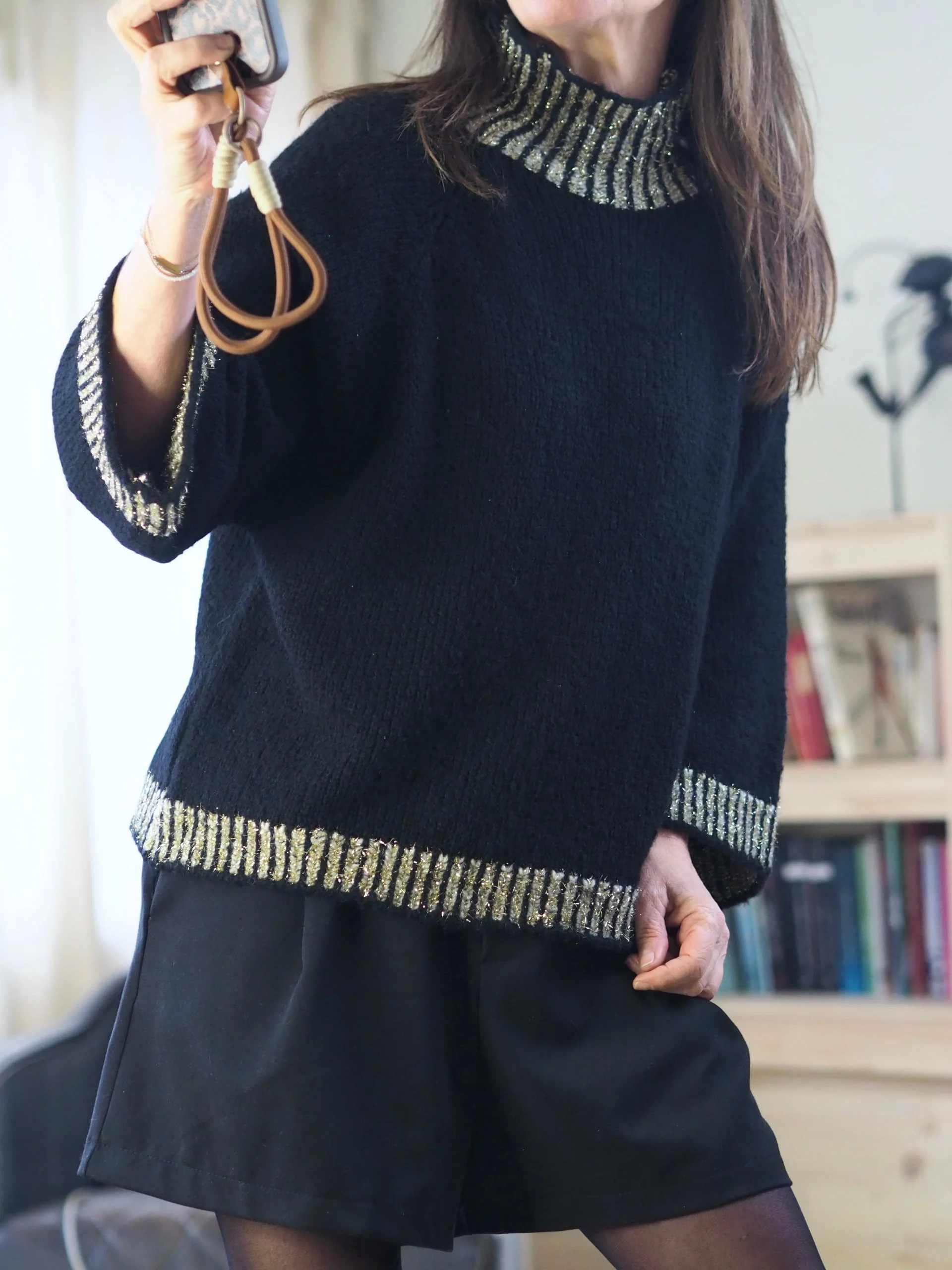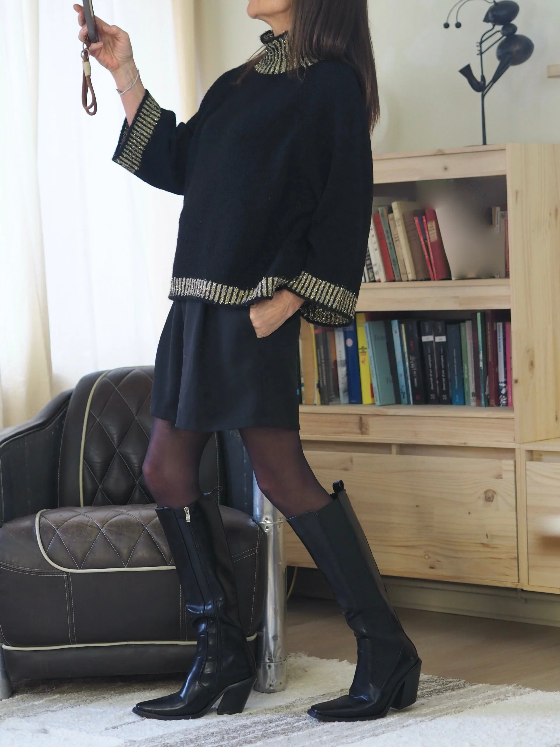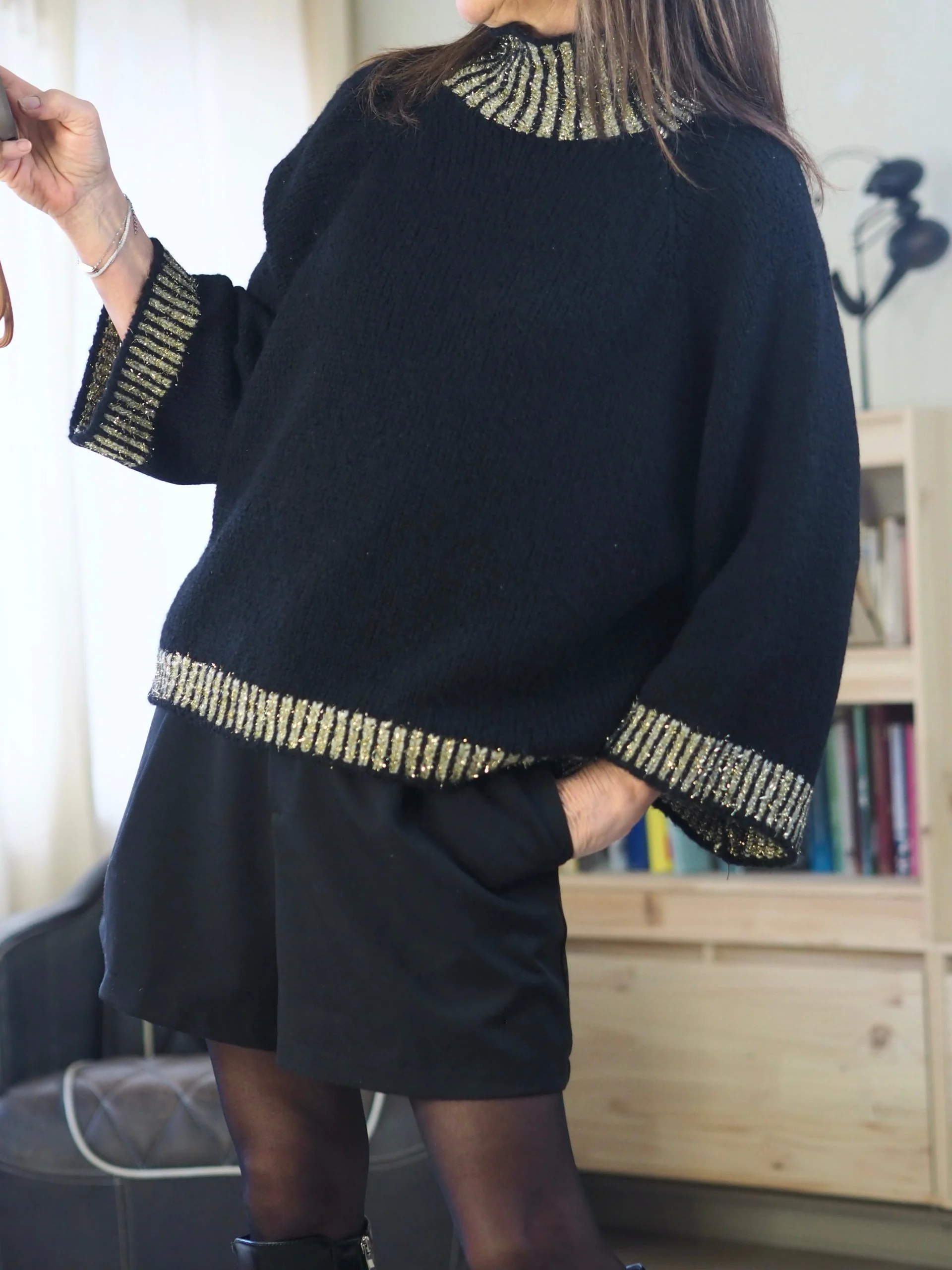 Pull noir. Col, manches et bas doré. Coupe droite.