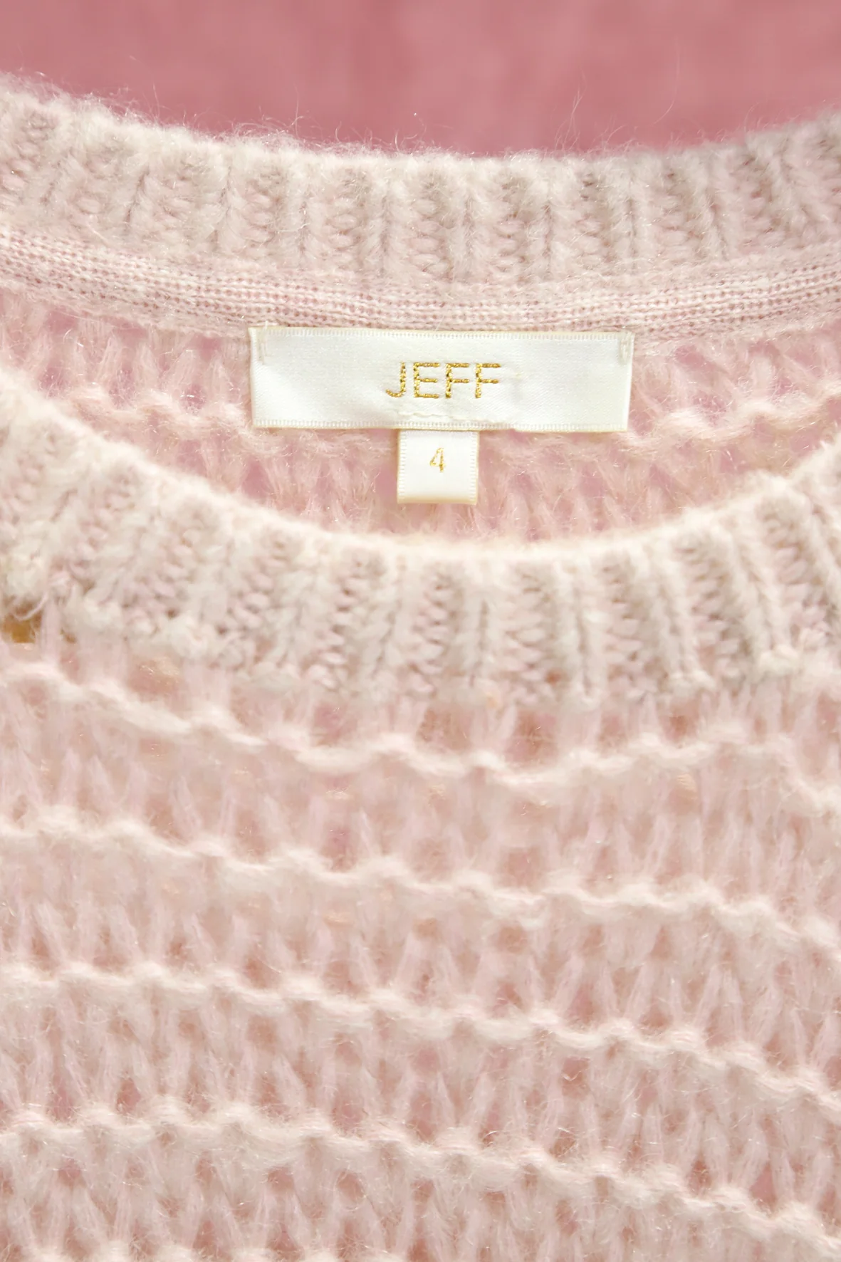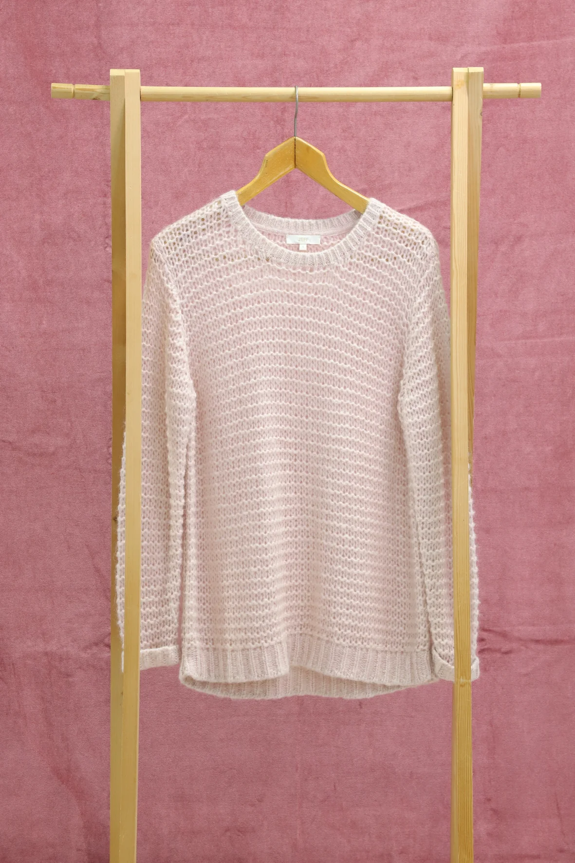 -Pull long col rond rose poudré ajouré, déjà porté, présente de légères bouloches