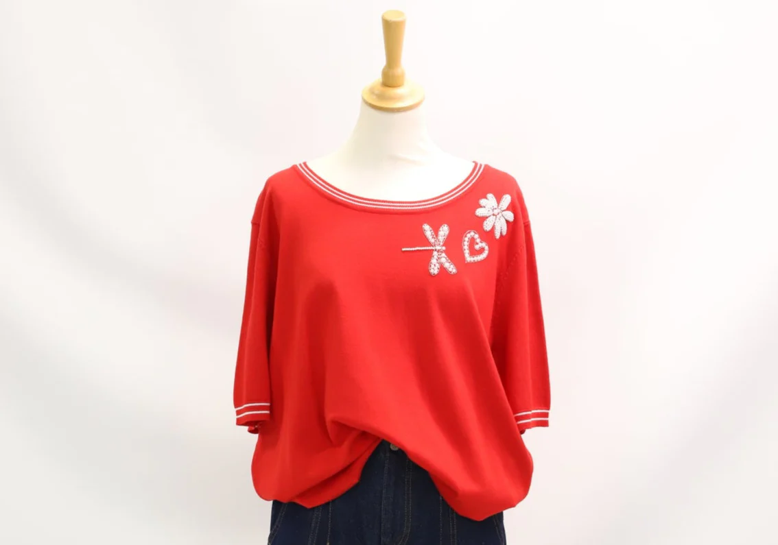DESCRIPTIF Pull manches courtes, col rond, motifs en perles sur la poitrine