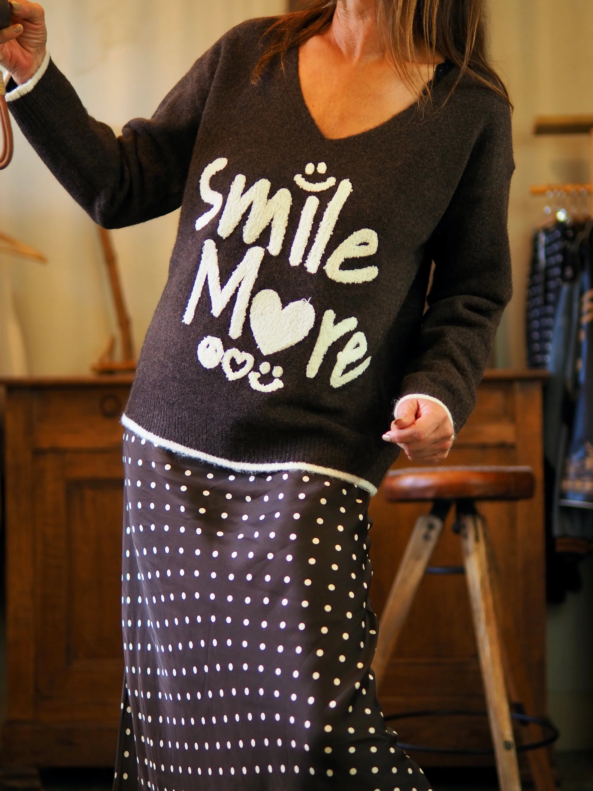 Pull marron avec flocage écru.