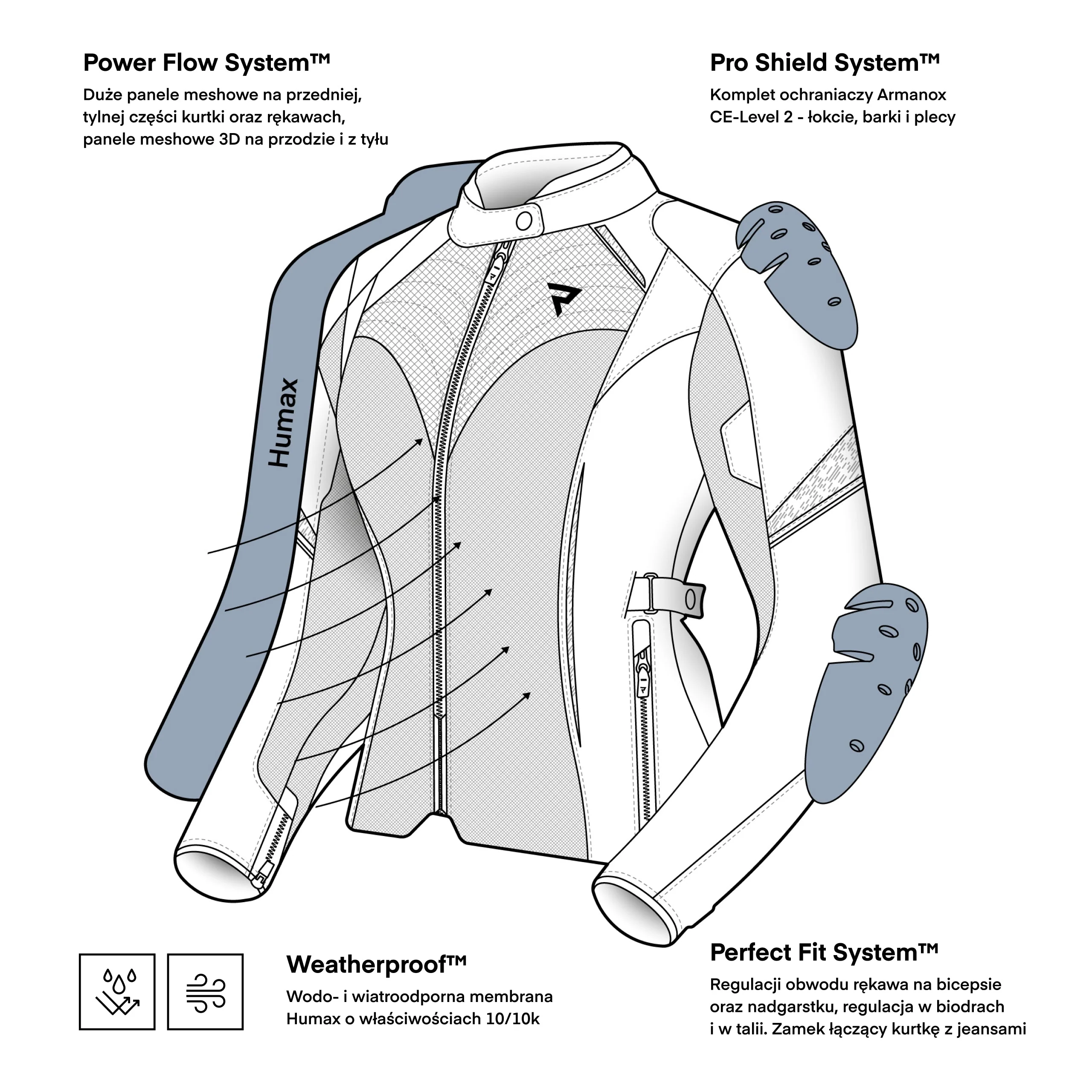 Fabriquée en cuir de vachette souple associé à un matériau extensible dans quatre directions et à un gilet coupe-vent supplémentaire, elle offre une excellente protection, un confort optimal et une ergonomie avancée.