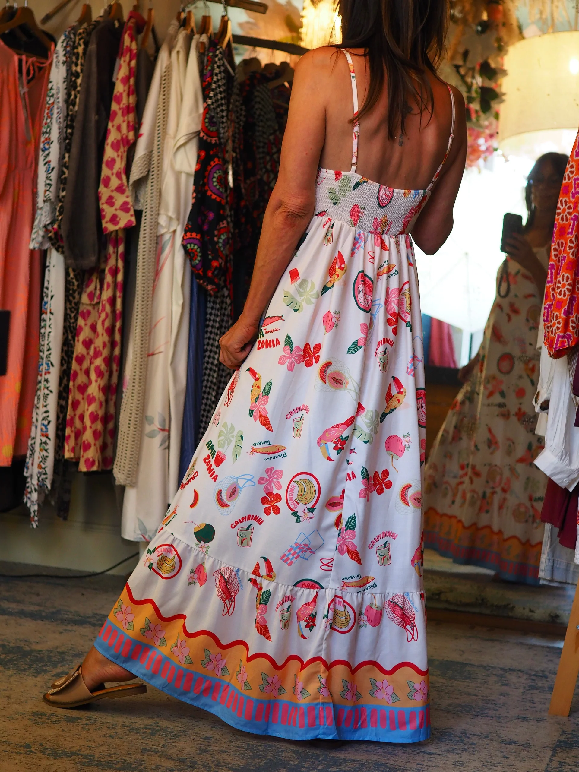 Superbe robe écru et motifs .Dos élastique. Bretelles réglables.