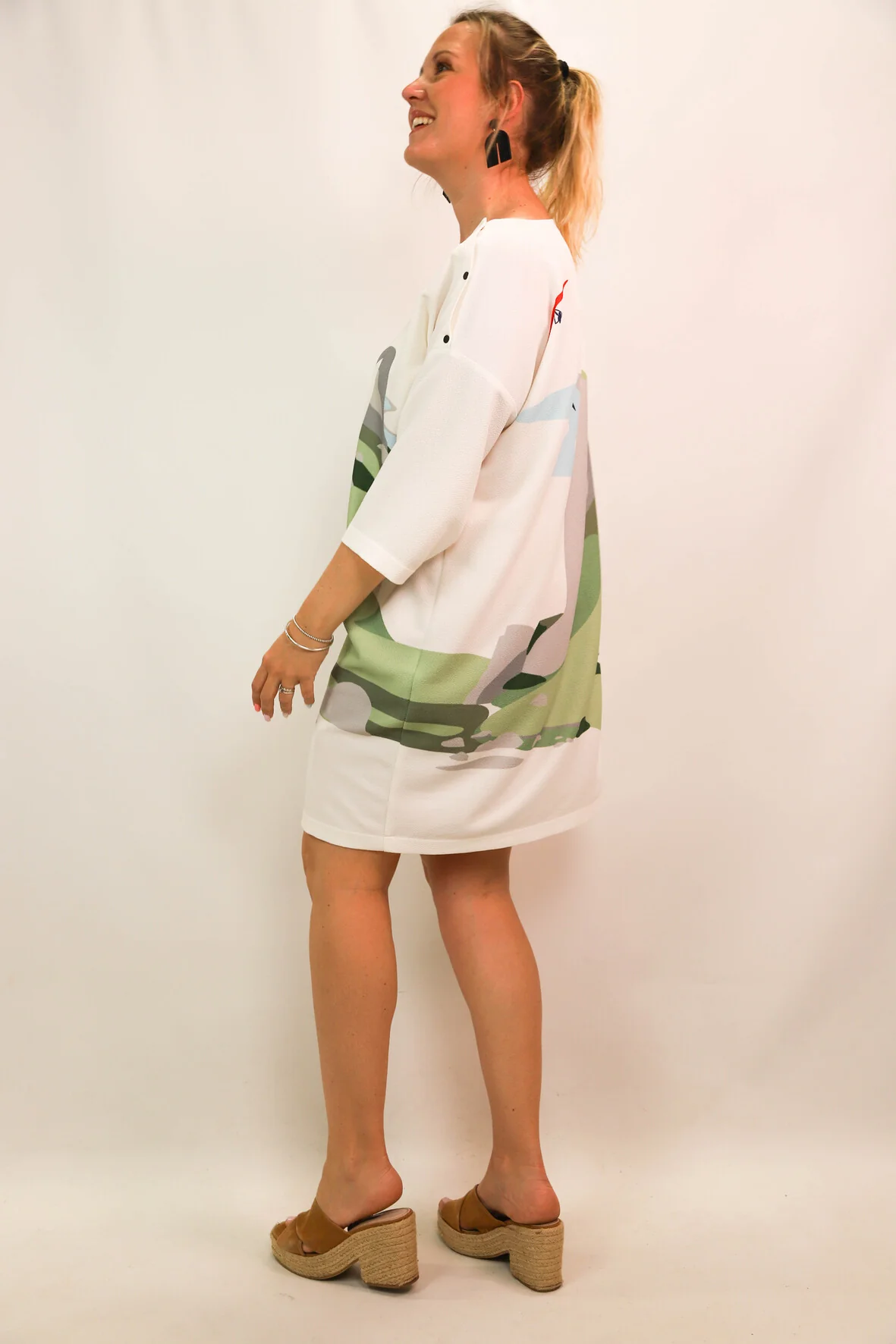 DESCRIPTIF Robe midi, coupée droite, avec illustration sur l’avant