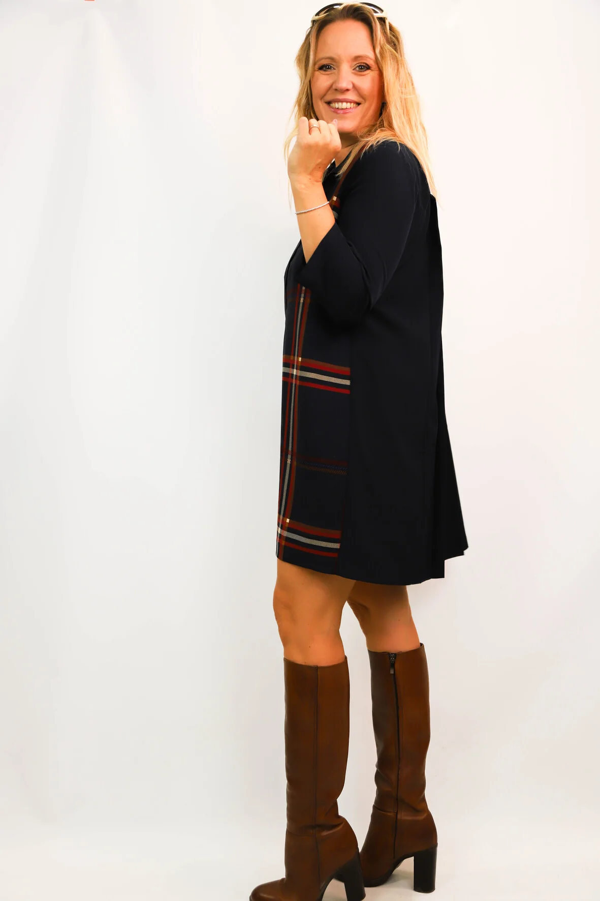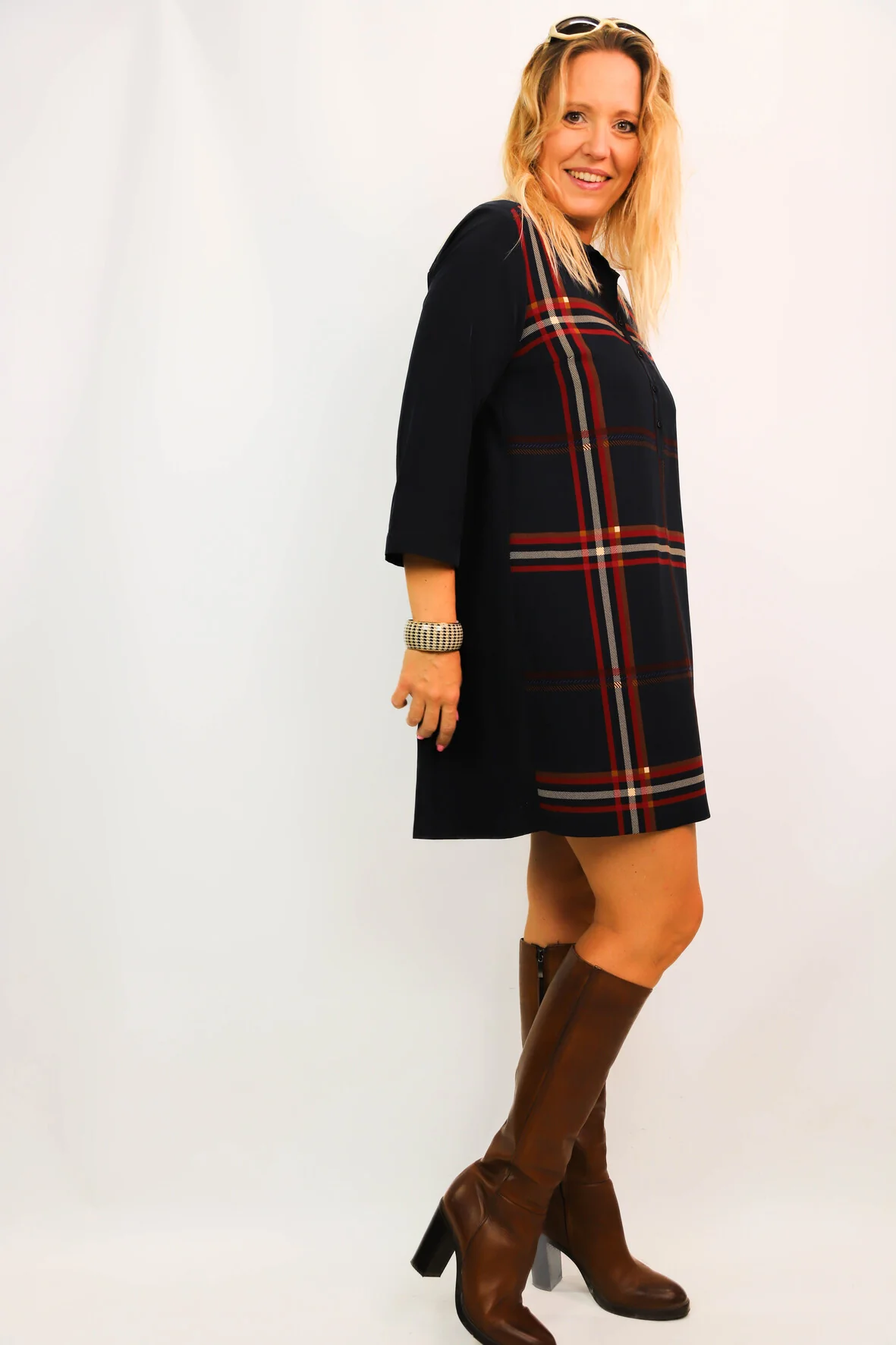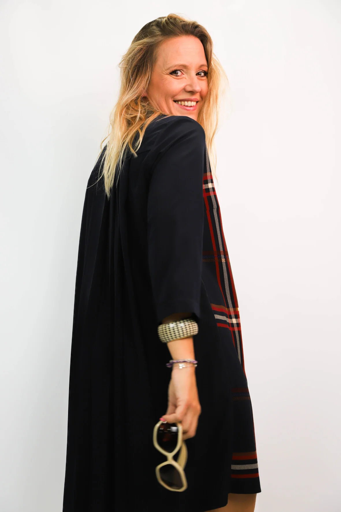 Robe à carreaux sur l’avant et unie avec effet plissé à l’arrière. Manches trois quart et boutons au col