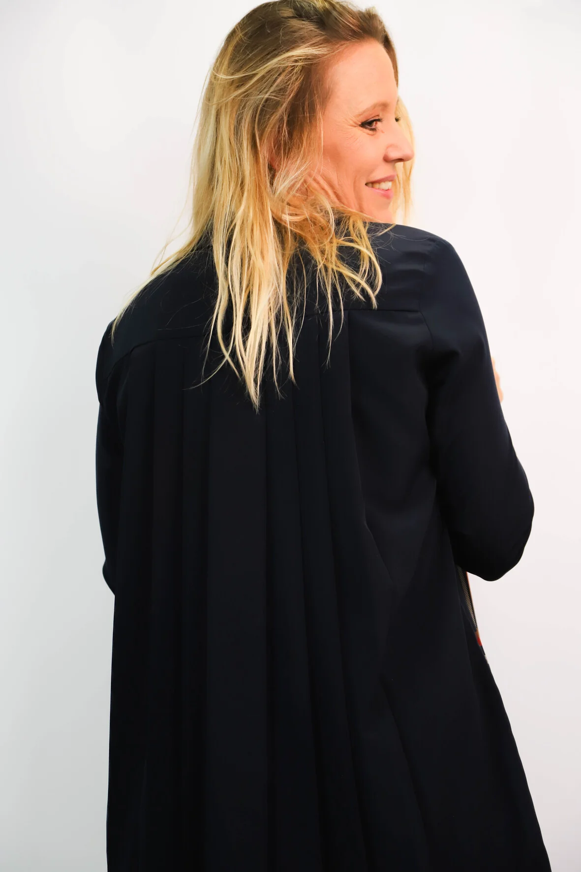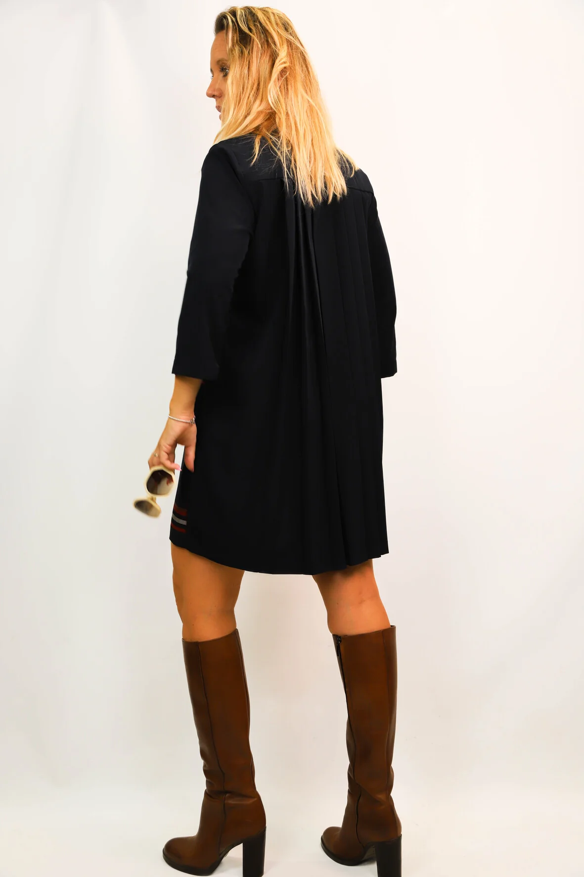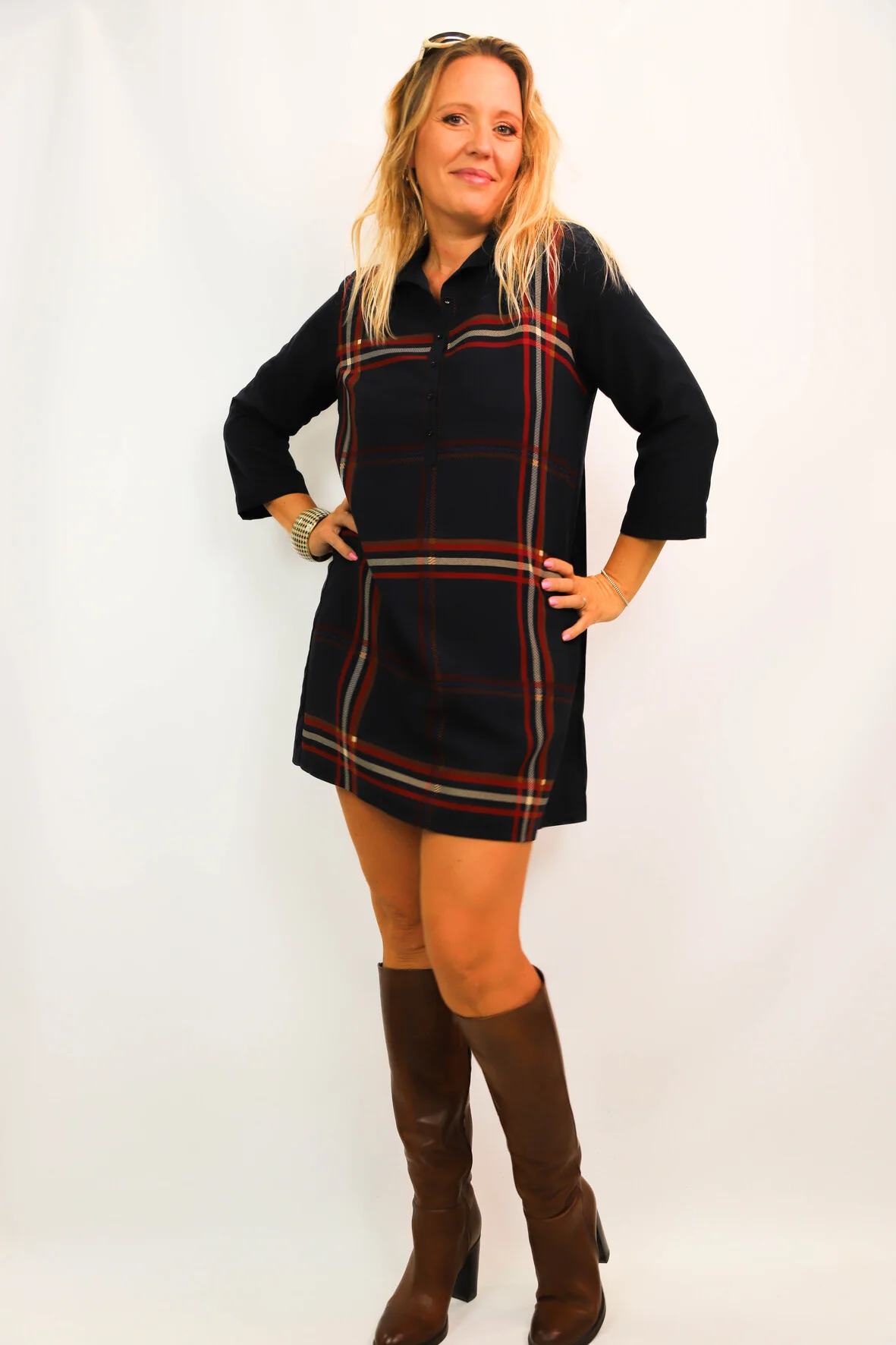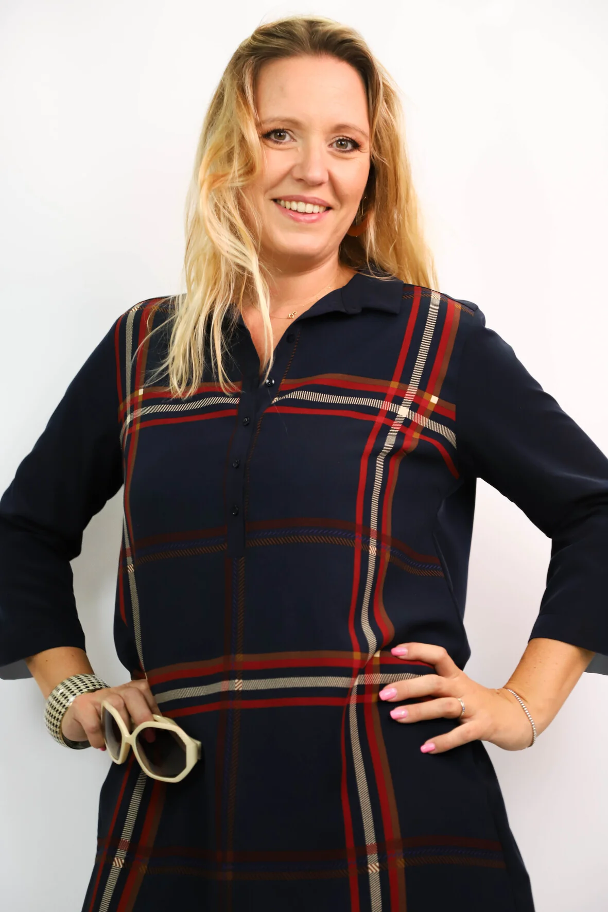 Robe à carreaux sur l’avant et unie avec effet plissé à l’arrière. Manches trois quart et boutons au col