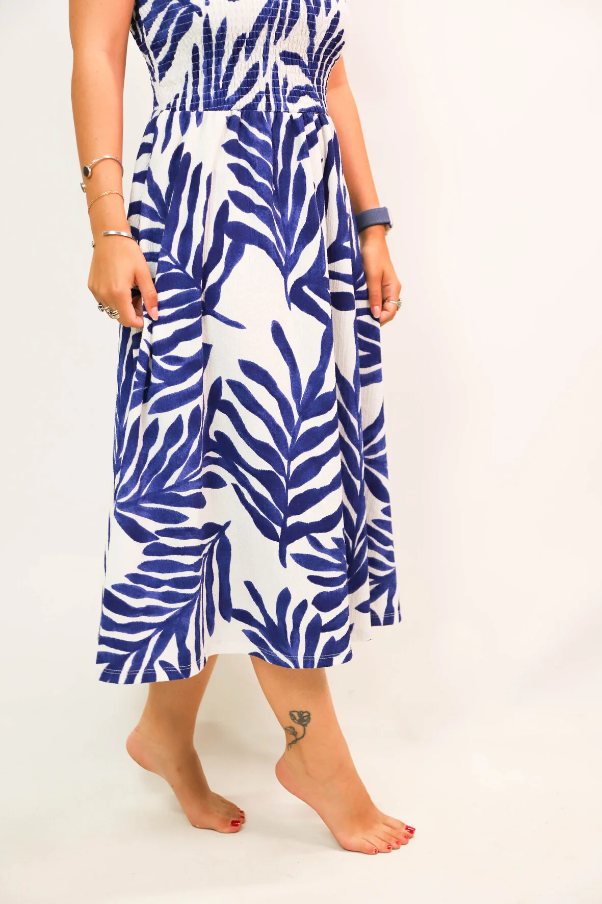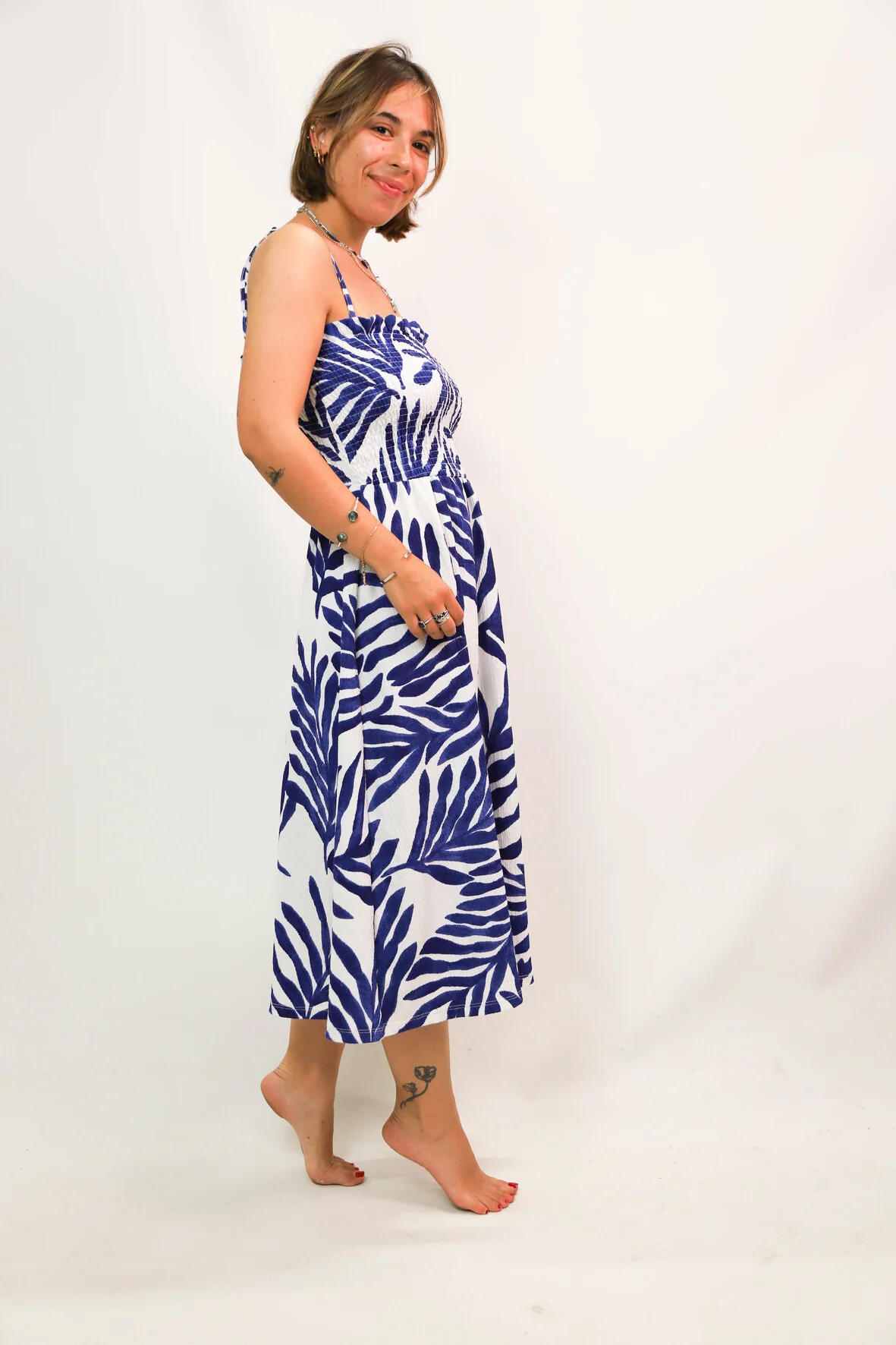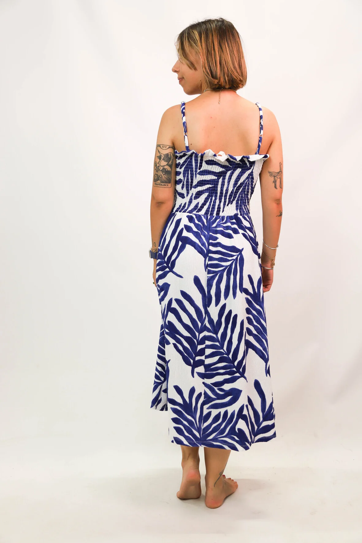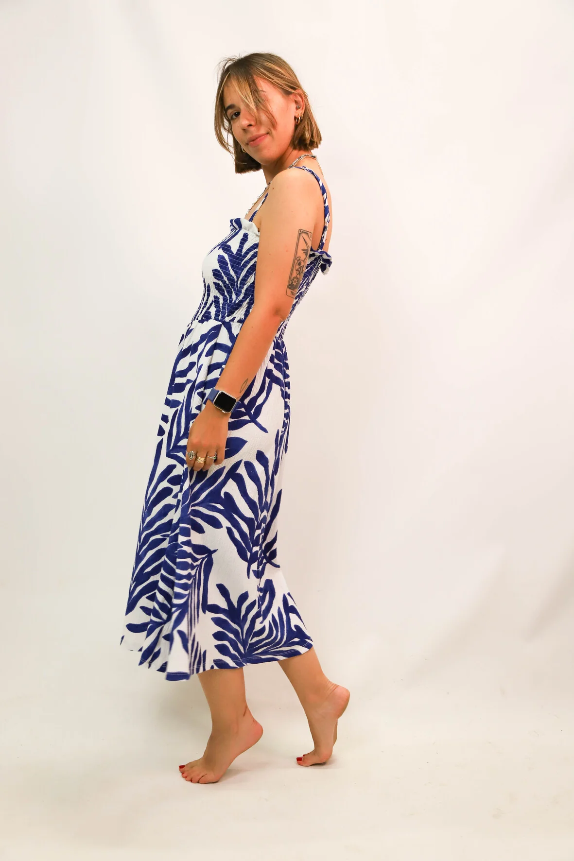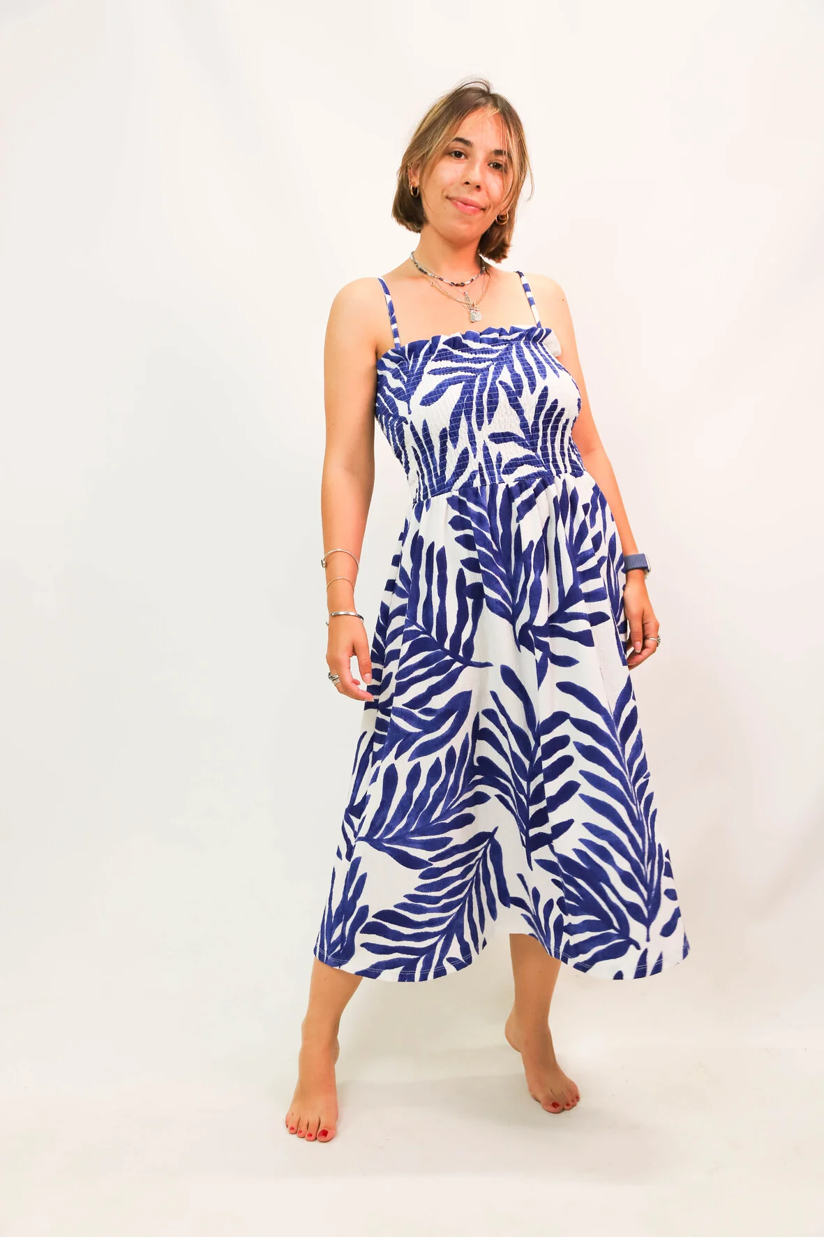 DESCRIPTIF Robe à bretelles réglables. Motif feuille bleue. Smock à la poitrine