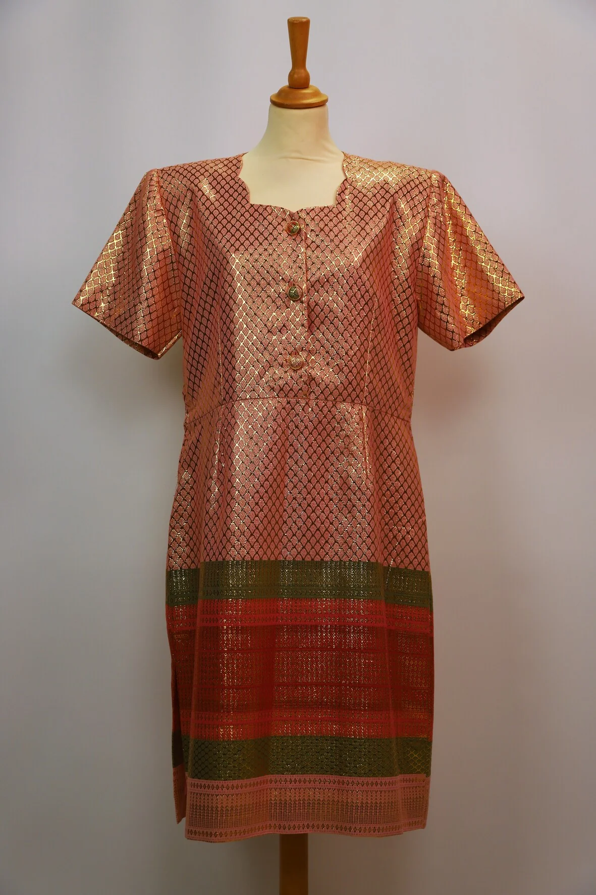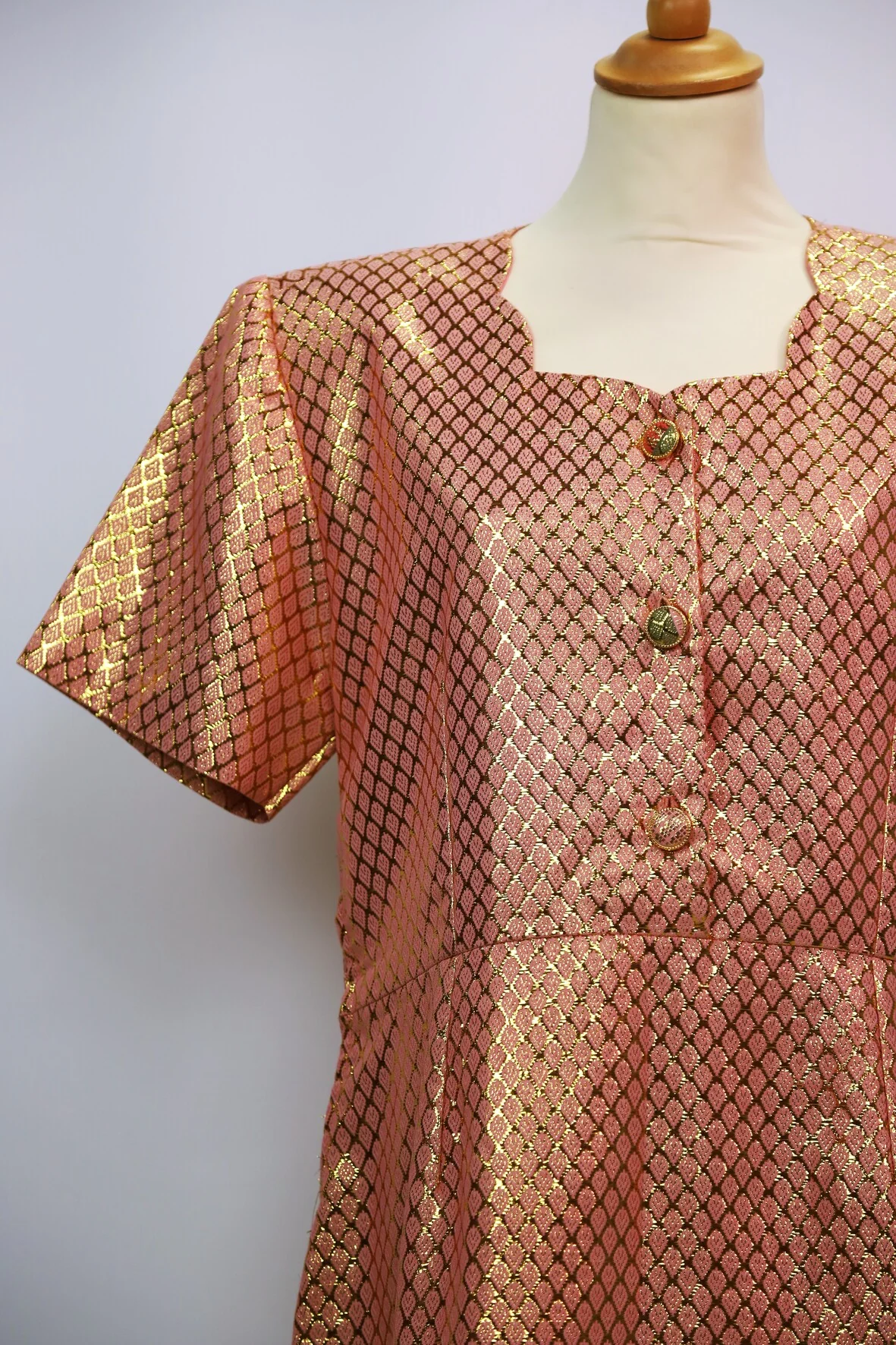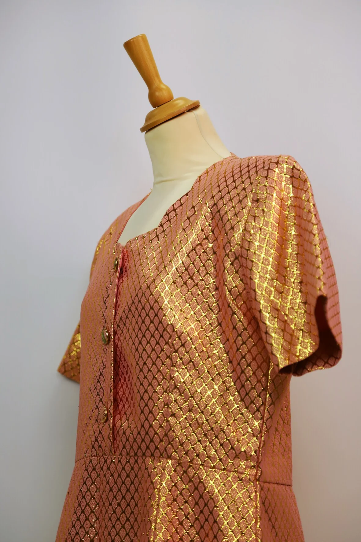 | DESCRIPTIF | Robe manches courtes avec épaulettes. Camaïeu de roses et motif doré |