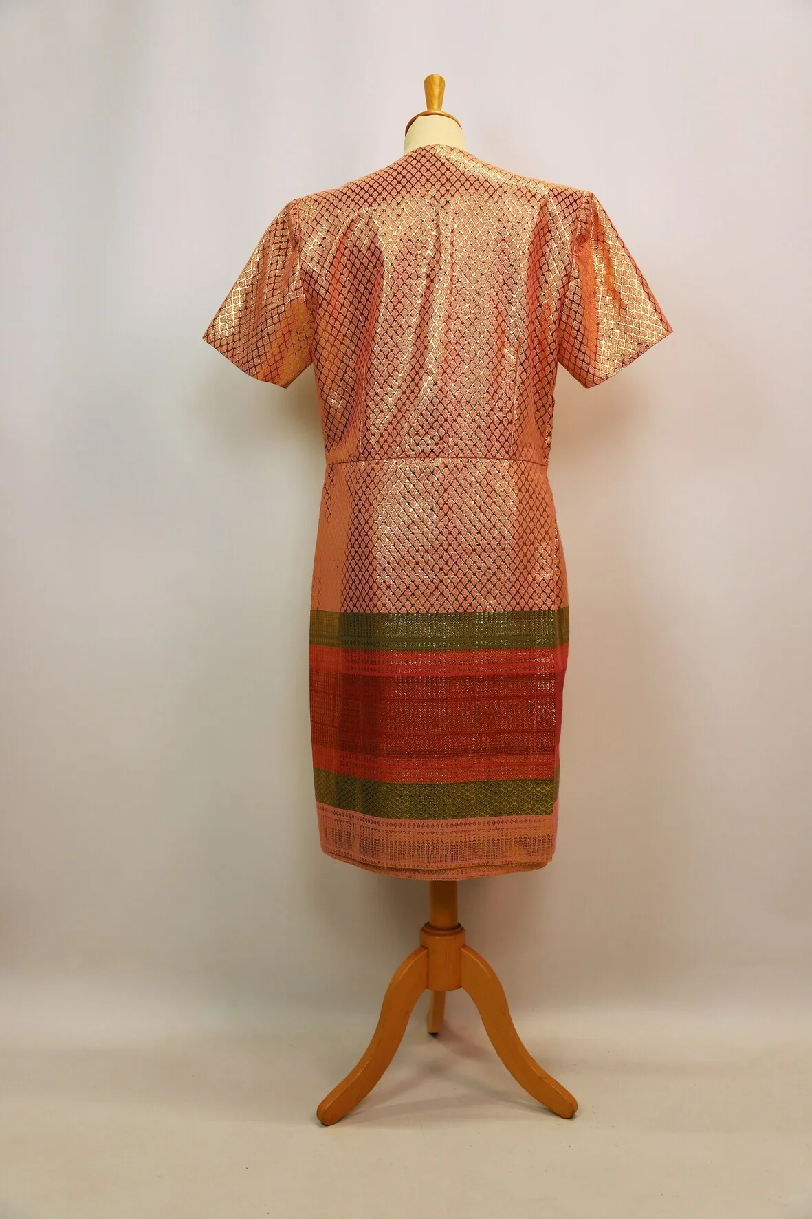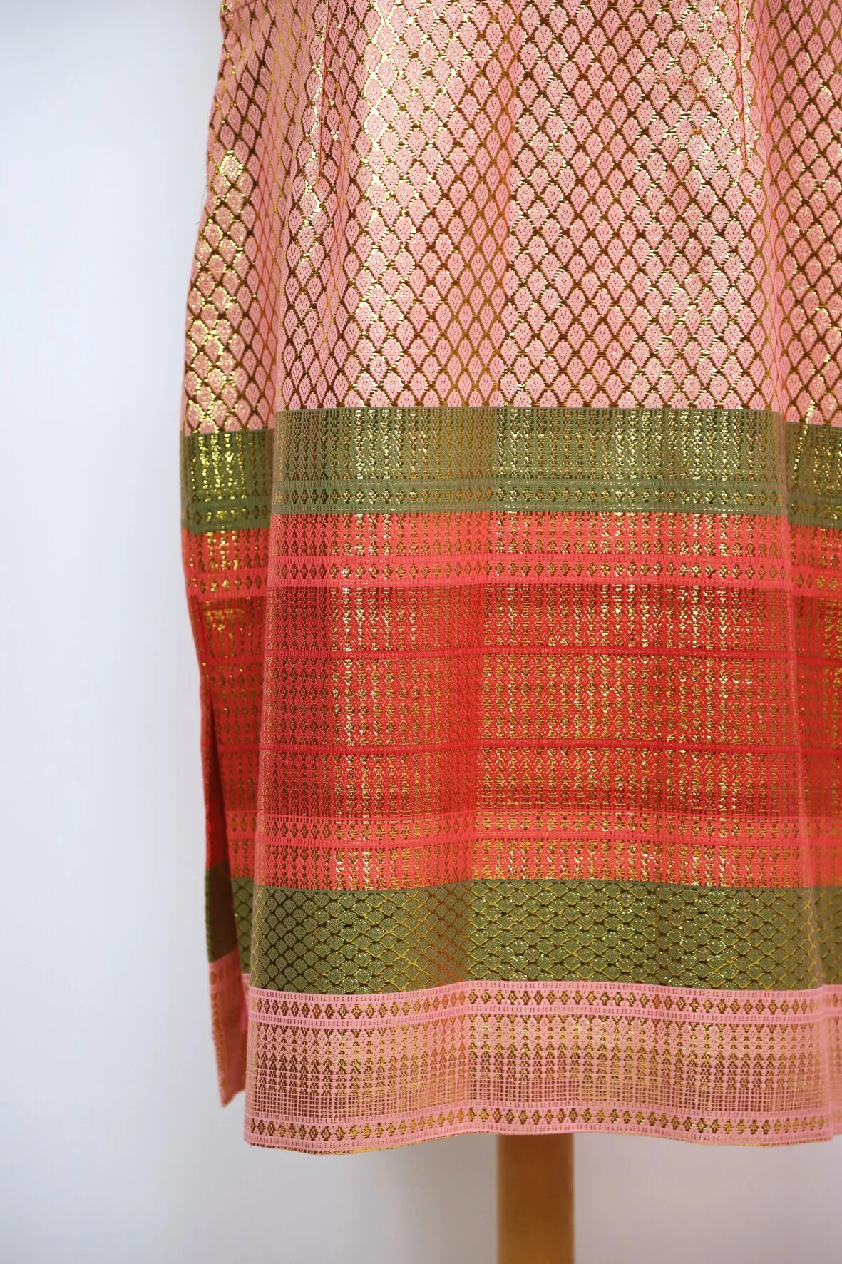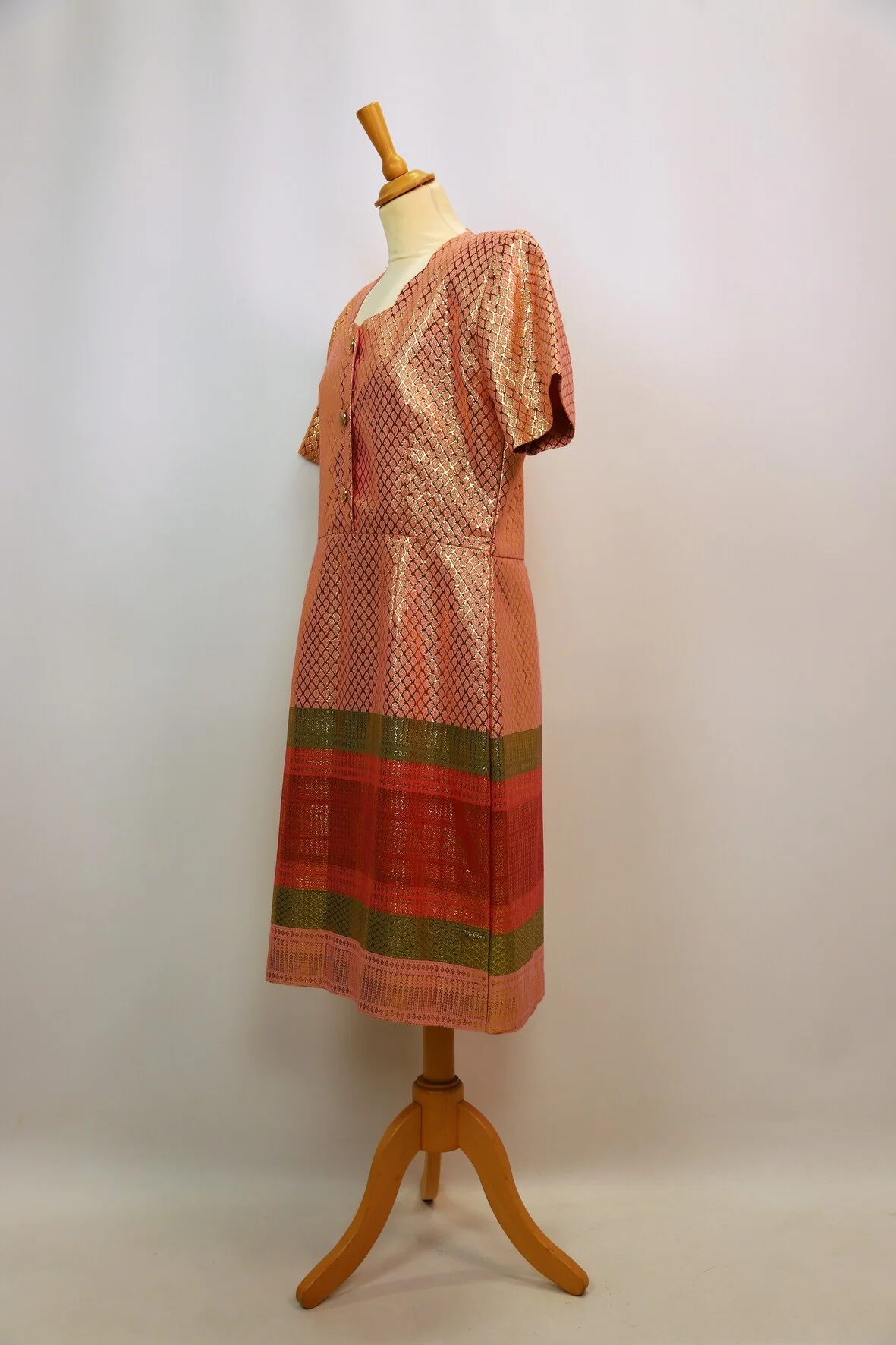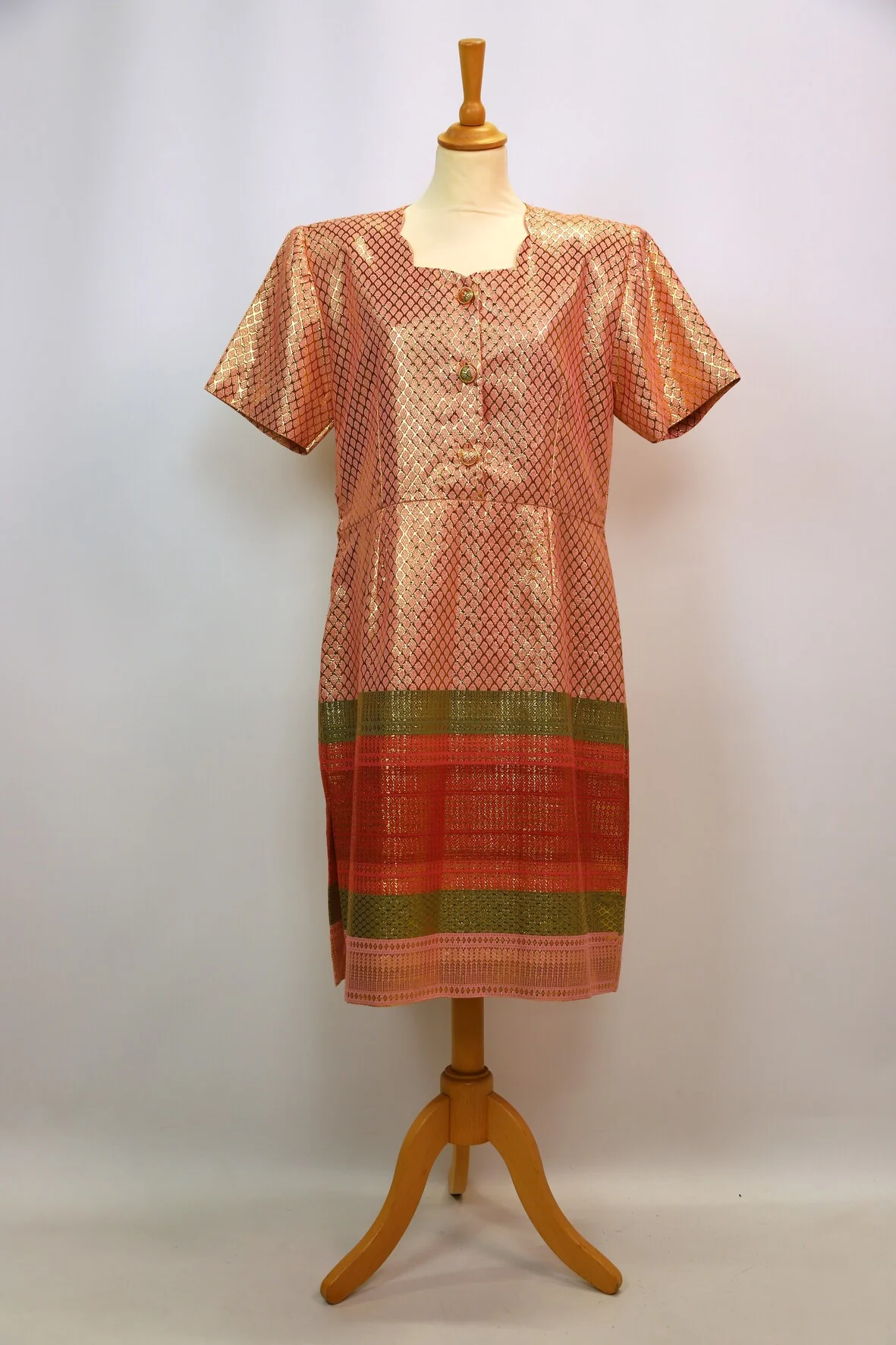 | DESCRIPTIF | Robe manches courtes avec épaulettes. Camaïeu de roses et motif doré |
