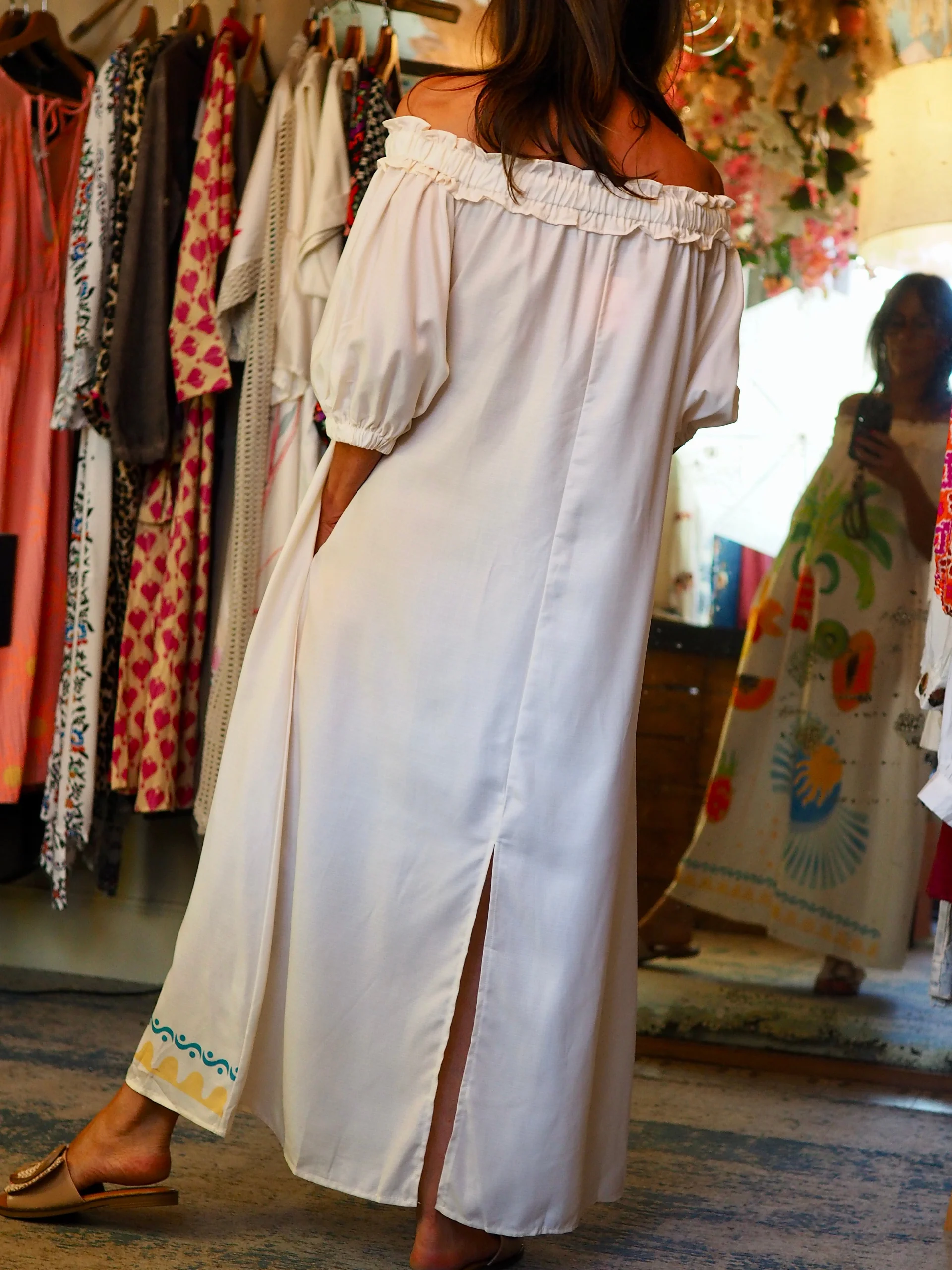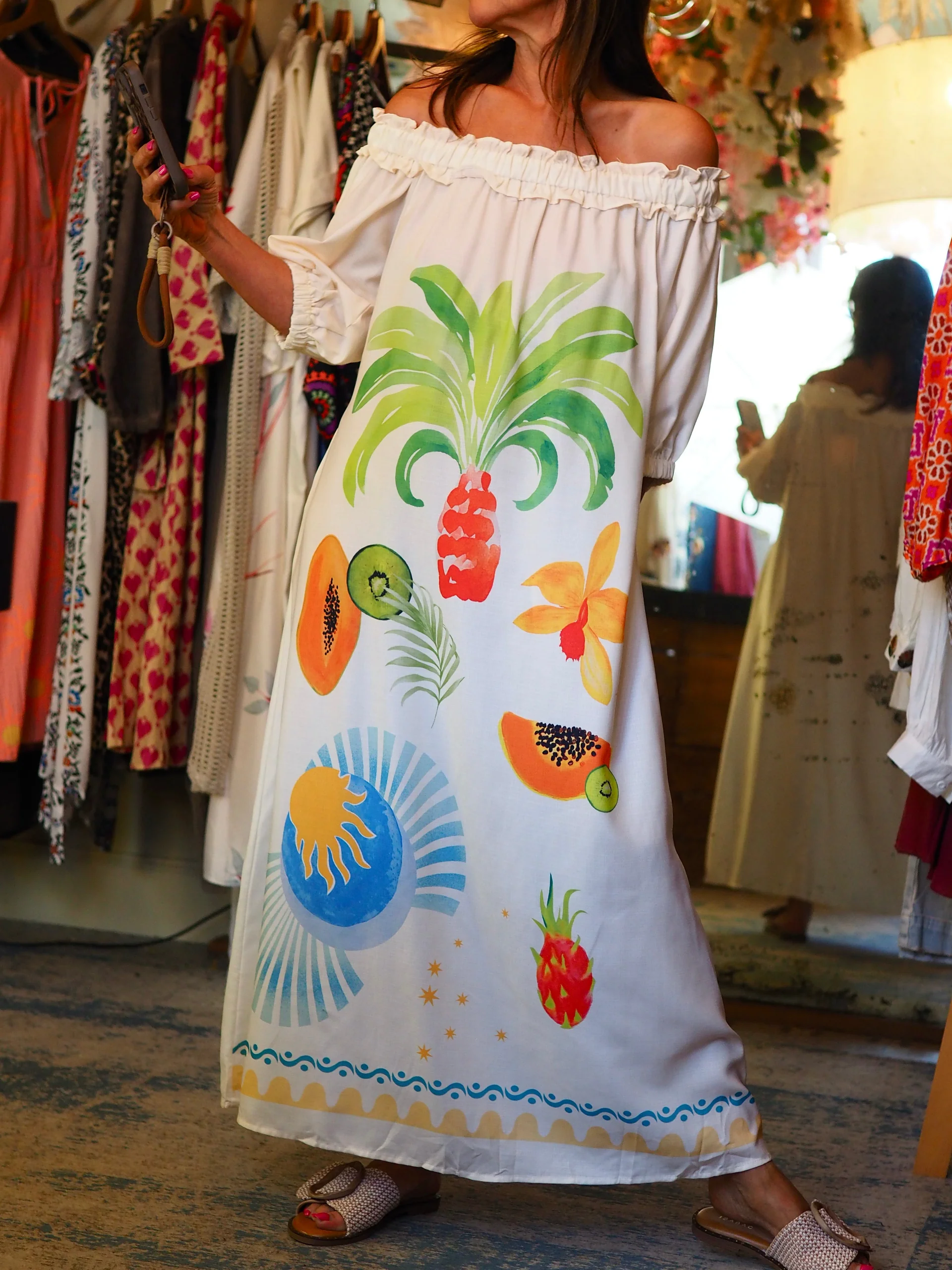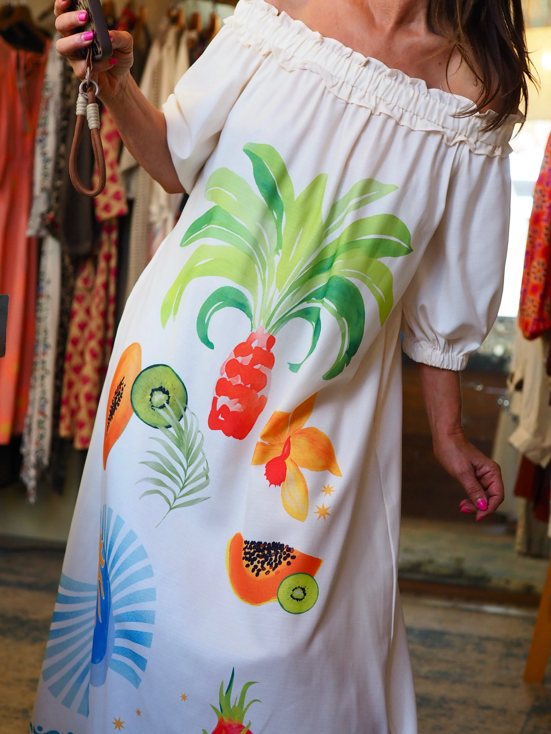 Superbe robe écru et motifs fruits. Epaules élastiques. 2 poches cotés.