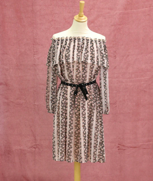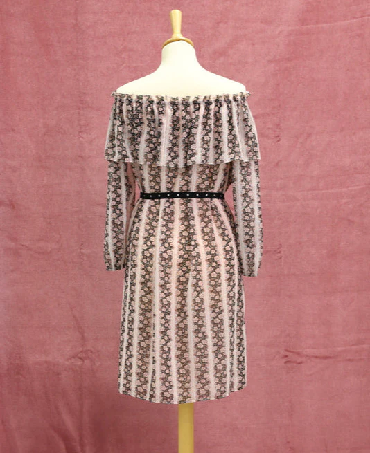 – Robe à imprimé rose et noir, ceinturée à la taille avec encolure en volant