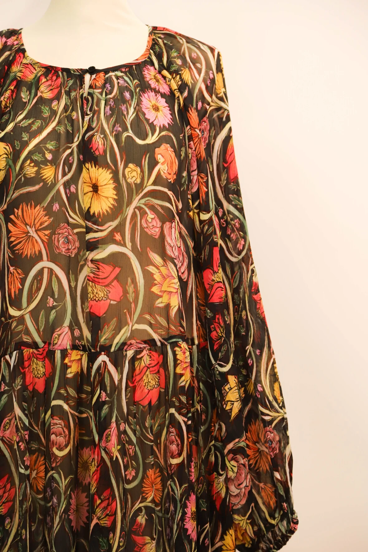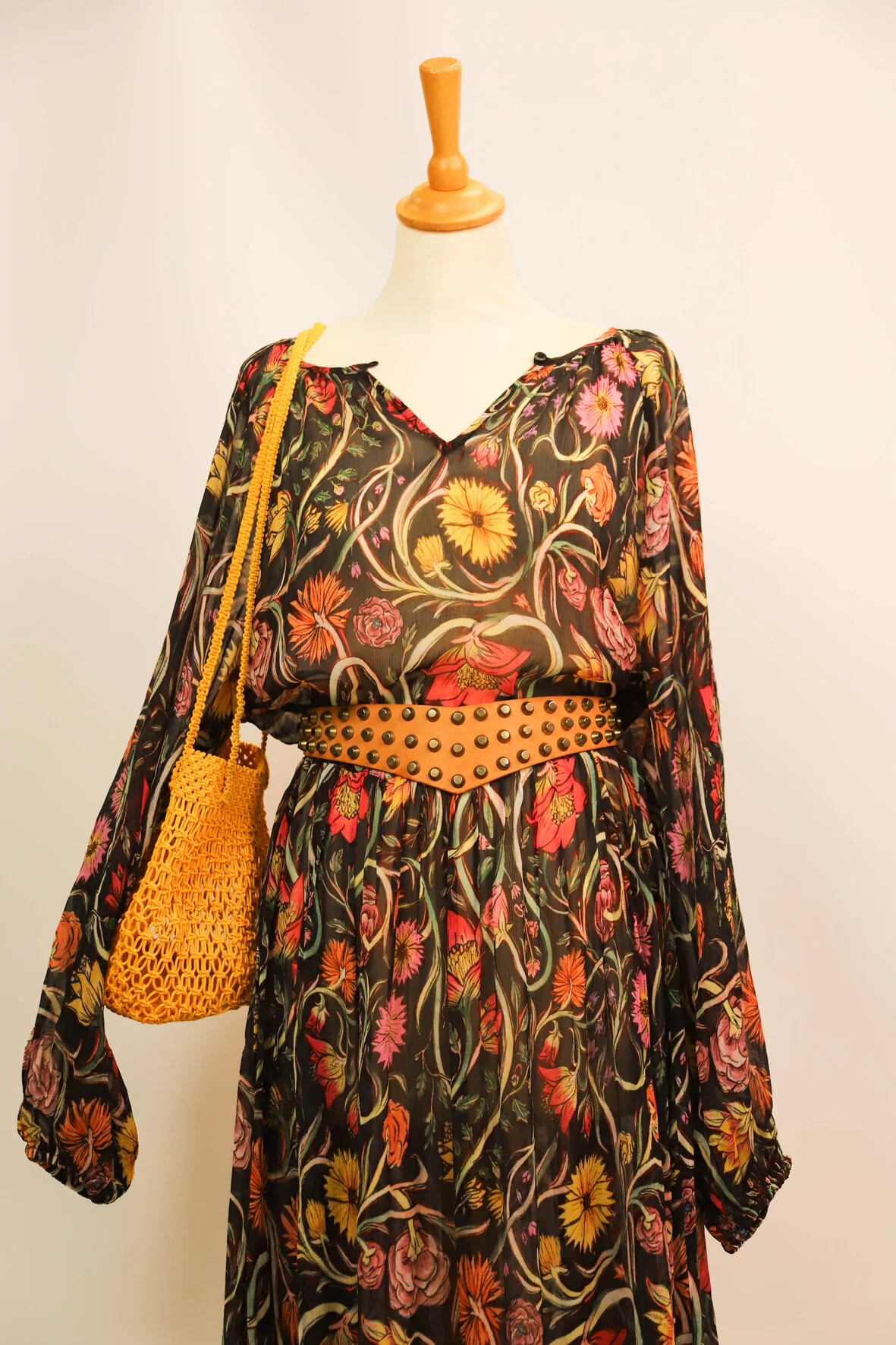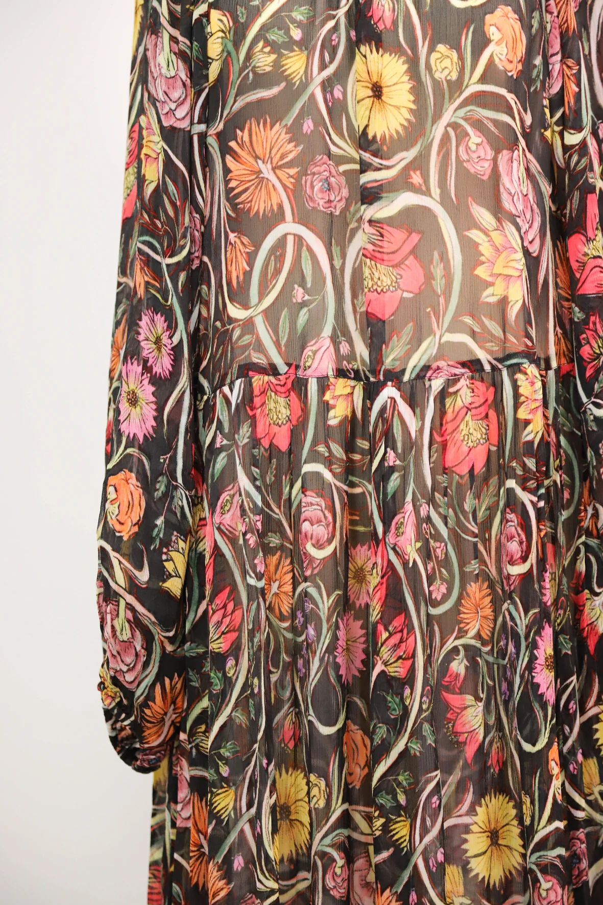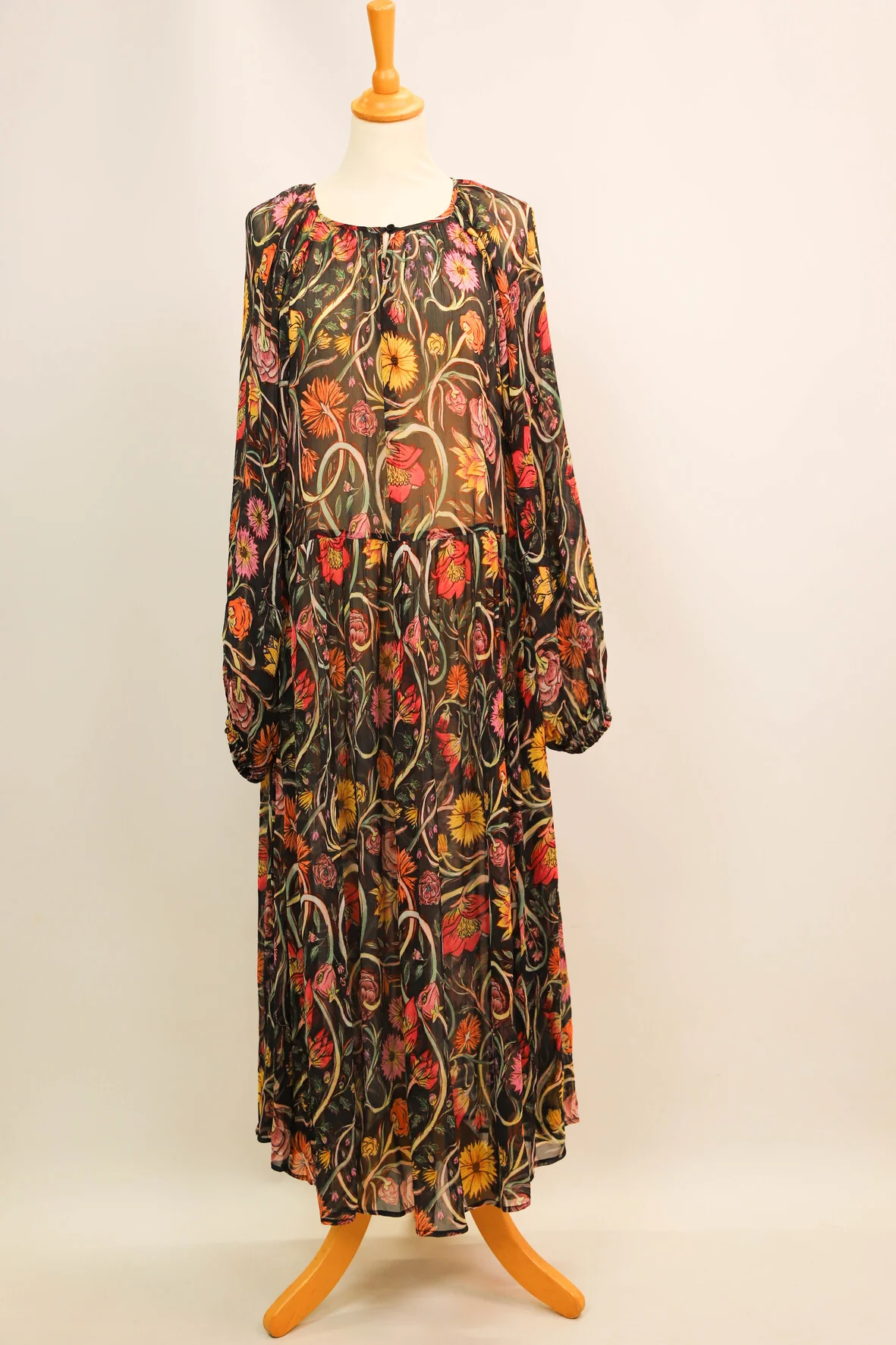 DESCRIPTIF Robe en transparence, longue avec manches longues. Motif floral sur fond noir