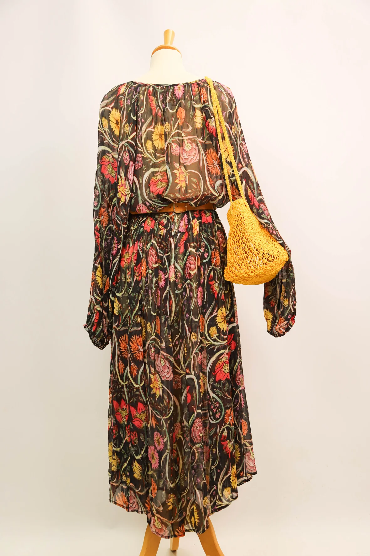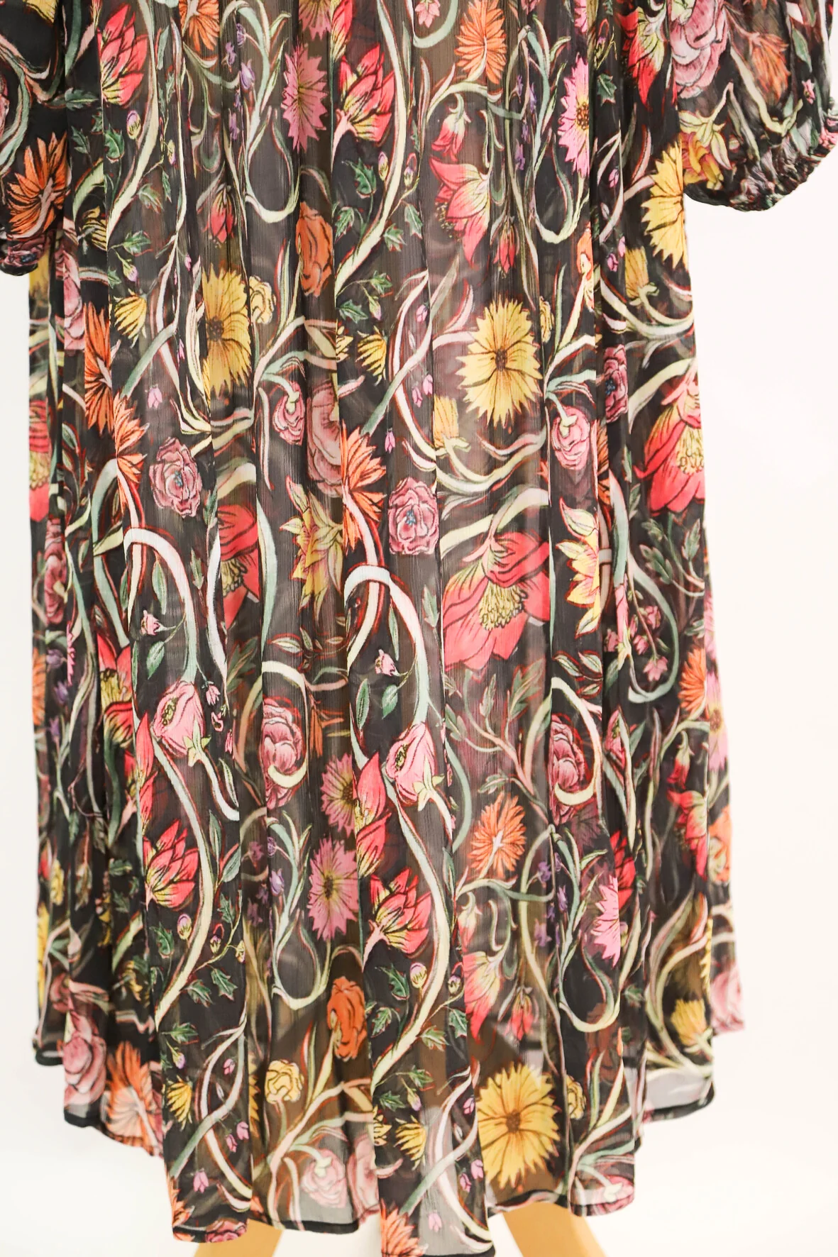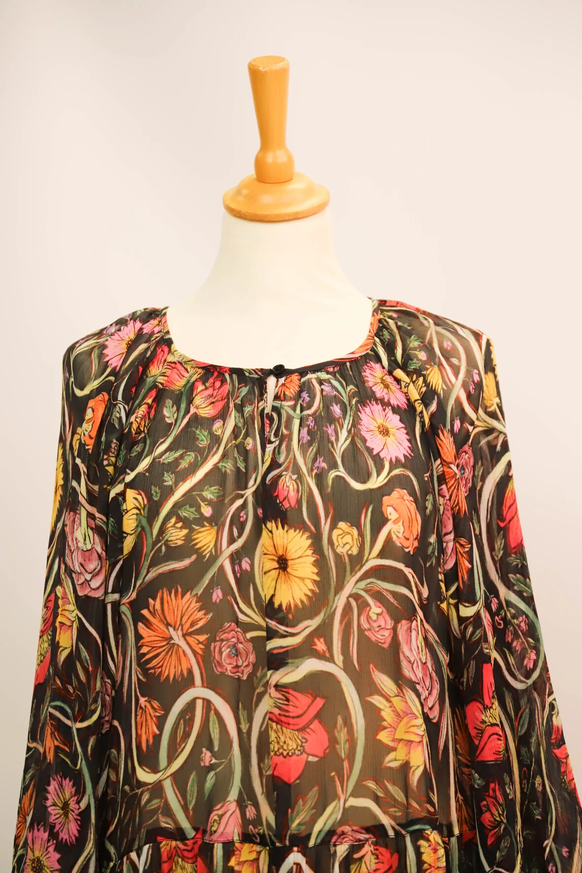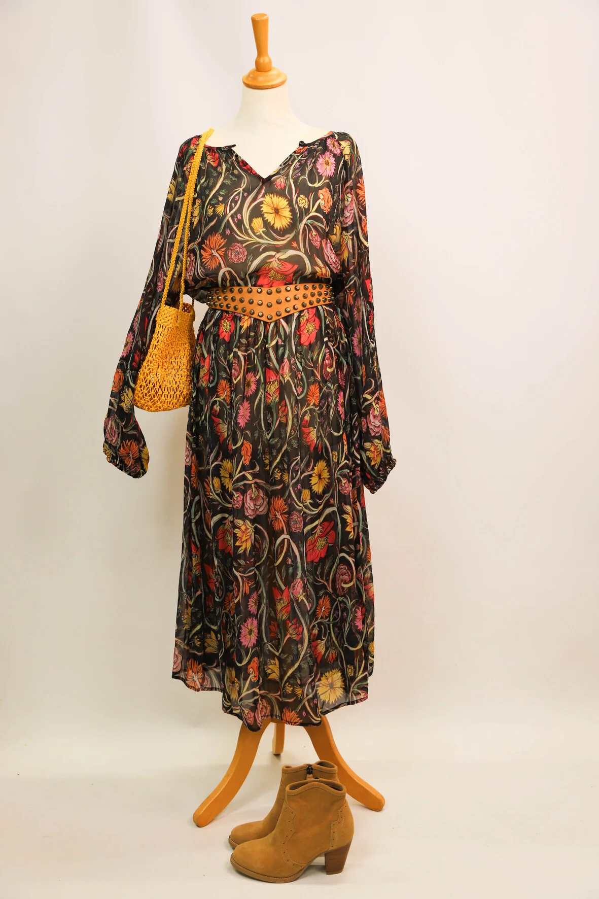 DESCRIPTIF Robe en transparence, longue avec manches longues. Motif floral sur fond noir