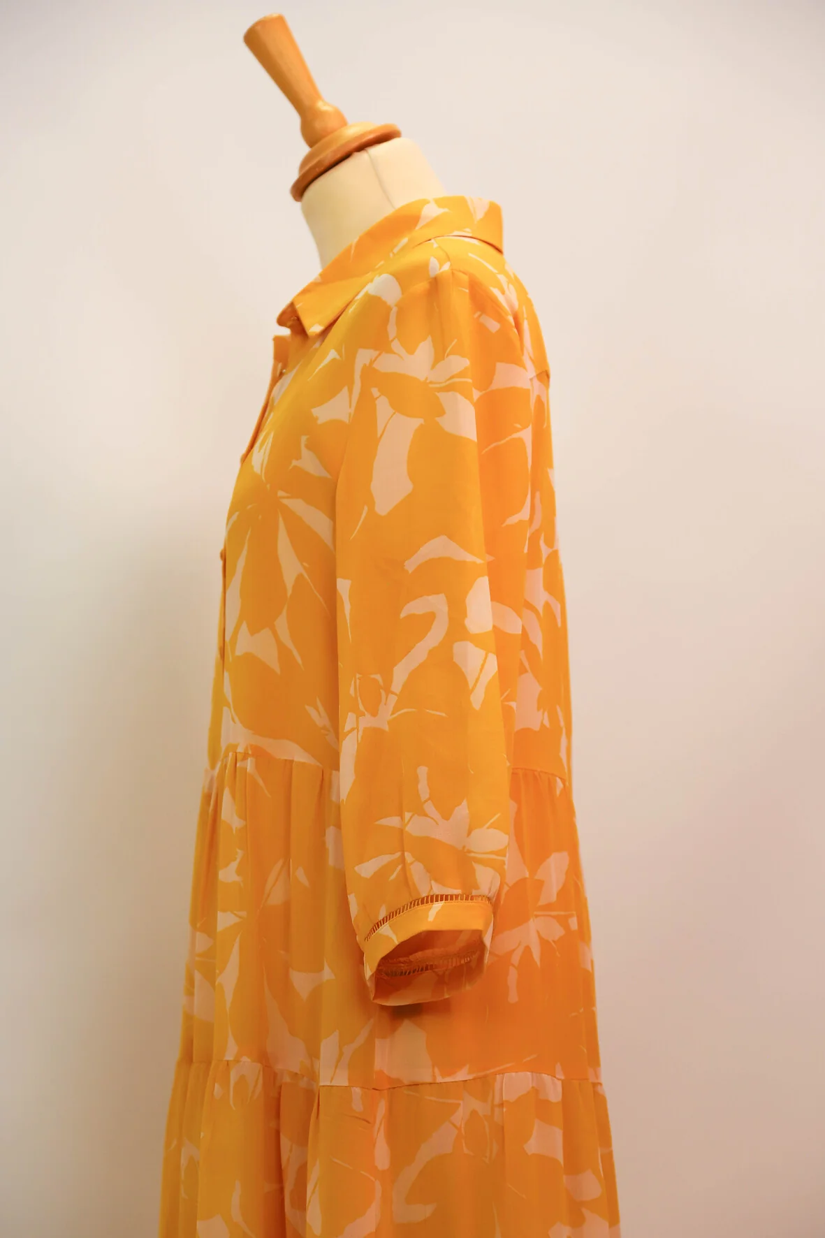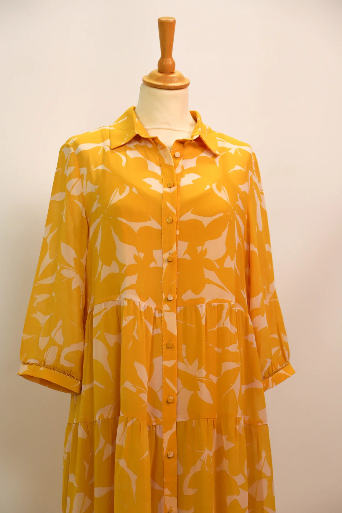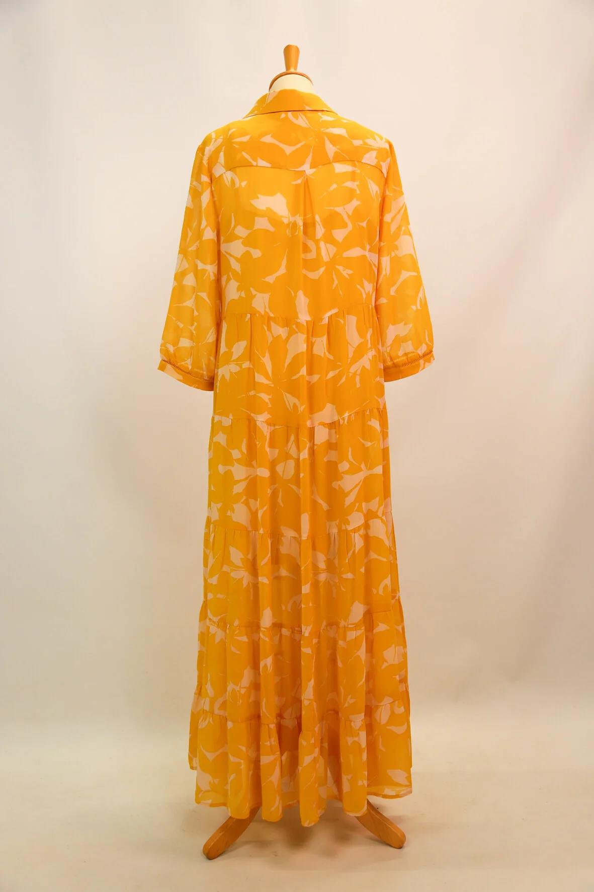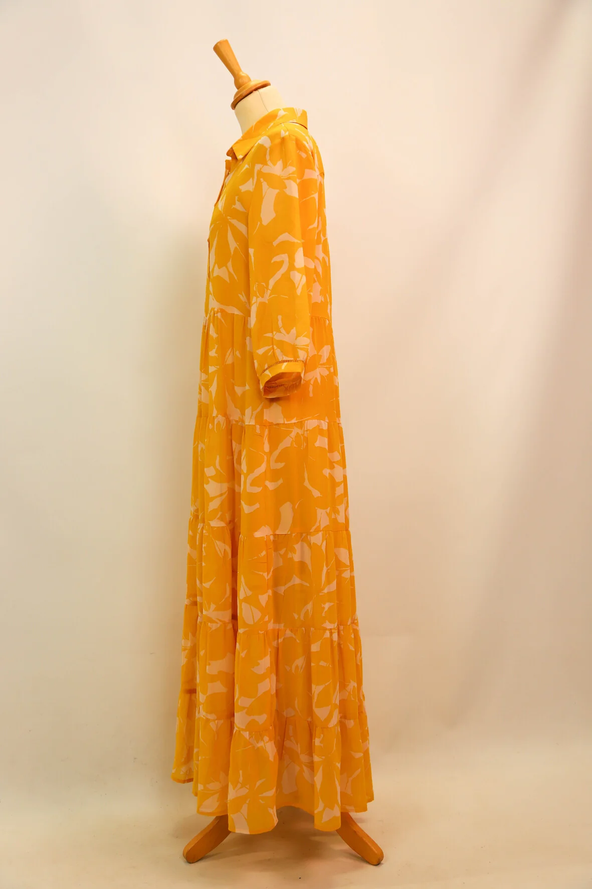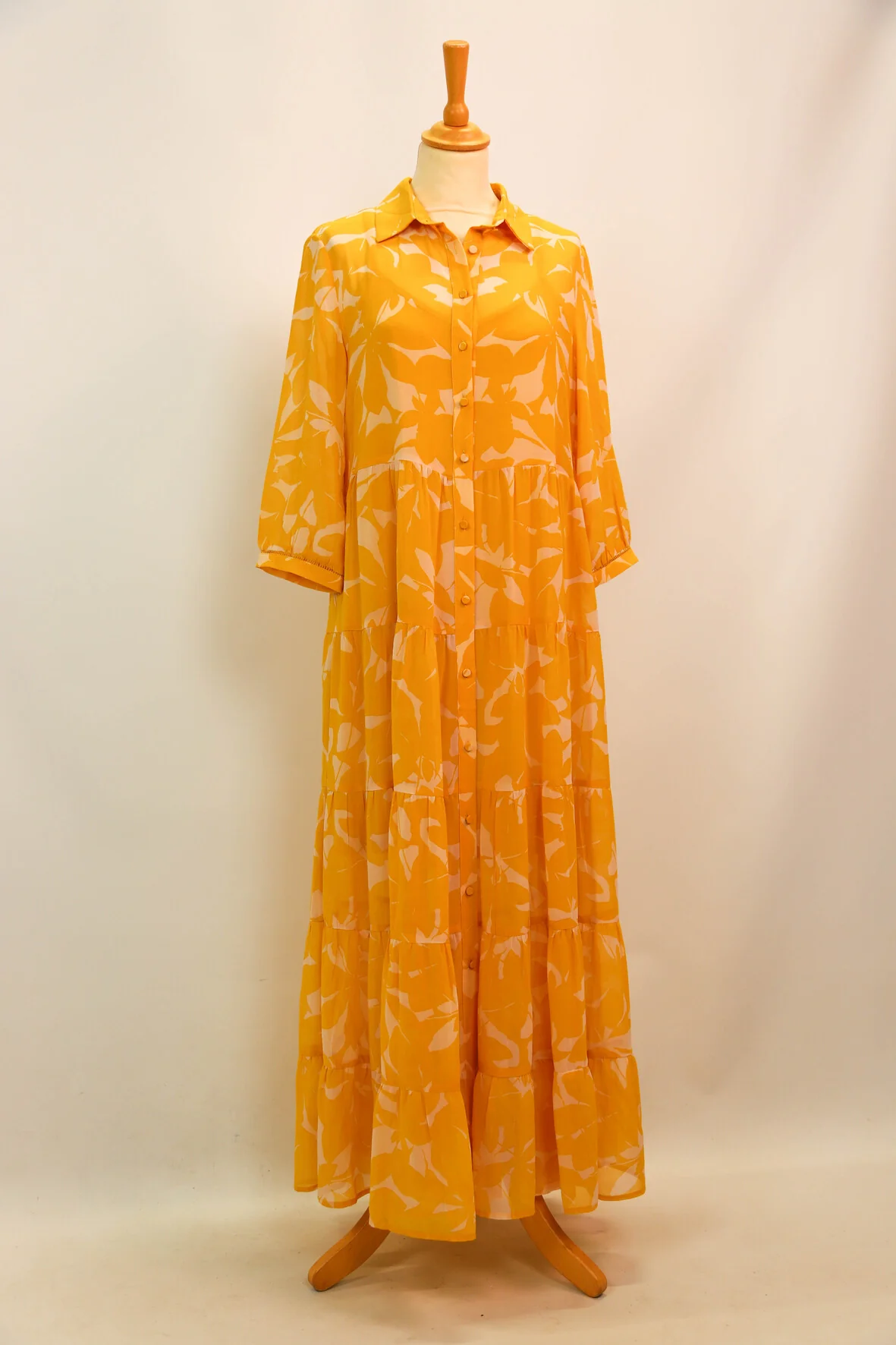 | DESCRIPTIF | Robe longue avec fermeture par boutons. motif jaune sur fond écru |